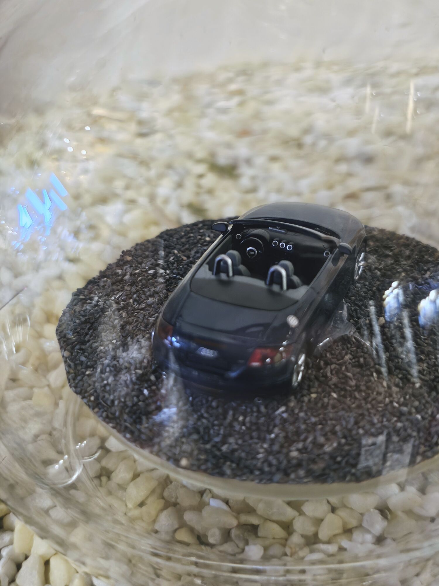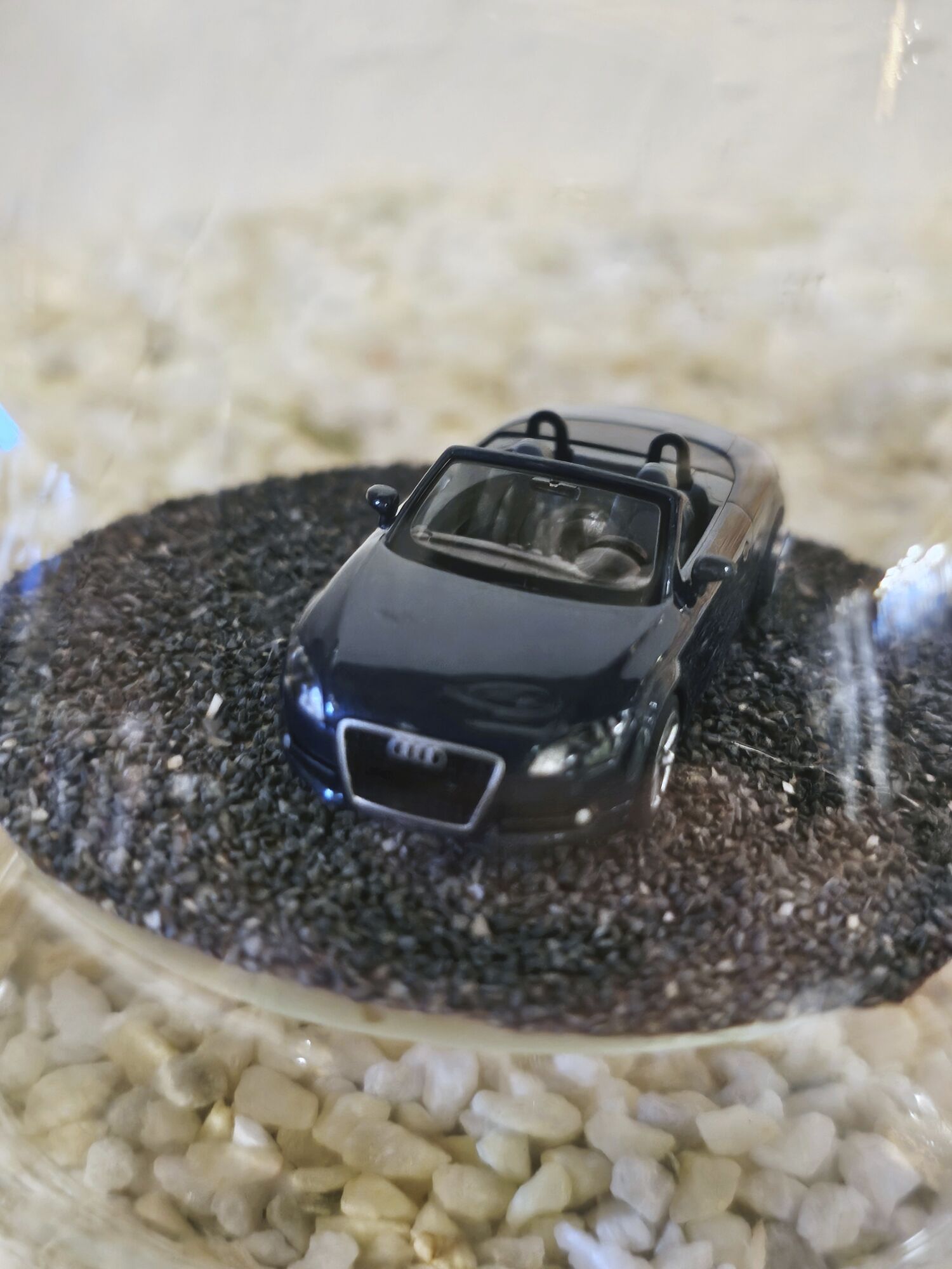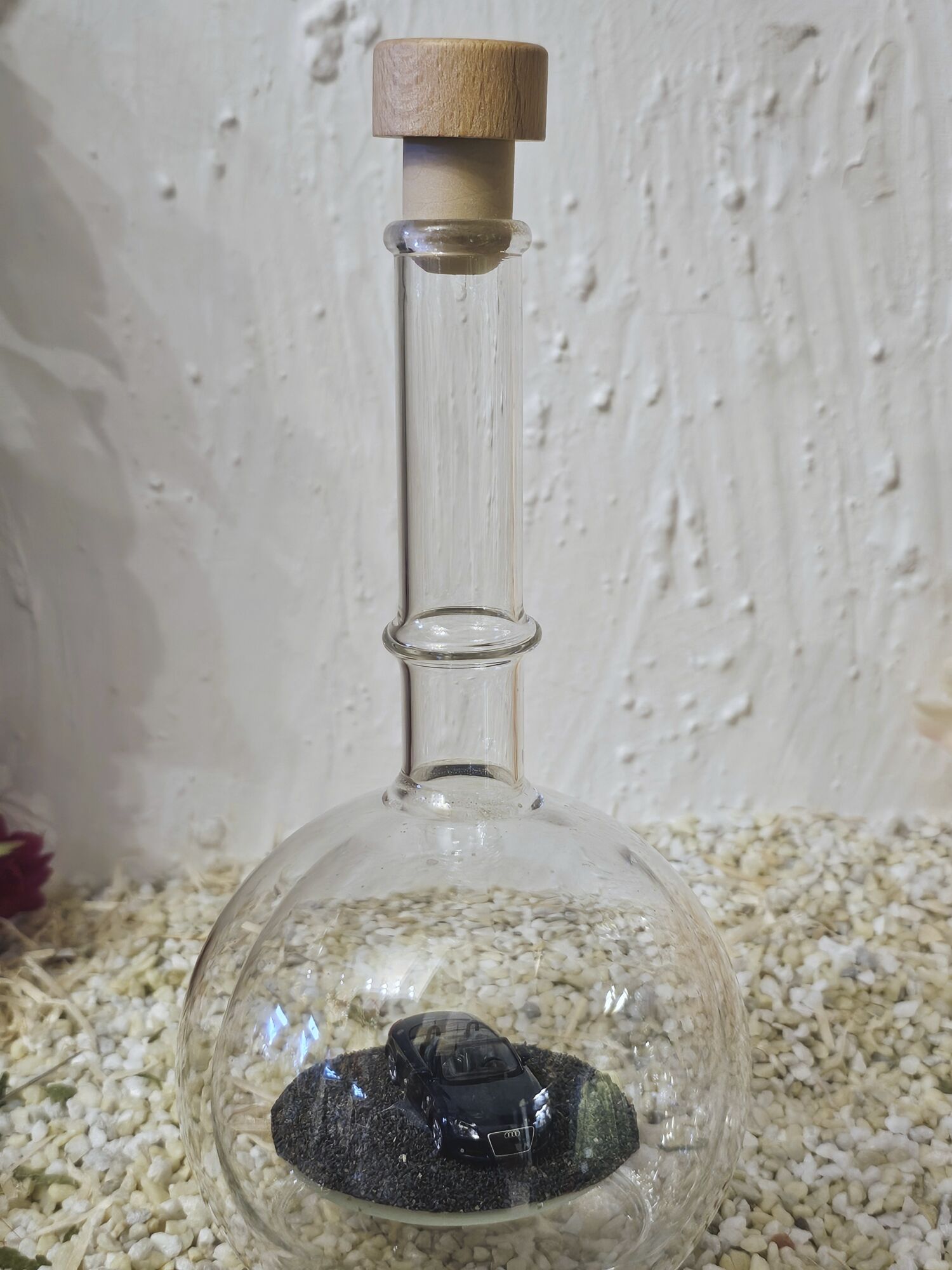 Hier zeigen wir Ihnen eine edle gefertigte, mundgeblasene Glasflasche mit einem Fahrzeug-Modell 1:87 Audi A6 Cabrio schwarz