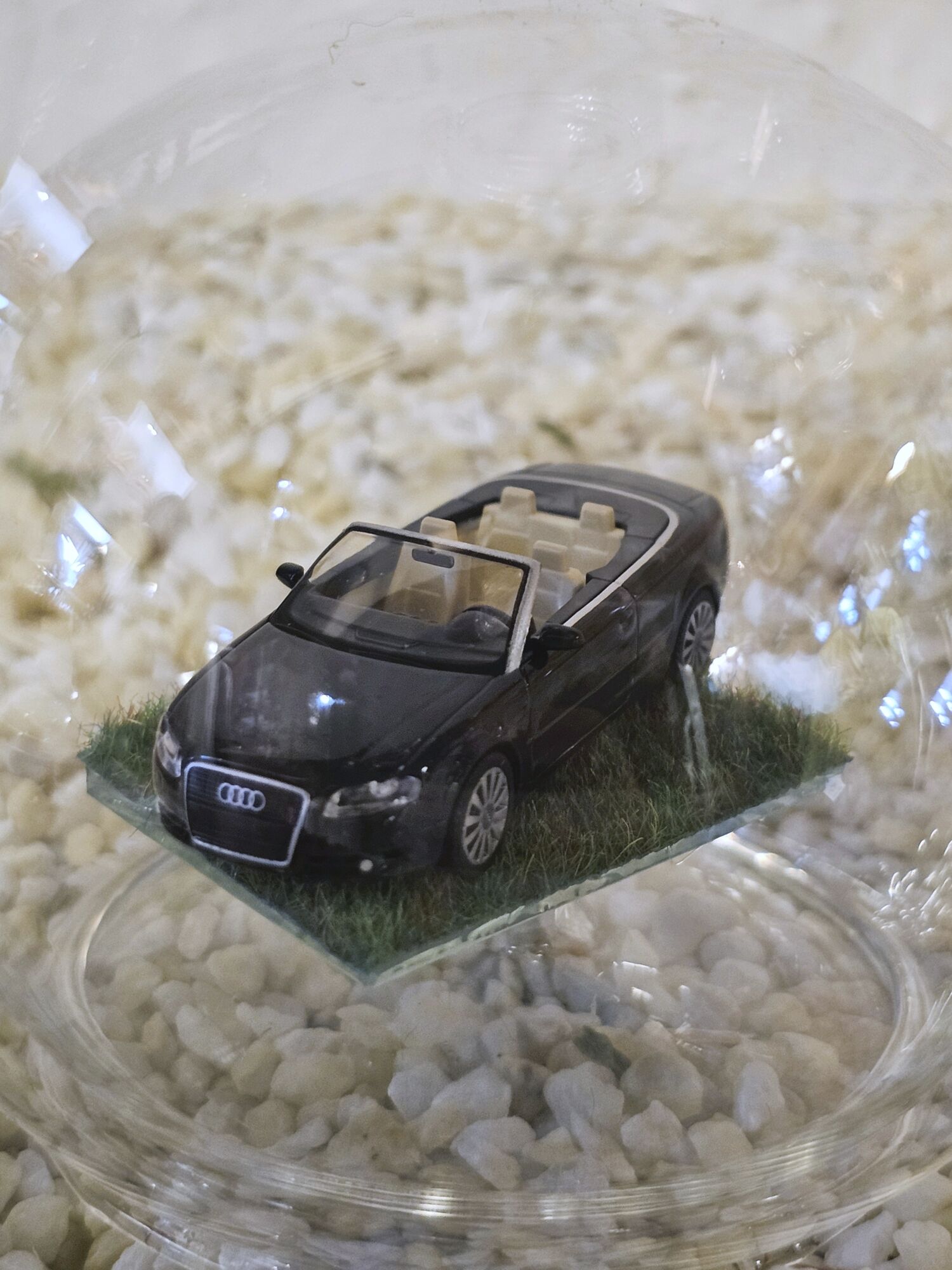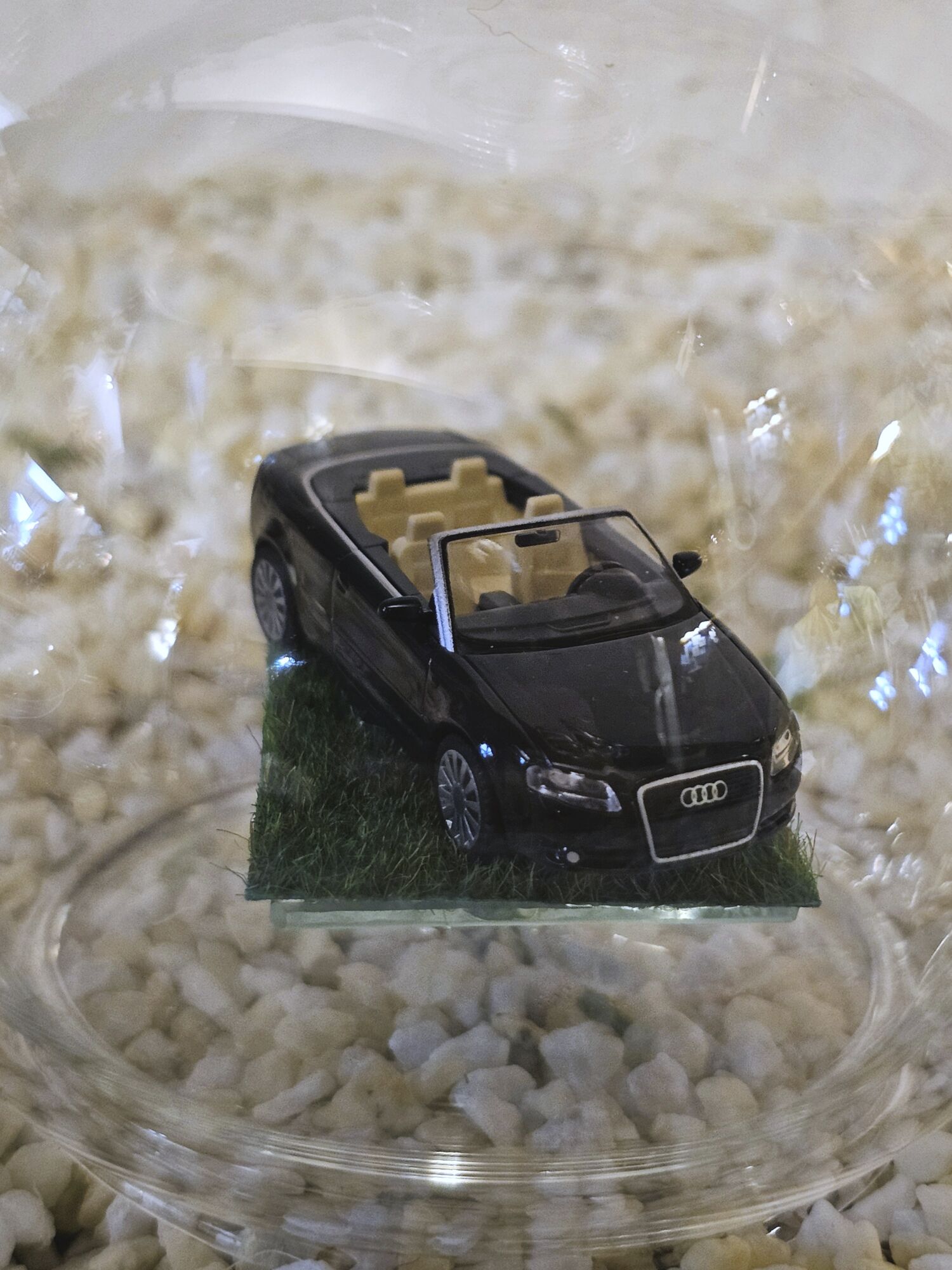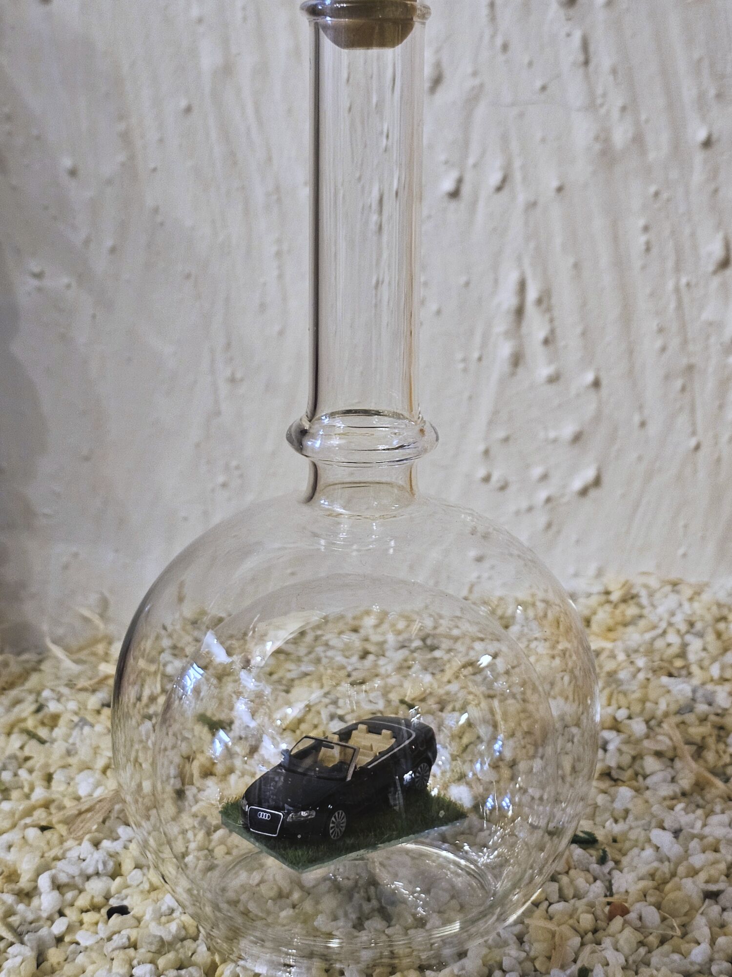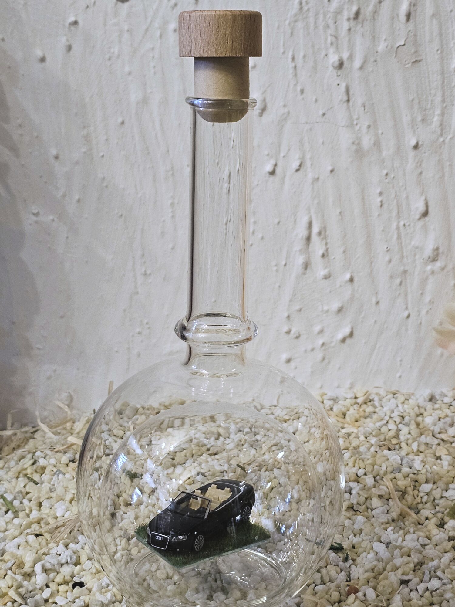 Hier zeigen wir Ihnen eine edle gefertigte, mundgeblasene Glasflasche mit einem Fahrzeug-Modell 1:87