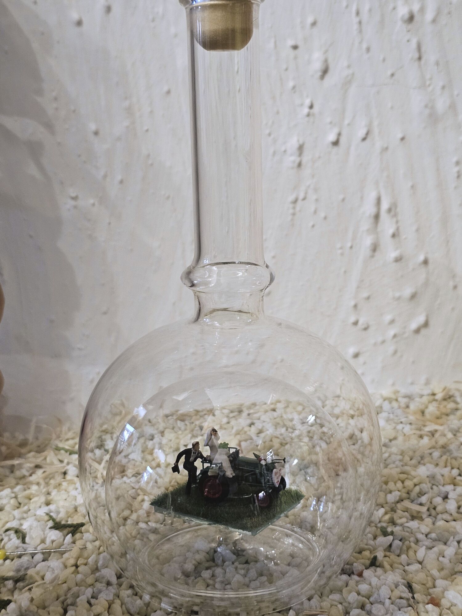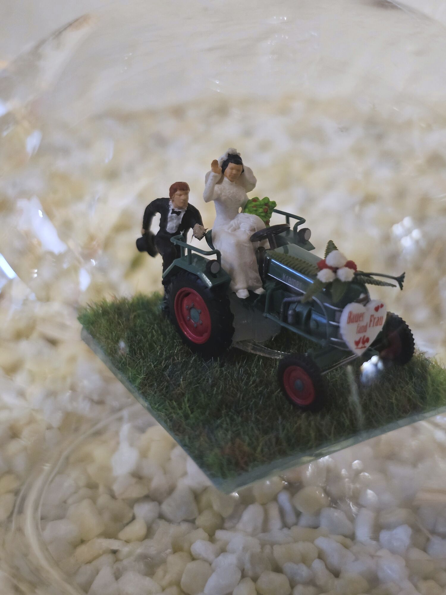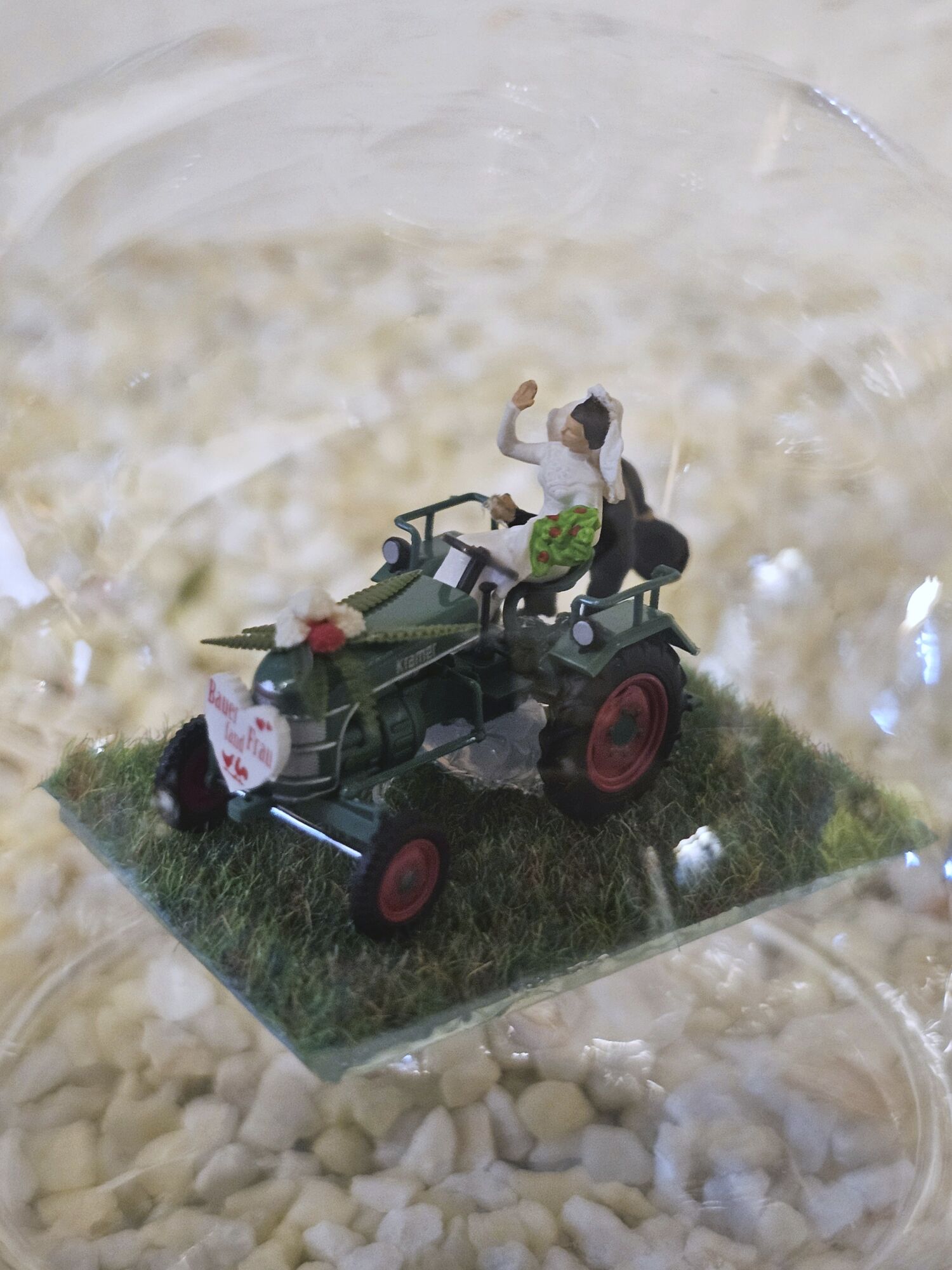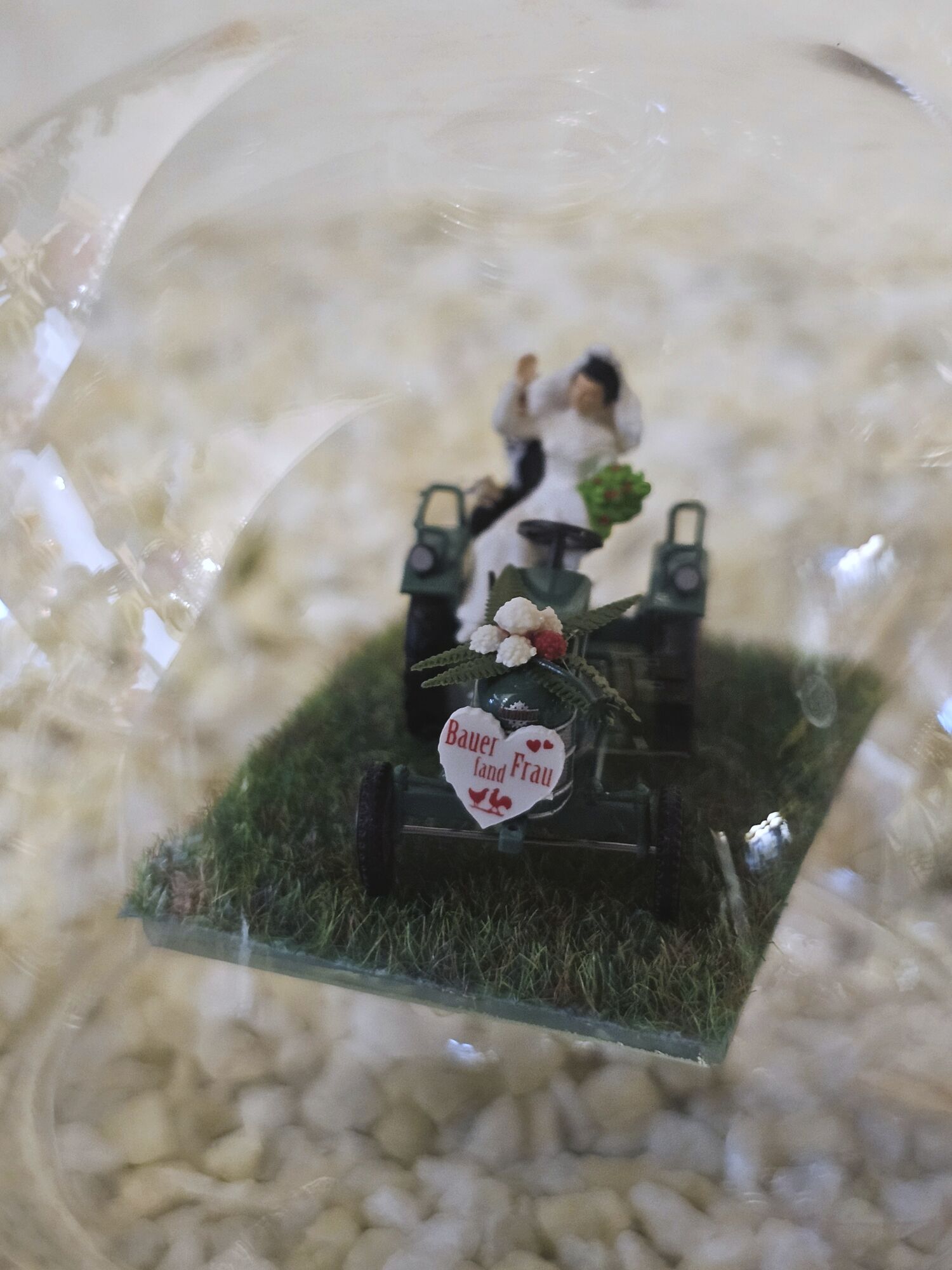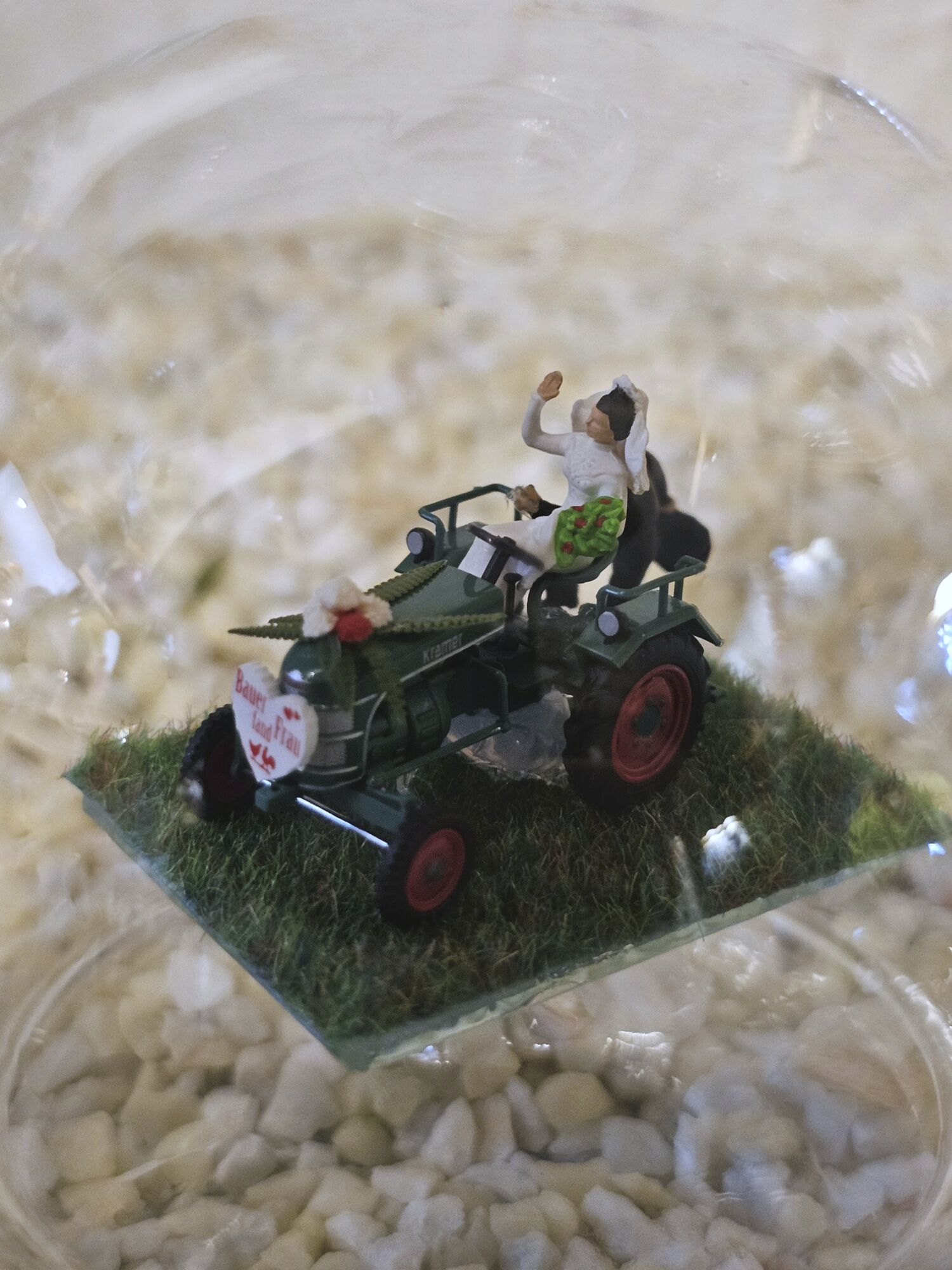 Hier zeigen wir Ihnen eine edle gefertigte, mundgeblasene Glasflasche mit Blumengeschmücktem Traktor, Hochzeitspaar und Herz mit Aufschrift: