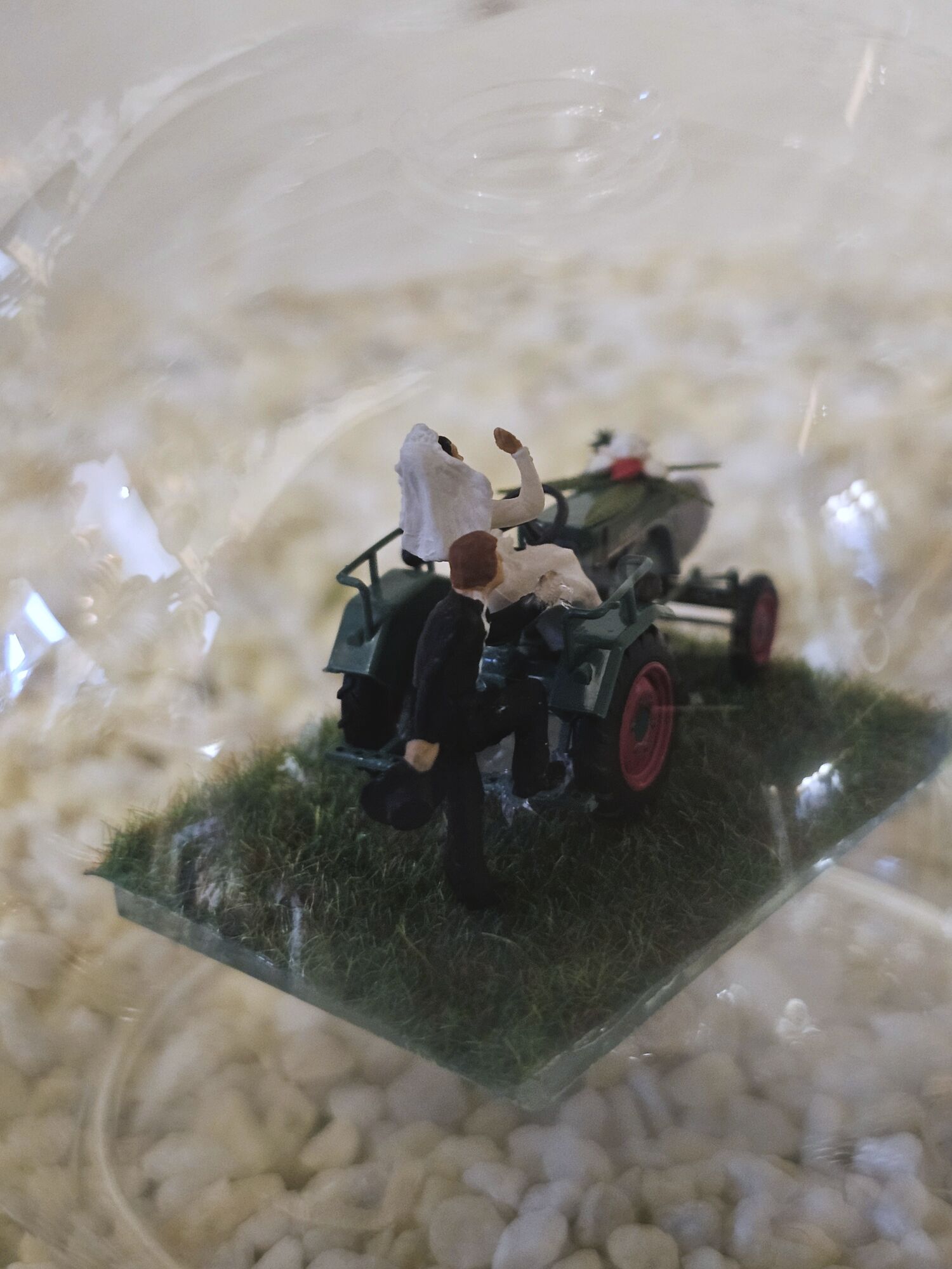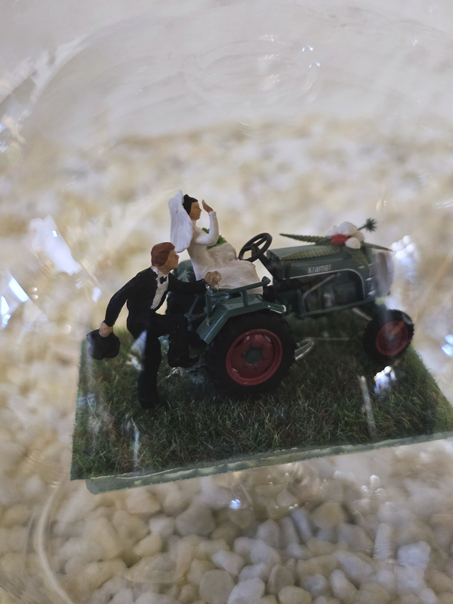 Das Fahrzeug und die Figuren befinden sich in einer Luftblase und der leckere Schnaps oder Likör fließt um das Fahrzeug herum.