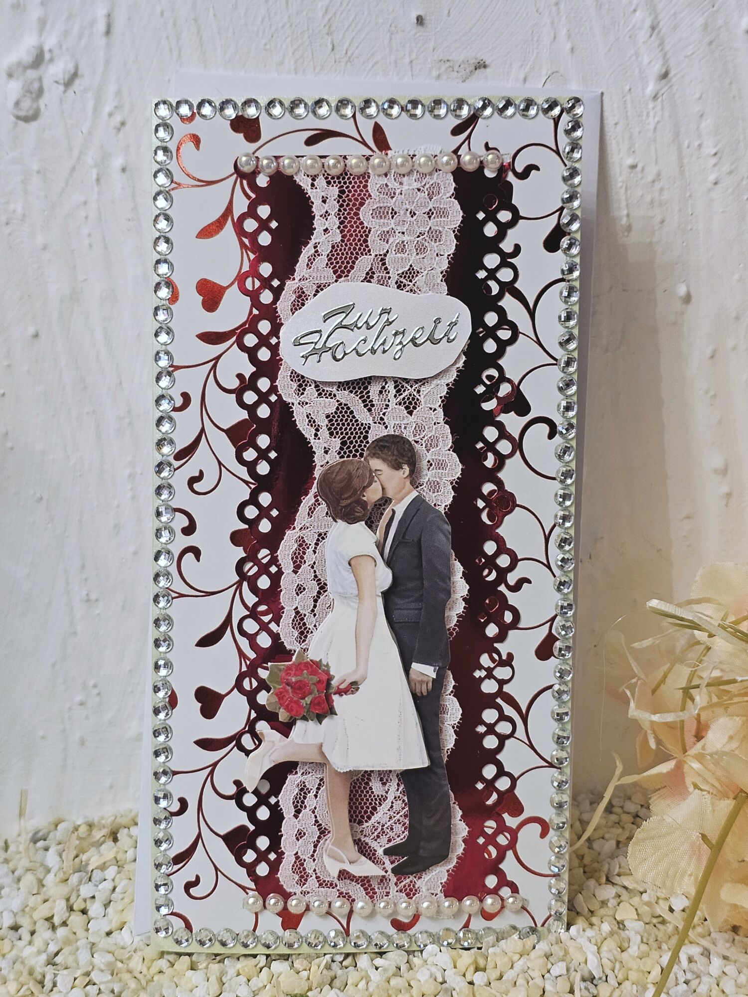 Hier zeigen wir Ihnen edle handgefertigte Designerkarten mit 3D Motiv und edlen Schmuckperlen