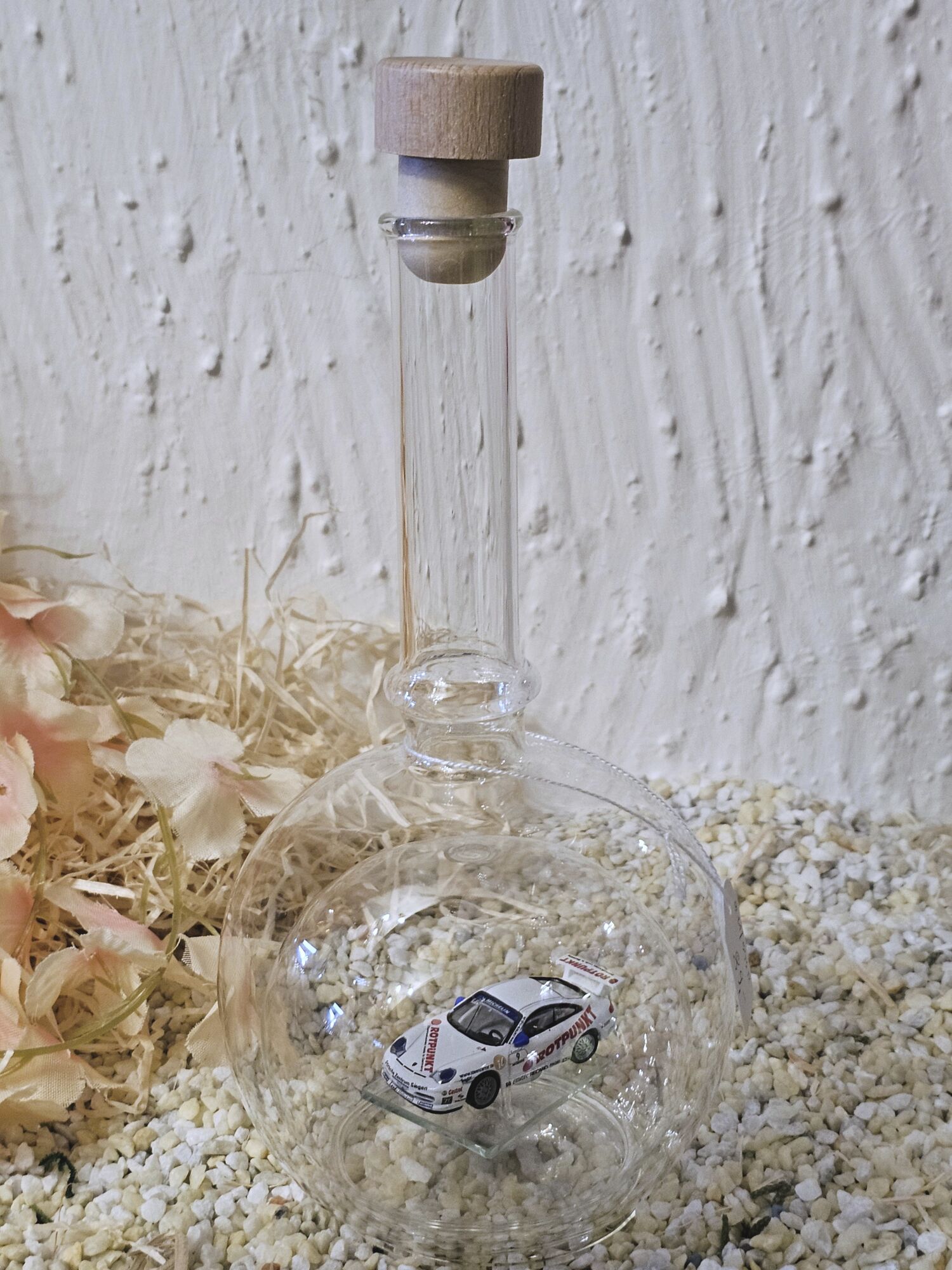 Hier zeigen wir Ihnen eine edle gefertigte, mundgeblasene Glasflasche mit einem Fahrzeug-Modell der Firma Herpa