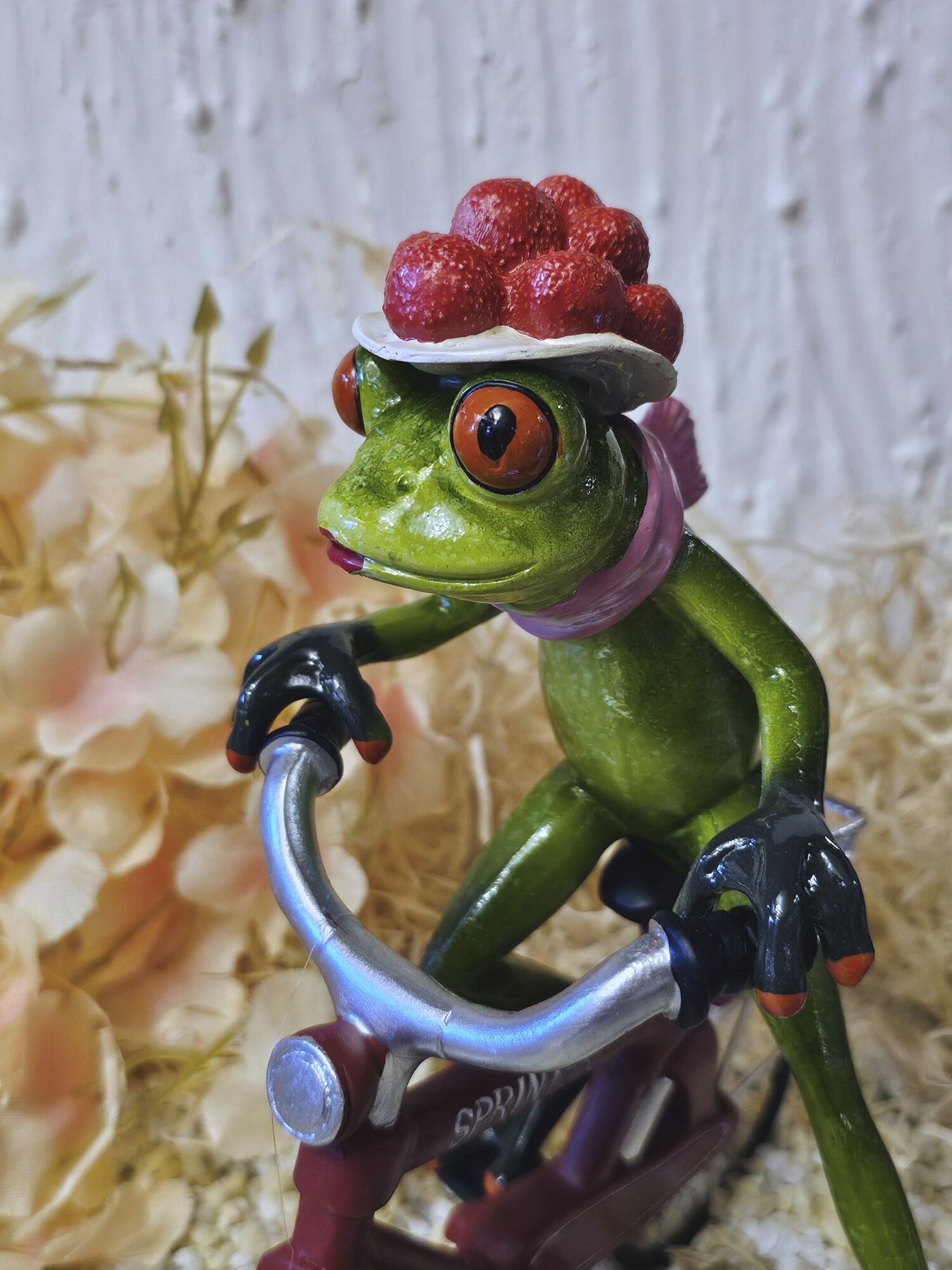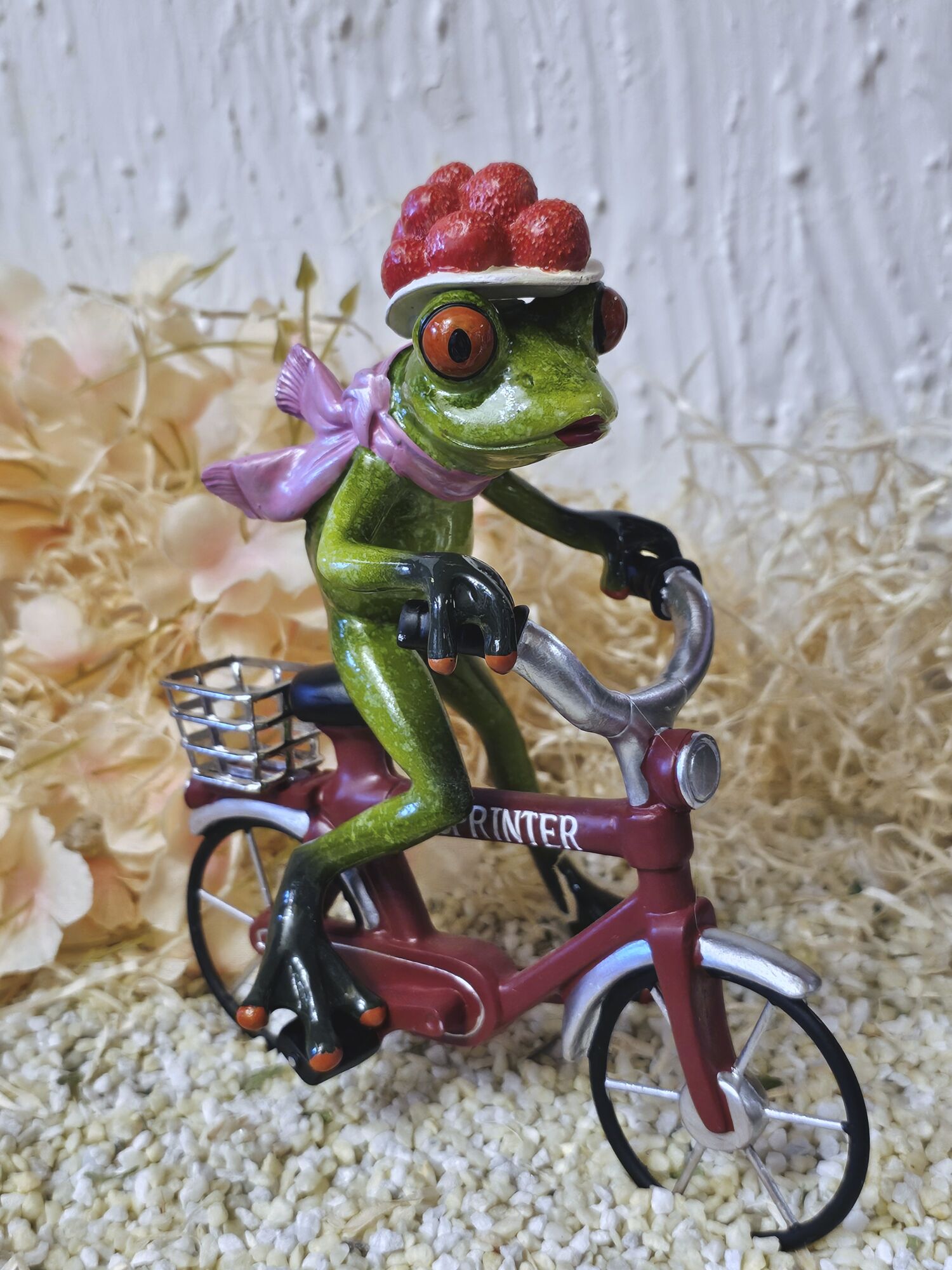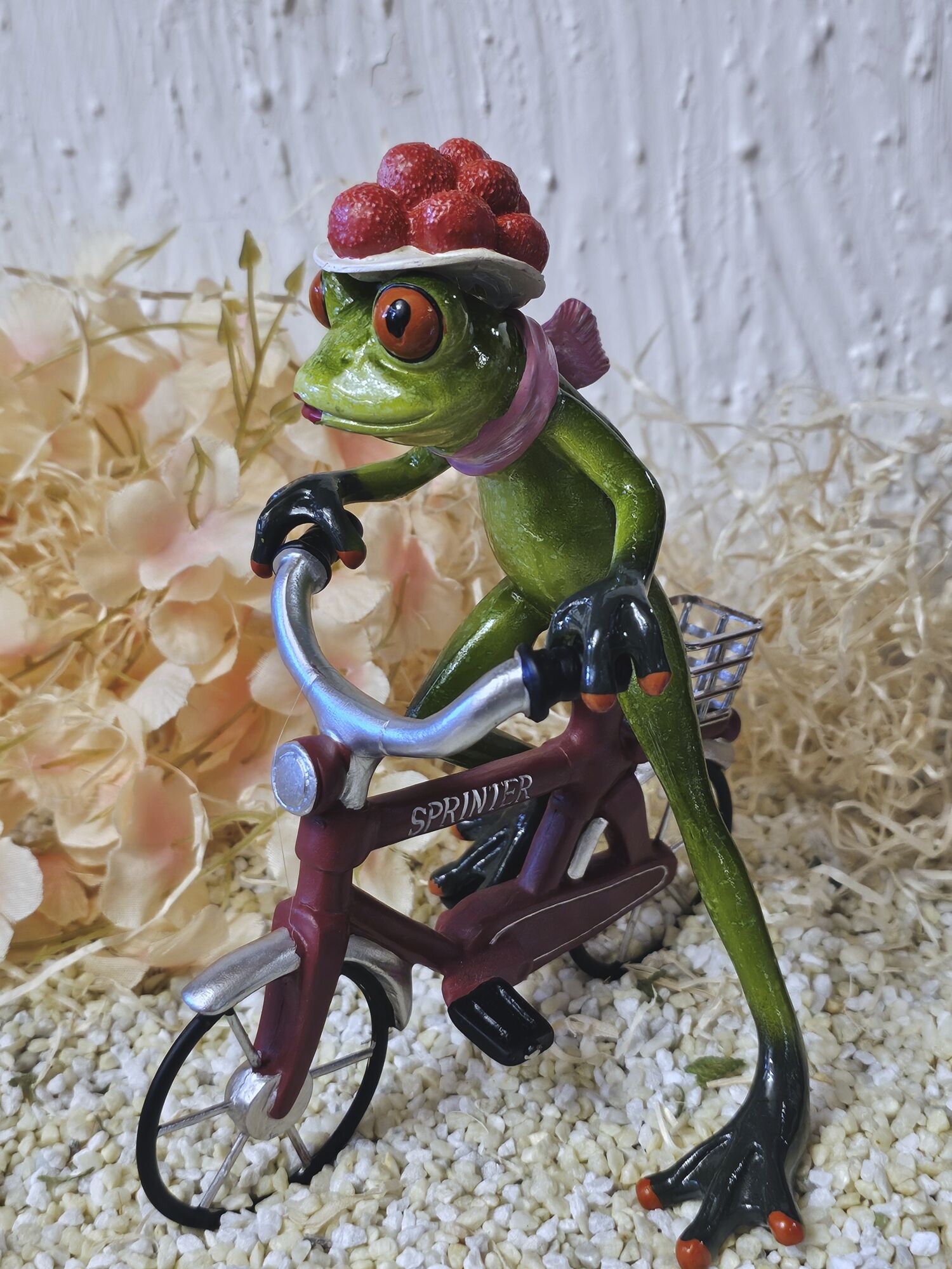Glücksfrosch Fahrradfahrer mit rotem Fahrrad und großem Bollenhut