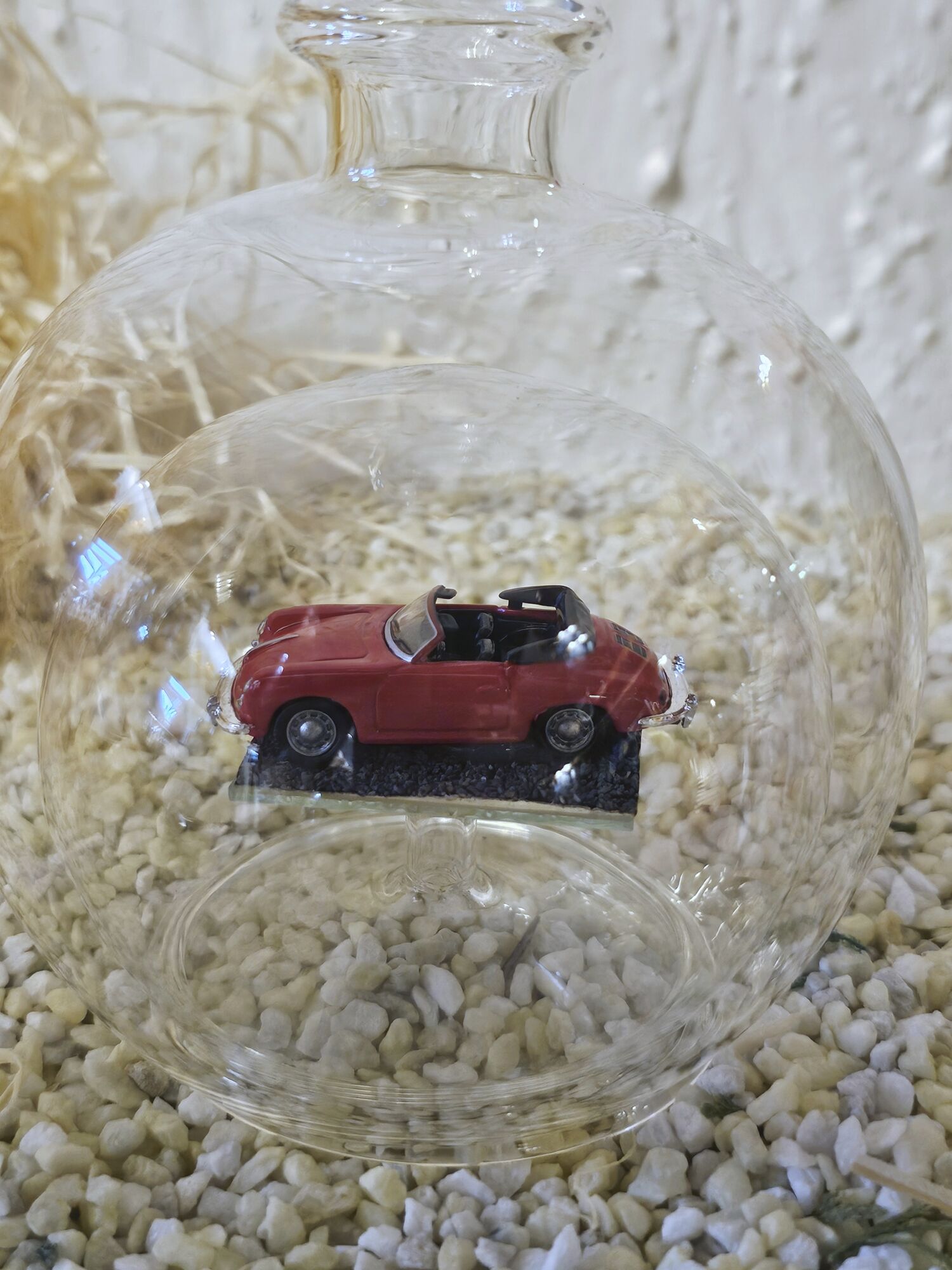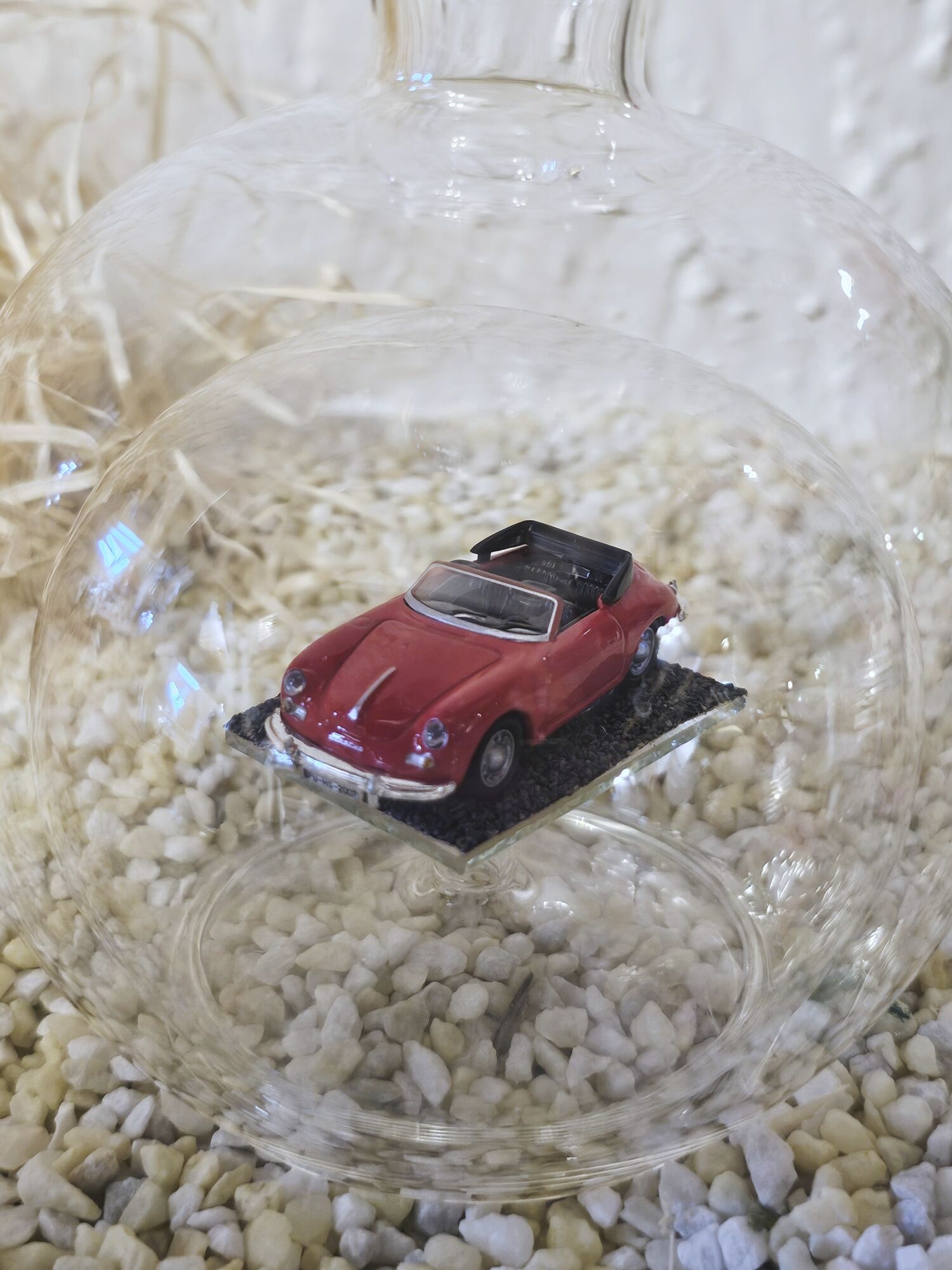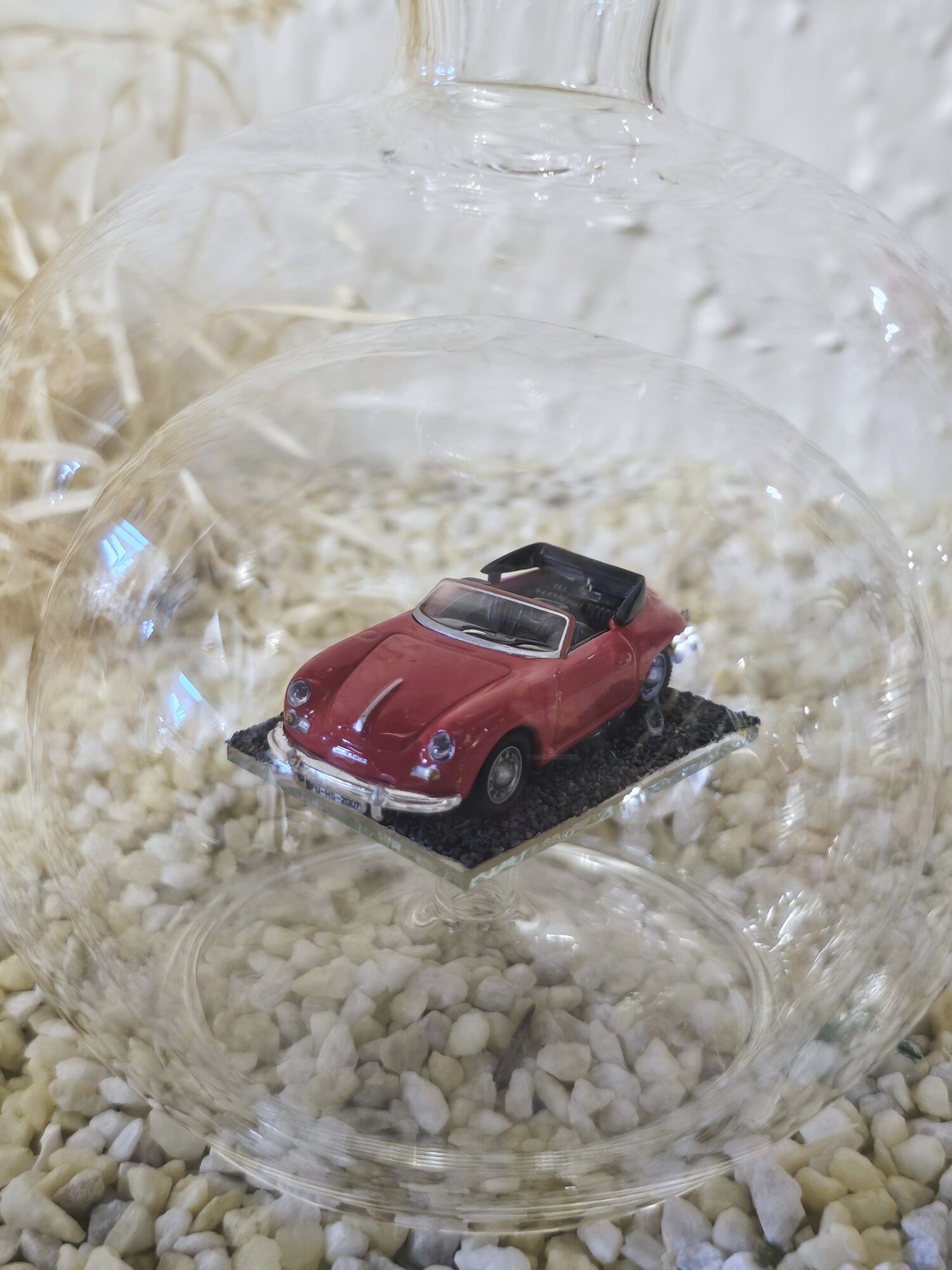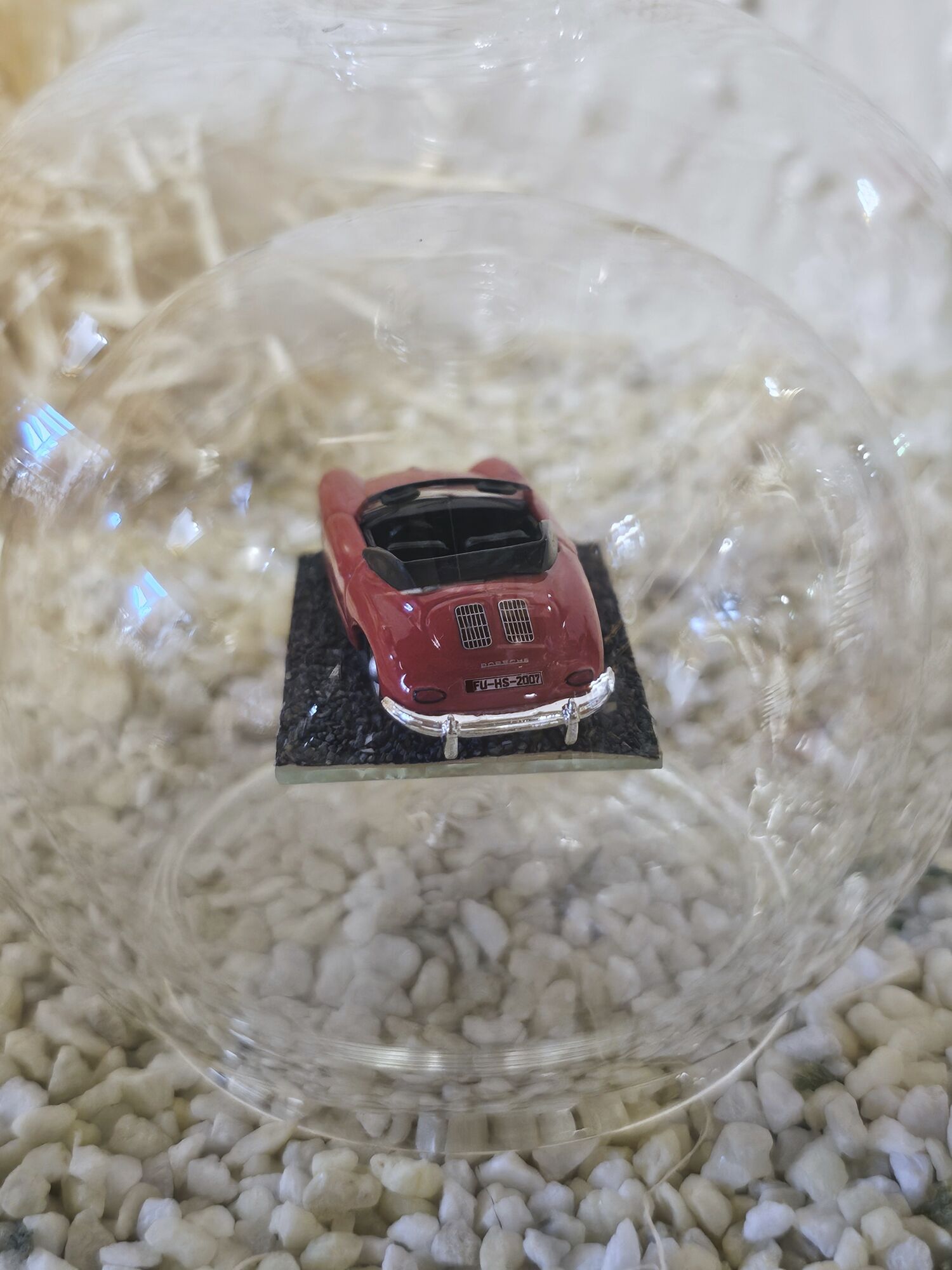 Hier zeigen wir Ihnen eine edle gefertigte, mundgeblasene Glasflasche mit einem Fahrzeug-Modell 1:87 Porsche 356 Cabrio