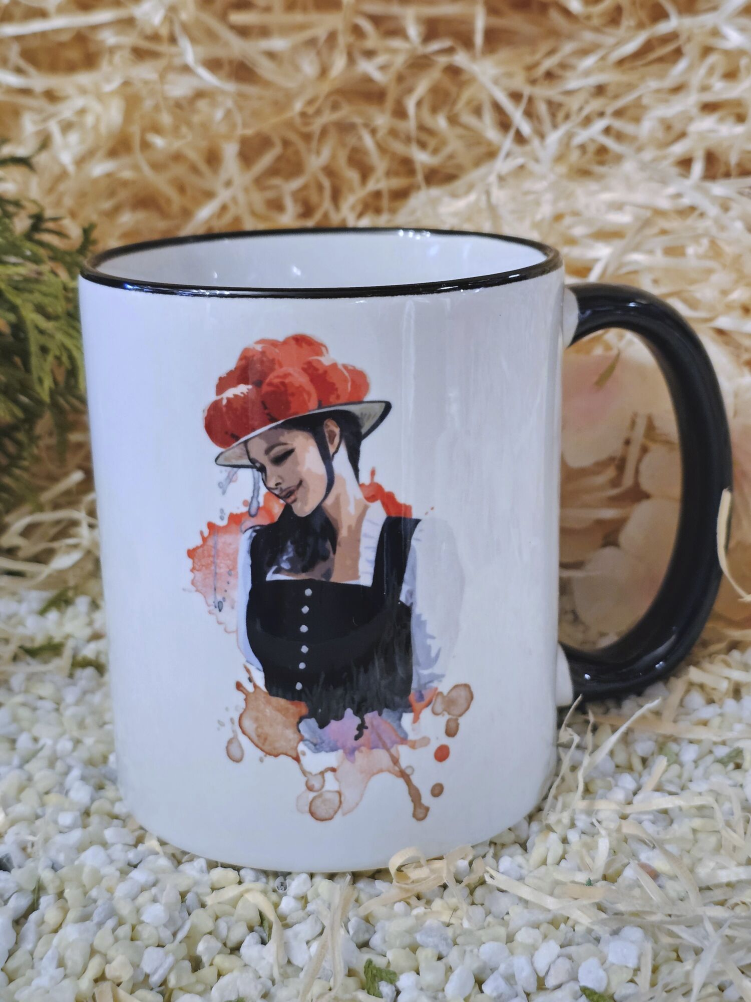 Diese Tasse außen weiss, innen weiss, schwarzer Rand mit schwarzem Henkel.