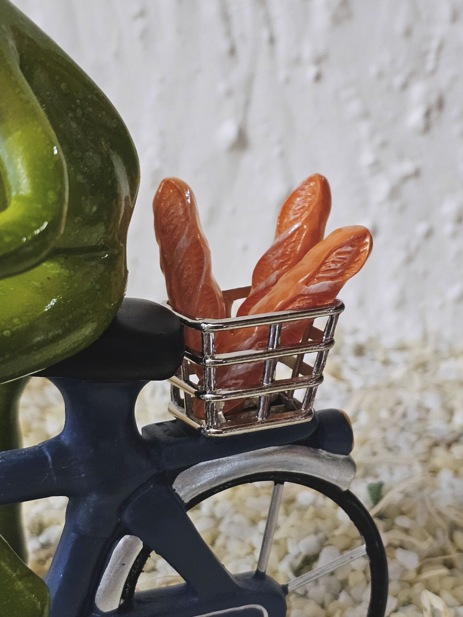 Mit tollem blauen Fahrrad und einem Einkaufskorb mit kleine Baguetts