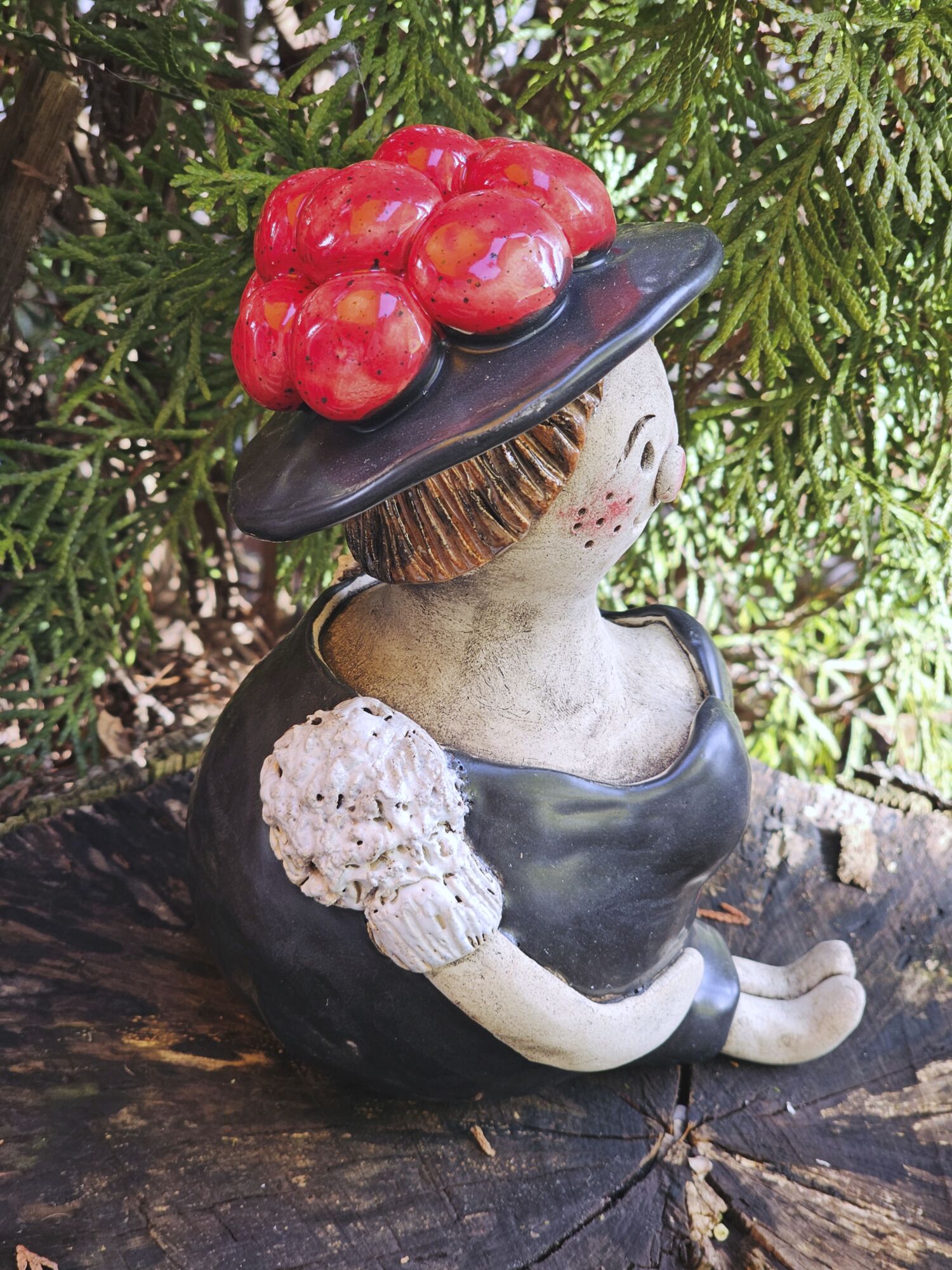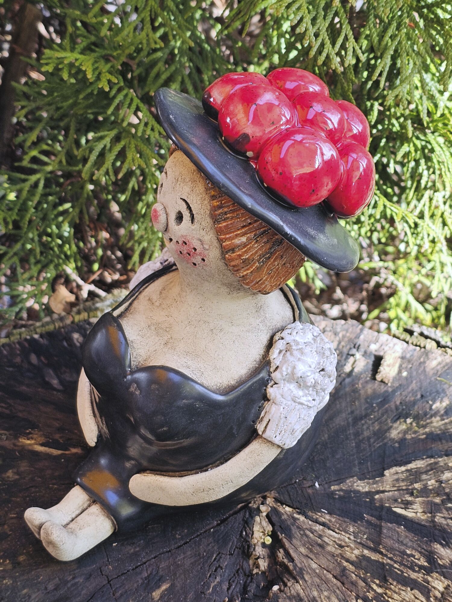 Tonfigur Schwarzwälderin sitzend mit rotem Bollenhut