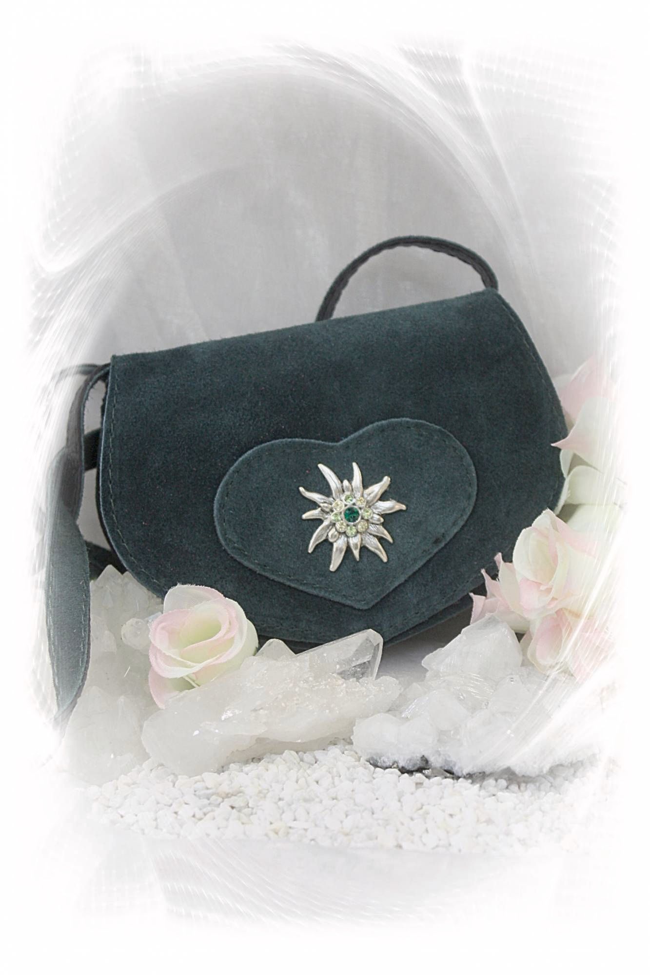 Ein aufgenähtes Herz Ton in Ton mit einem dazu perfekt passendem Edelweiß mit glitzernden Swarovskikristallen.