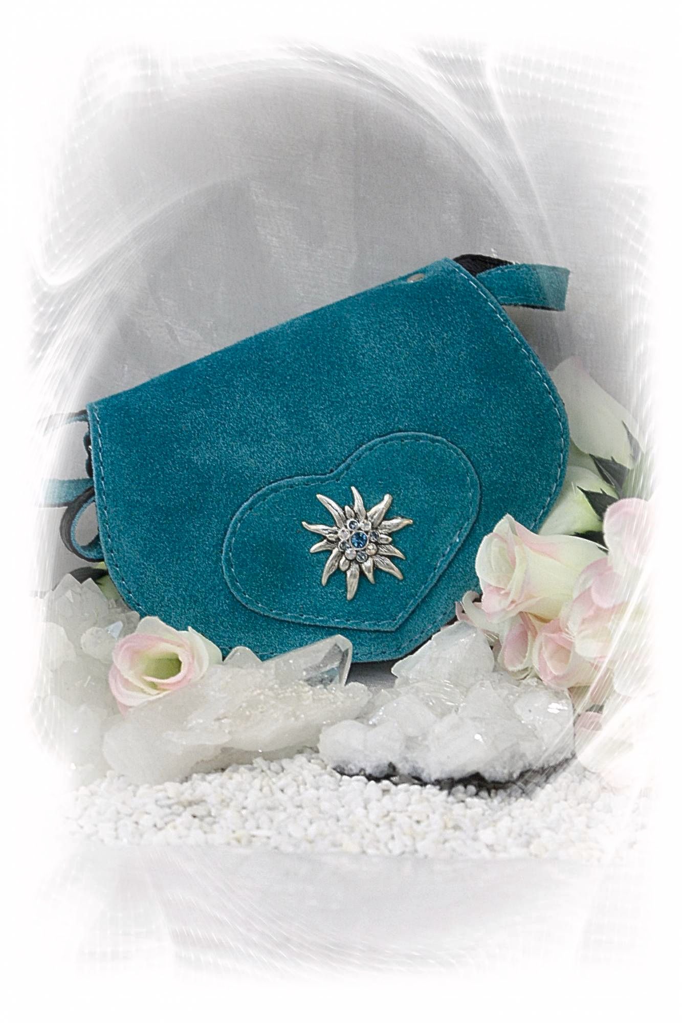 Ein aufgenähtes Herz Ton in Ton mit einem dazu perfekt passendem Edelweiß mit glitzernden Swarovskikristallen.