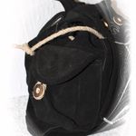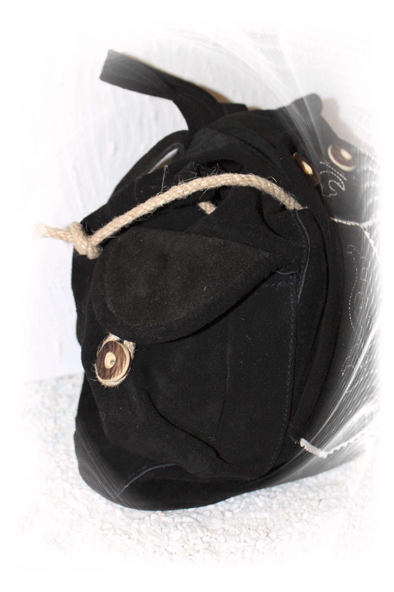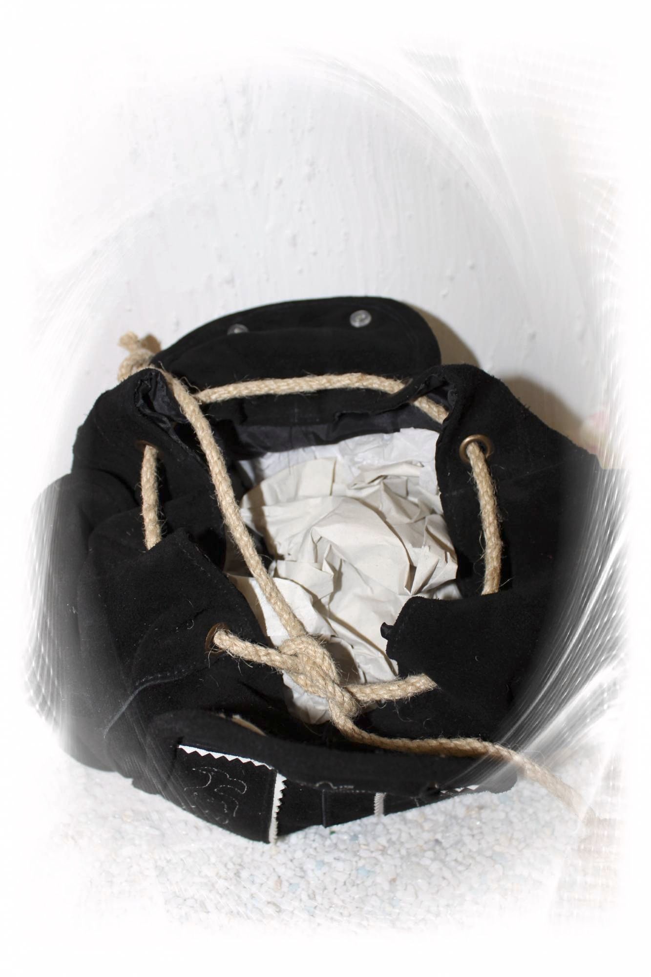 Der Rucksack ist mit Schnürung,seitlichen Taschen,Lederhänkel zum Tragen und zum Umhängen hat er verstellbare Lederriemen.
