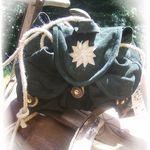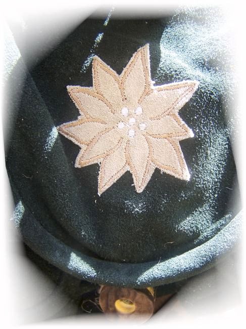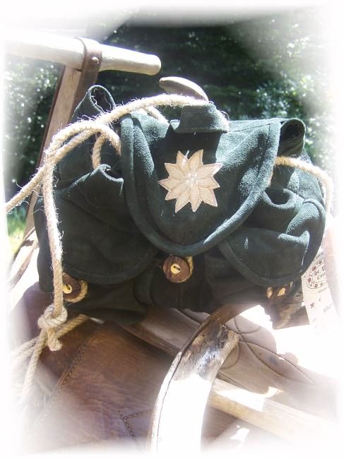 Vorne zwei Taschen und auf der Schließe ein Edelweißsticker.