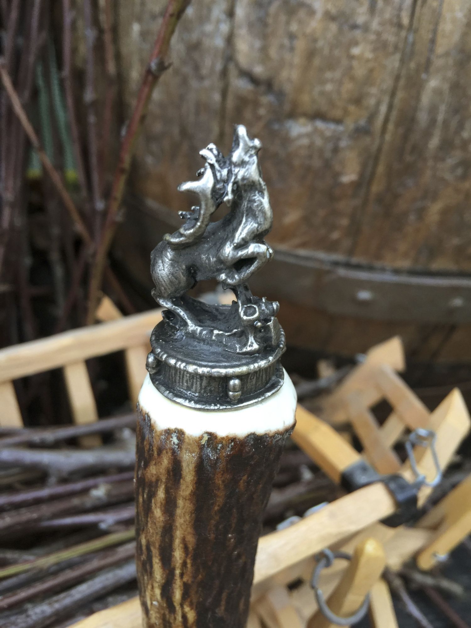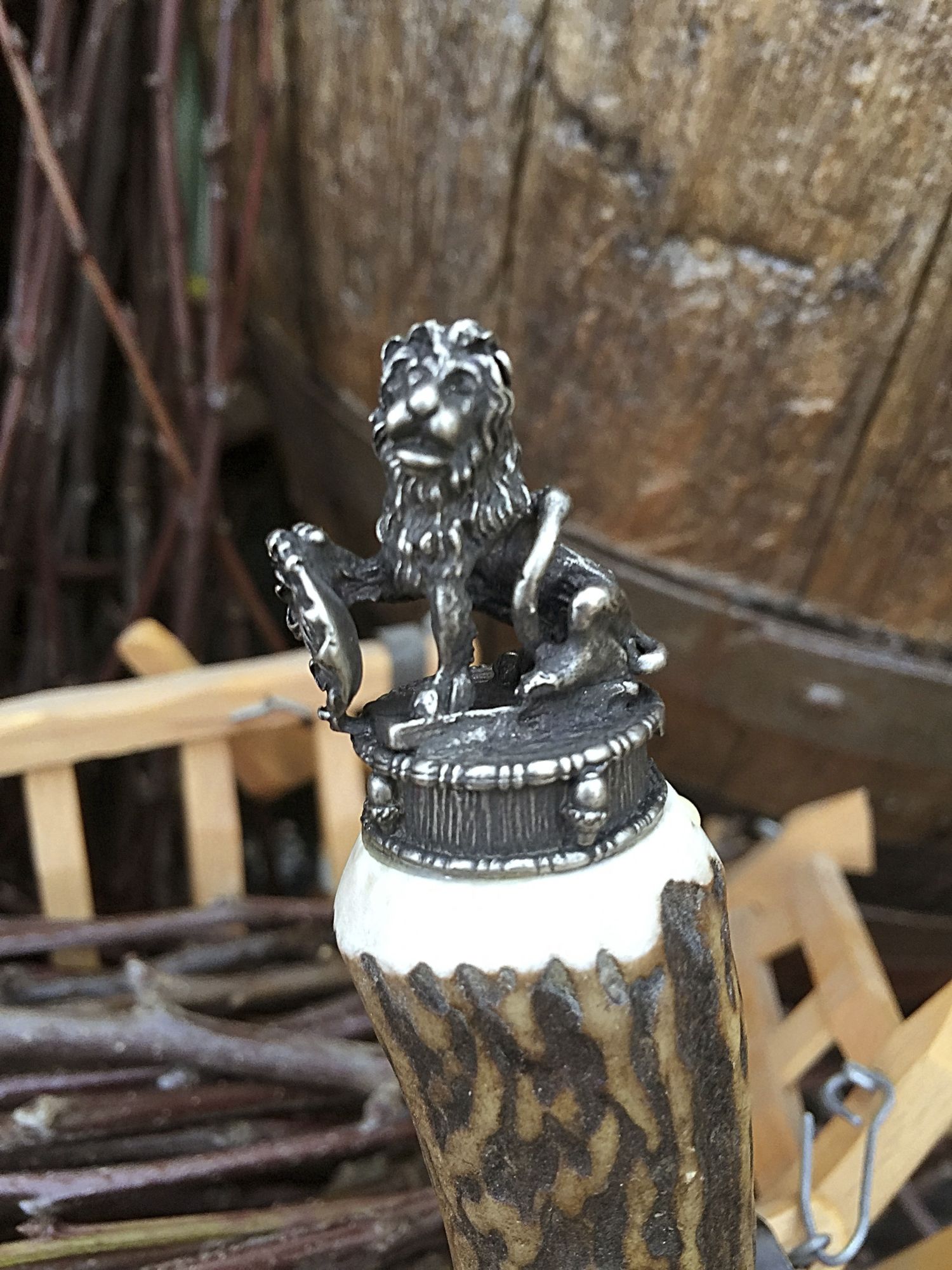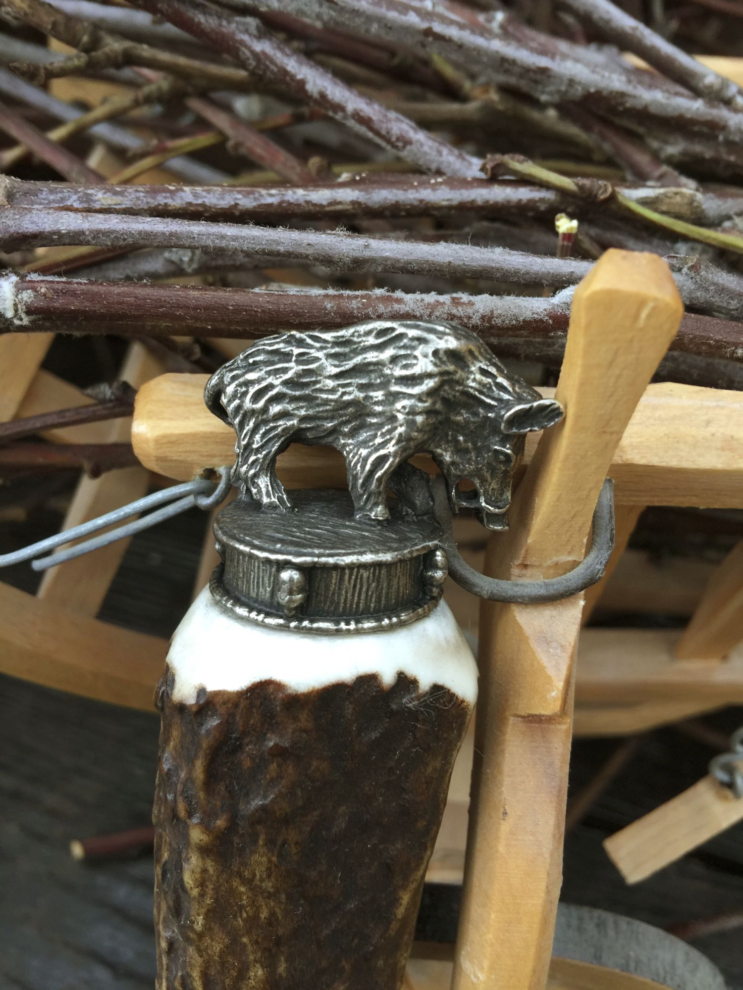 Flaschenöffner mit Motivkappe als Alternative zum Trachtenmesser, Hirschhorngriff, und Zierkappe mit wunderschönen Motiv-Figuren-Kappe