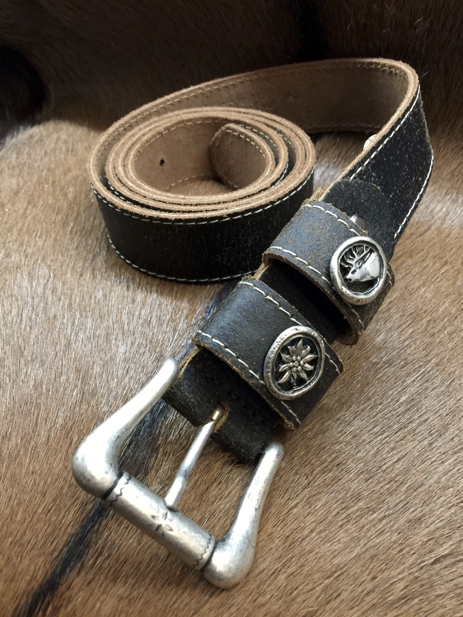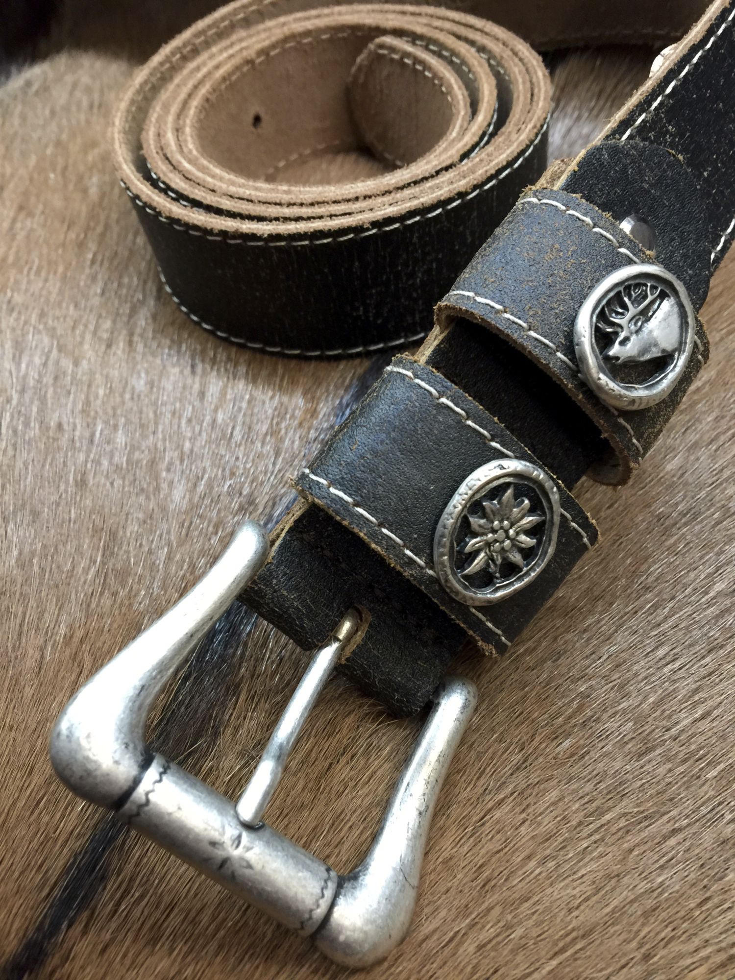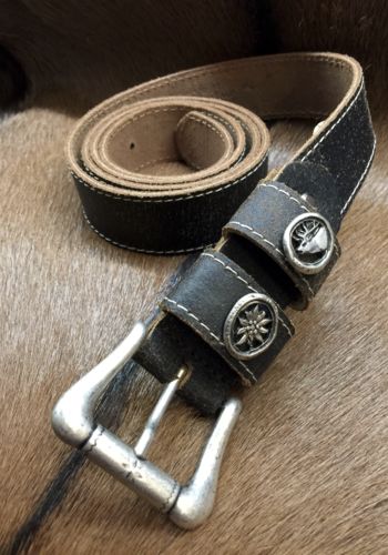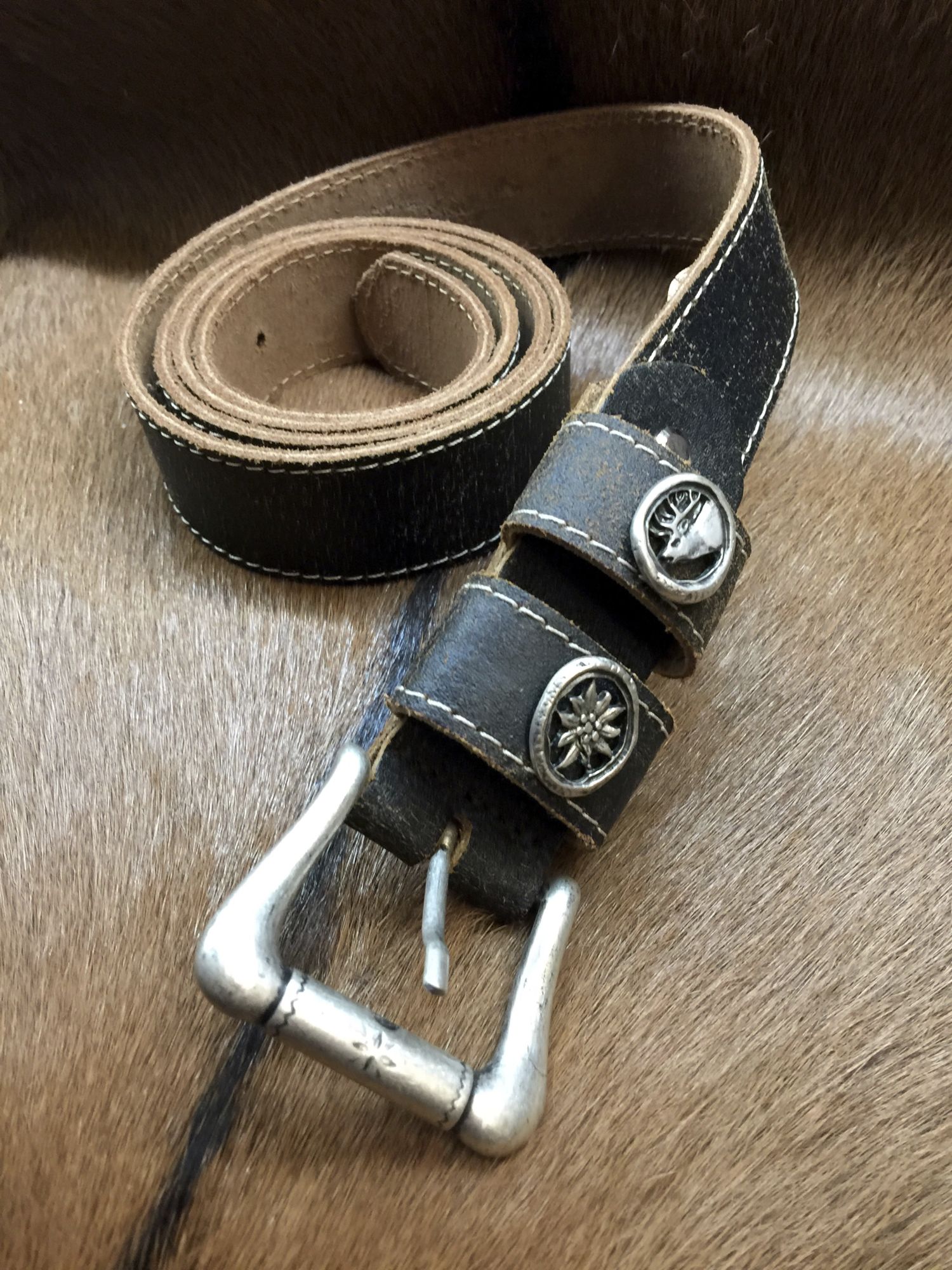 Mit rustikaler Schnalle und zwei Schlaufen mit Emblem Edelweiß und Hirschkopf
