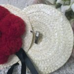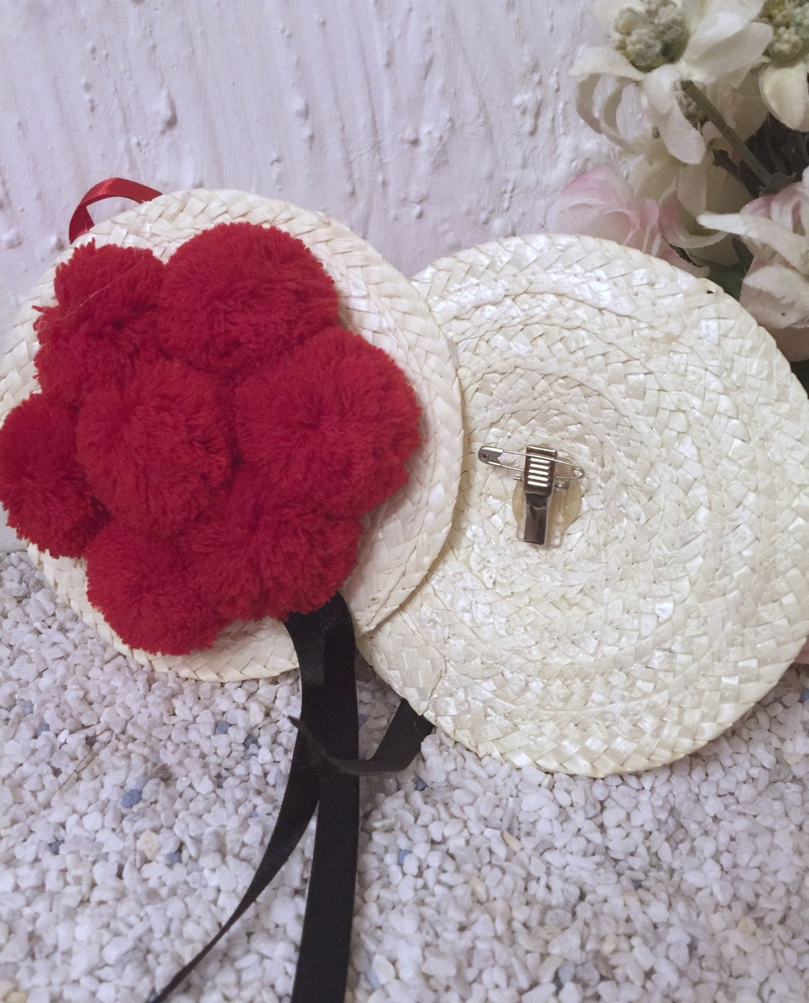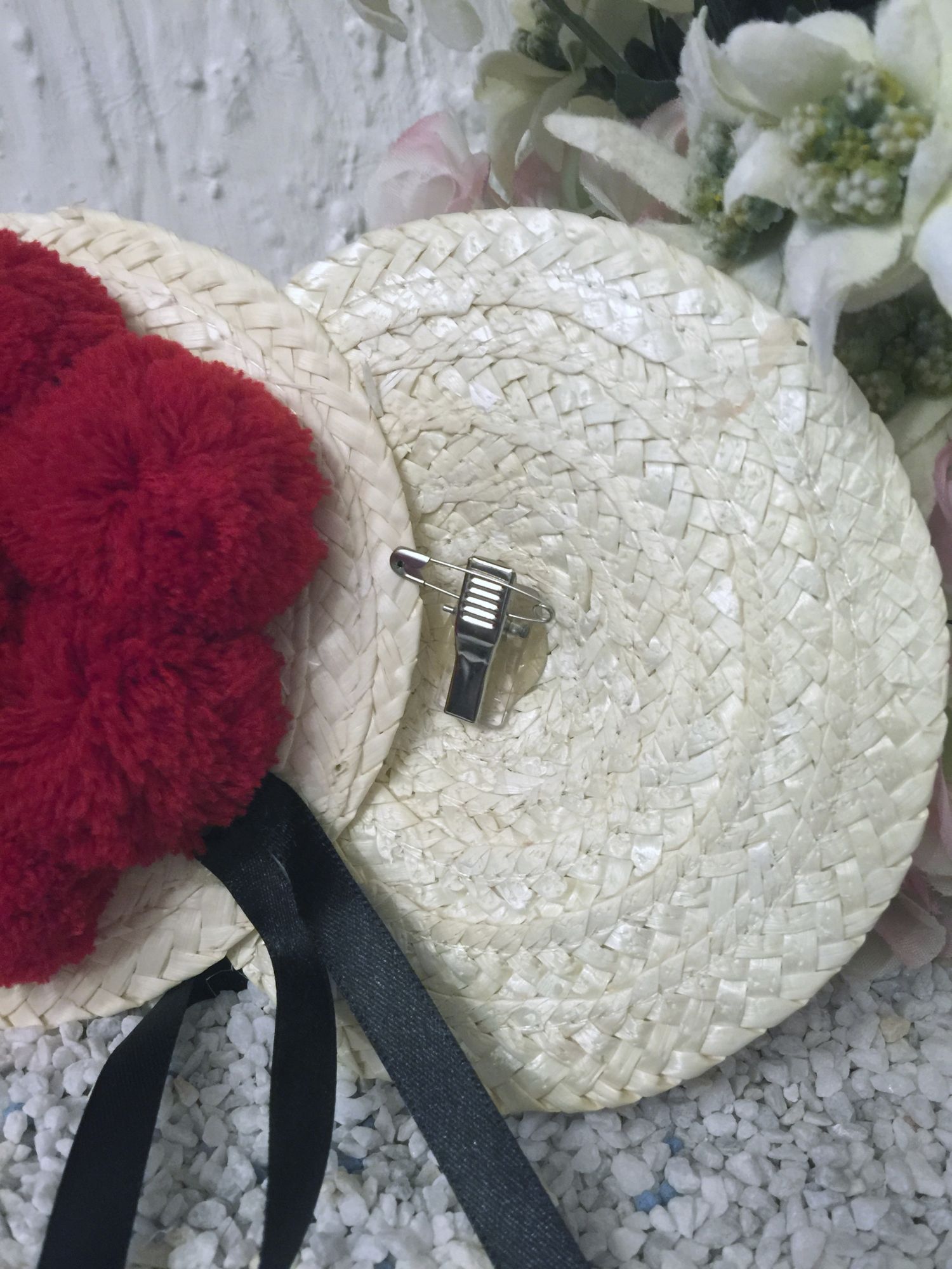 Kleiner Bollenhut mit Schwarzer Schleife und rotem Band sowie einer Klammer und Nadel.