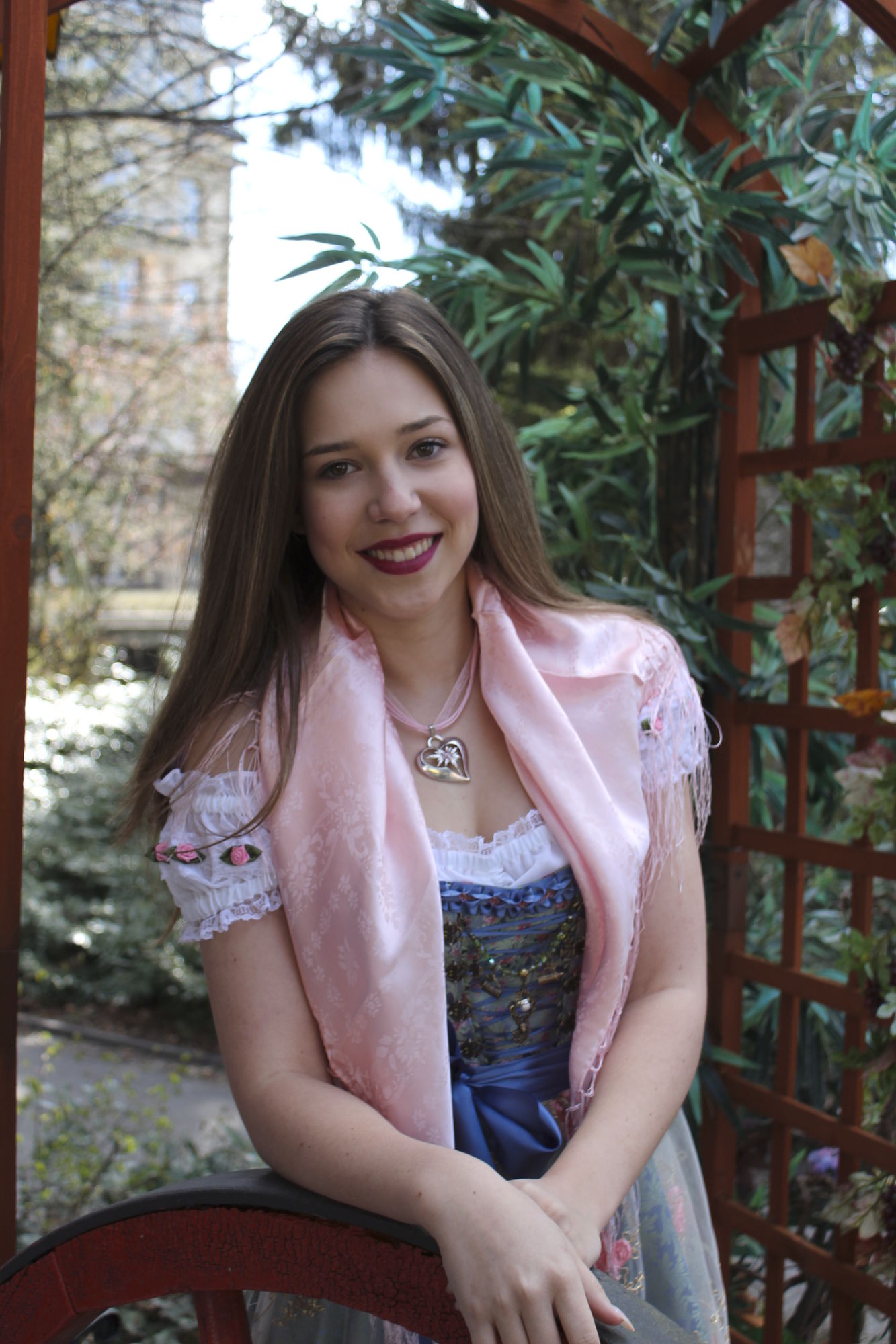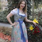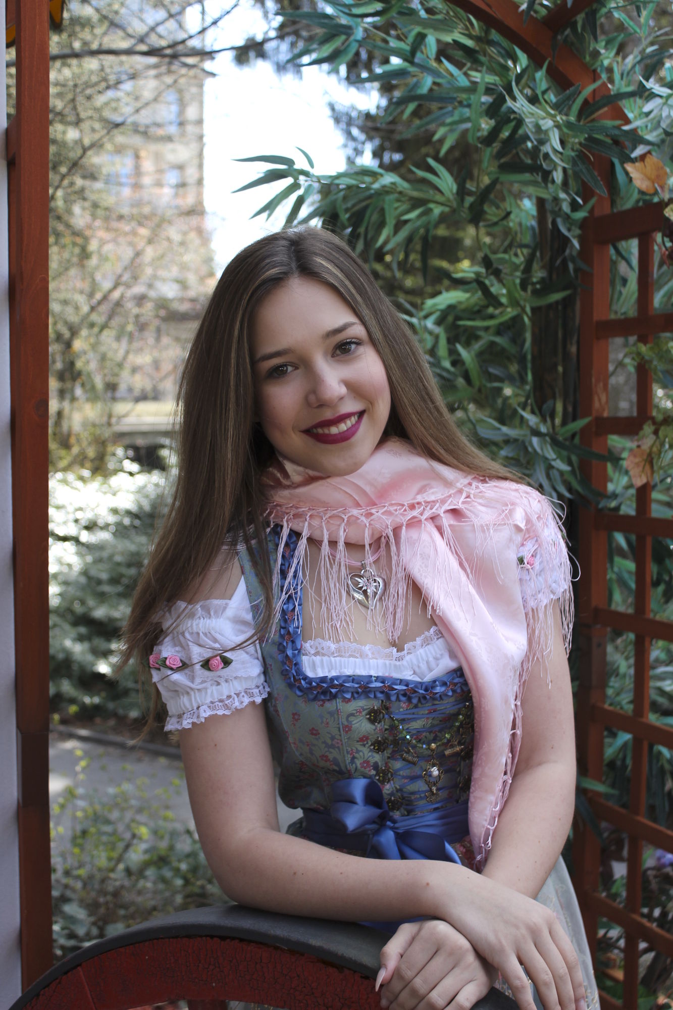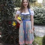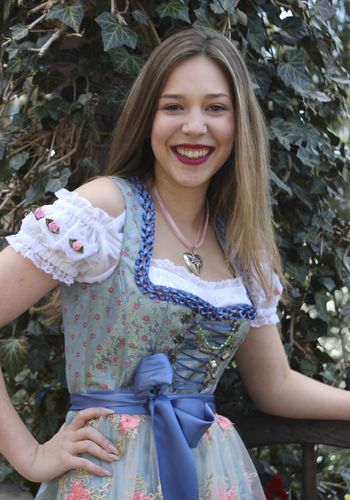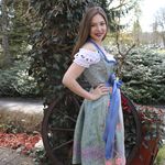 Ein Traumdirndl in schillerdem Blau, Türkis, weinrot und altrosa.