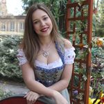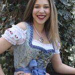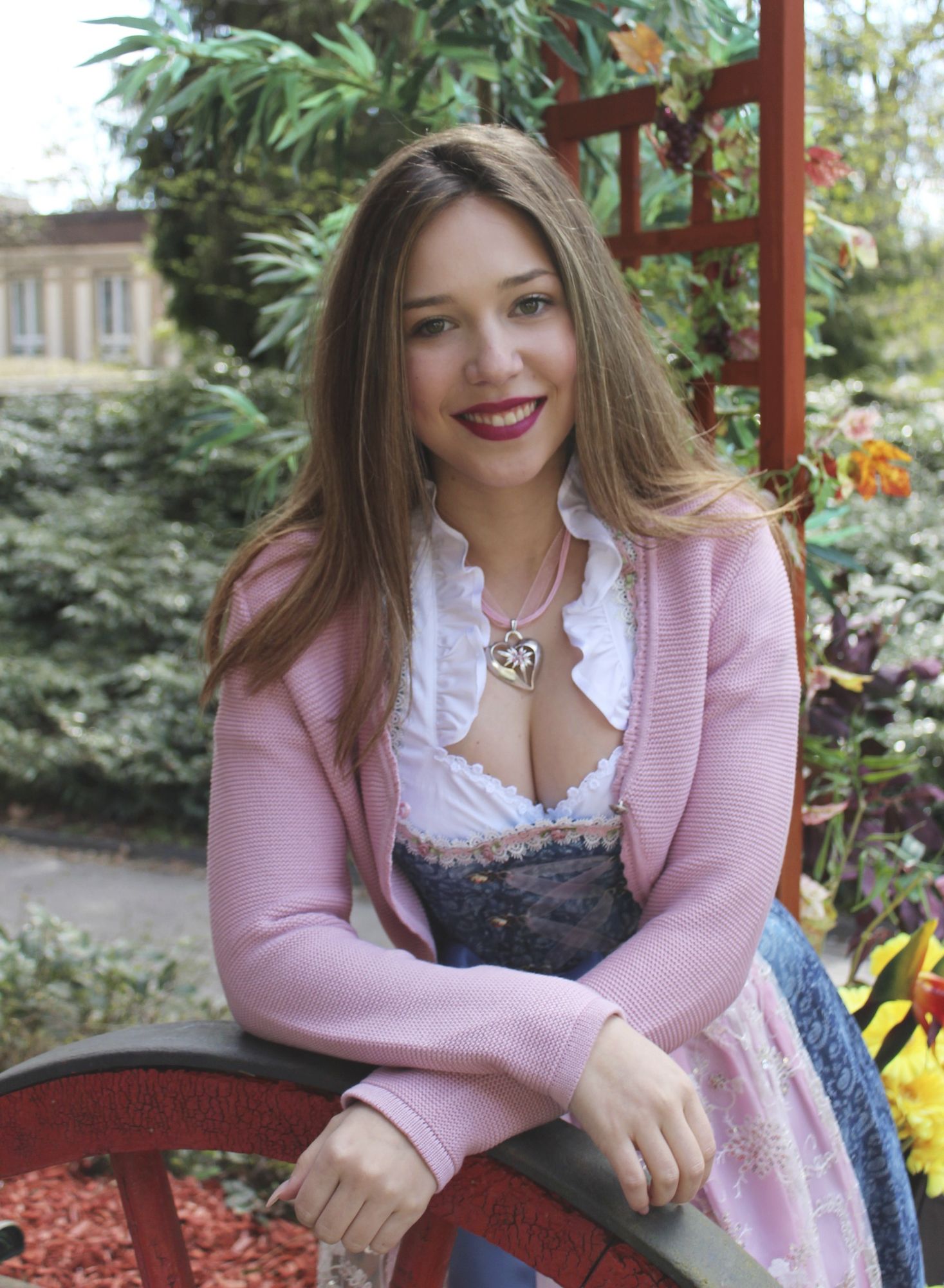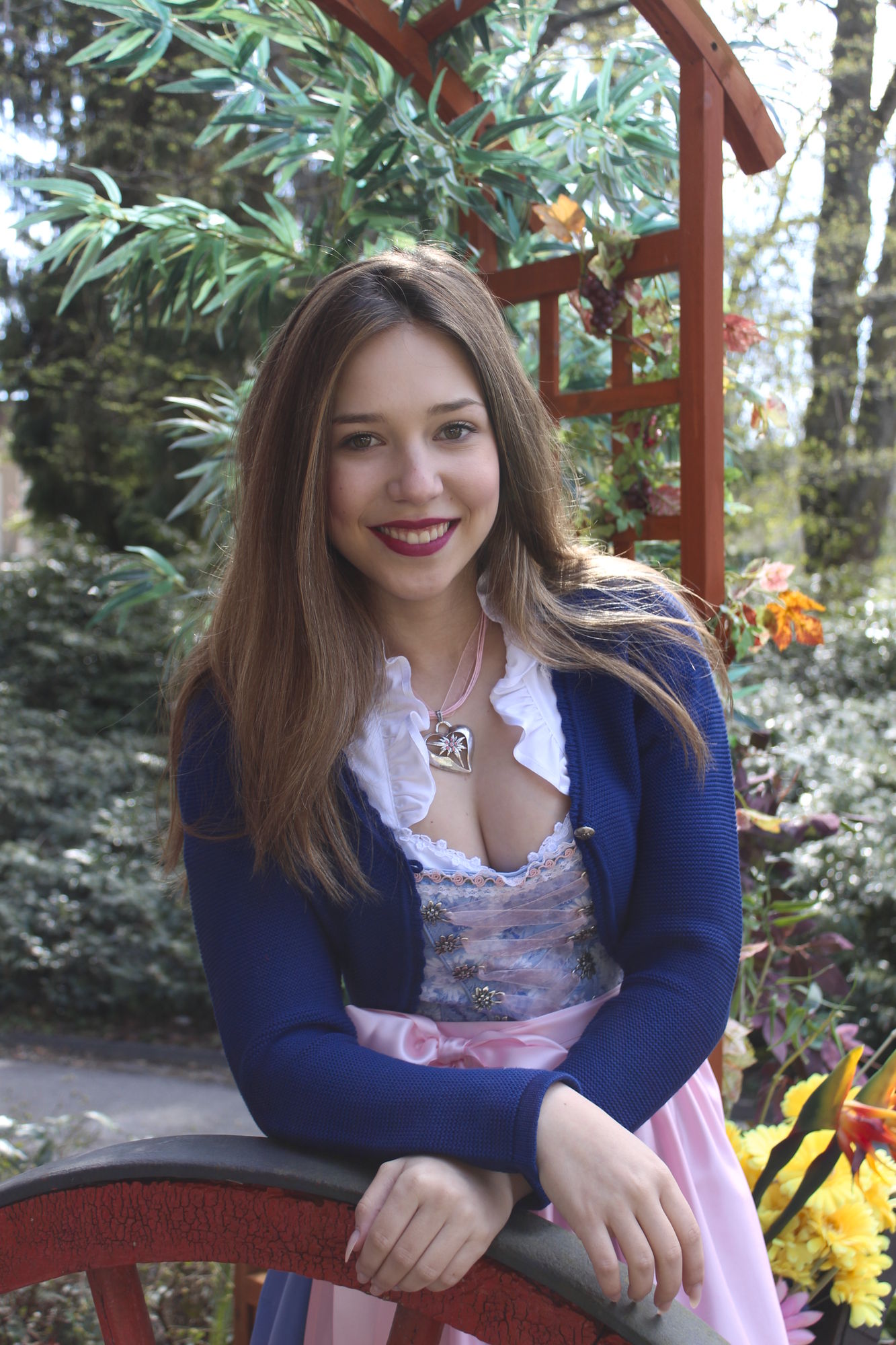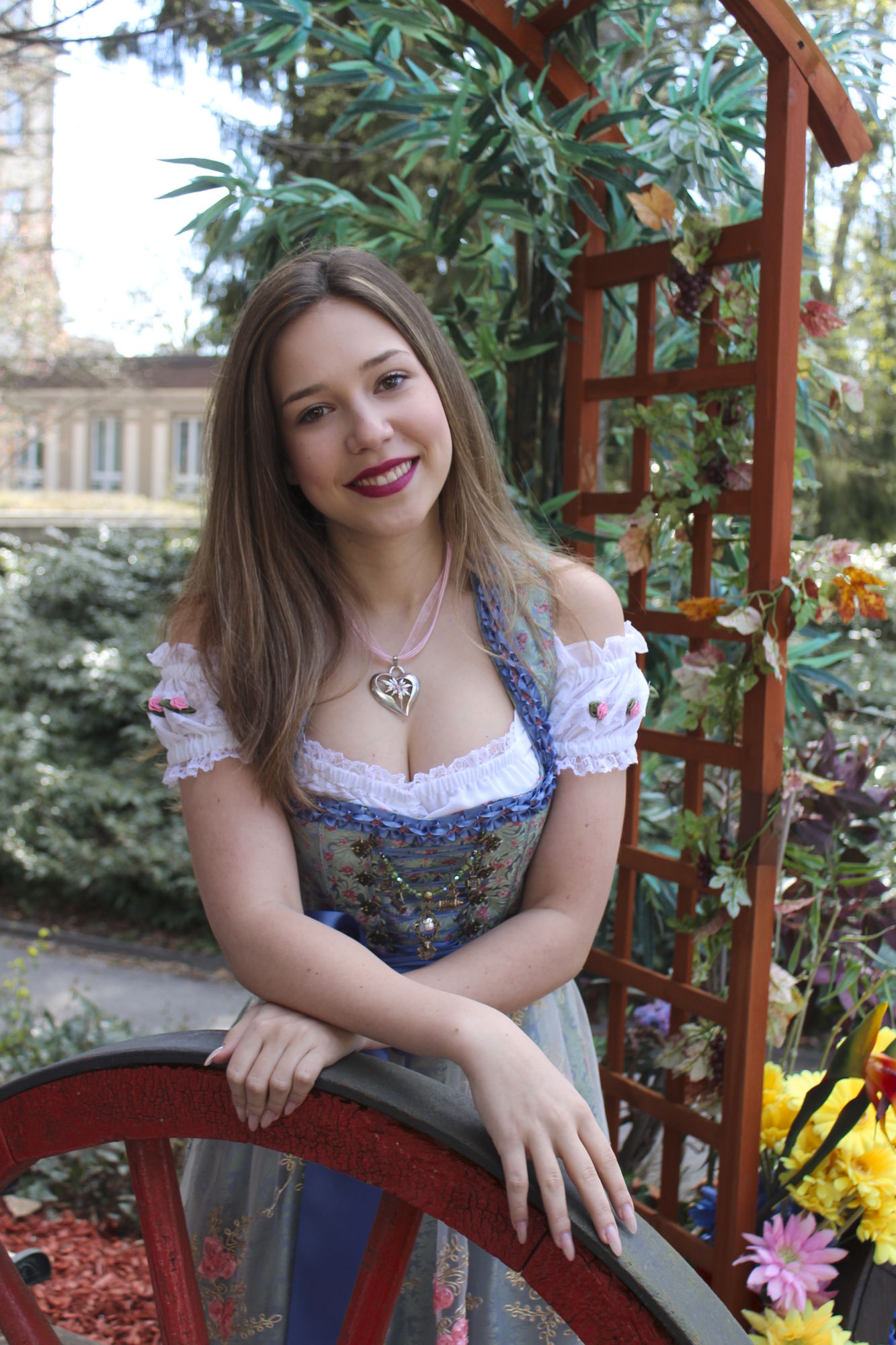 Ein Traumdirndl in schillerdem Blau, Türkis, weinrot und altrosa.