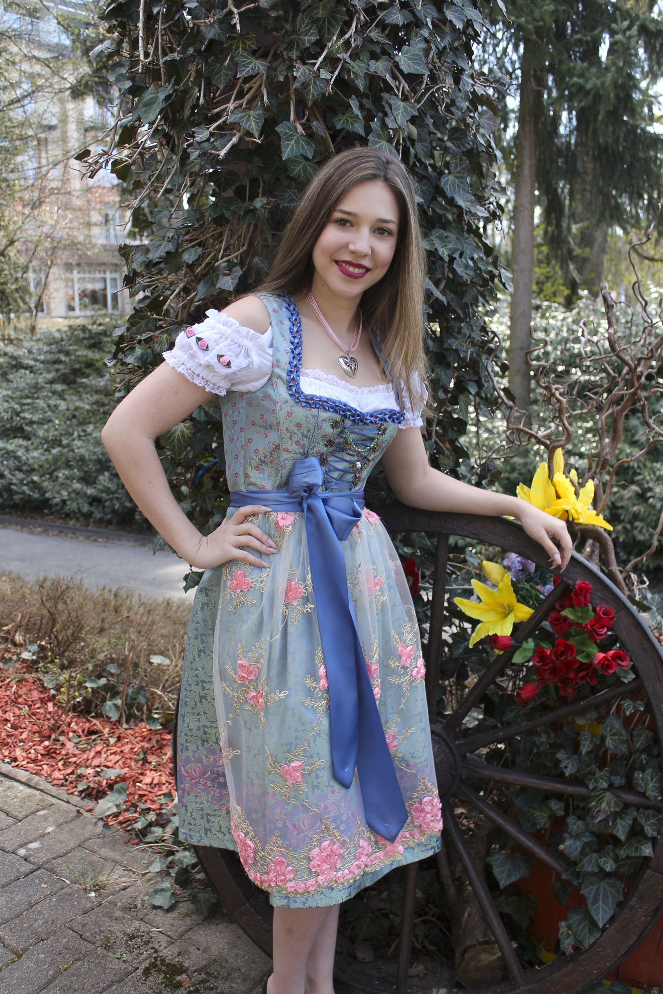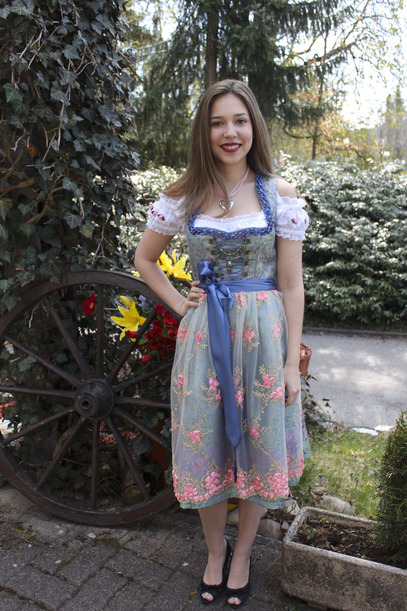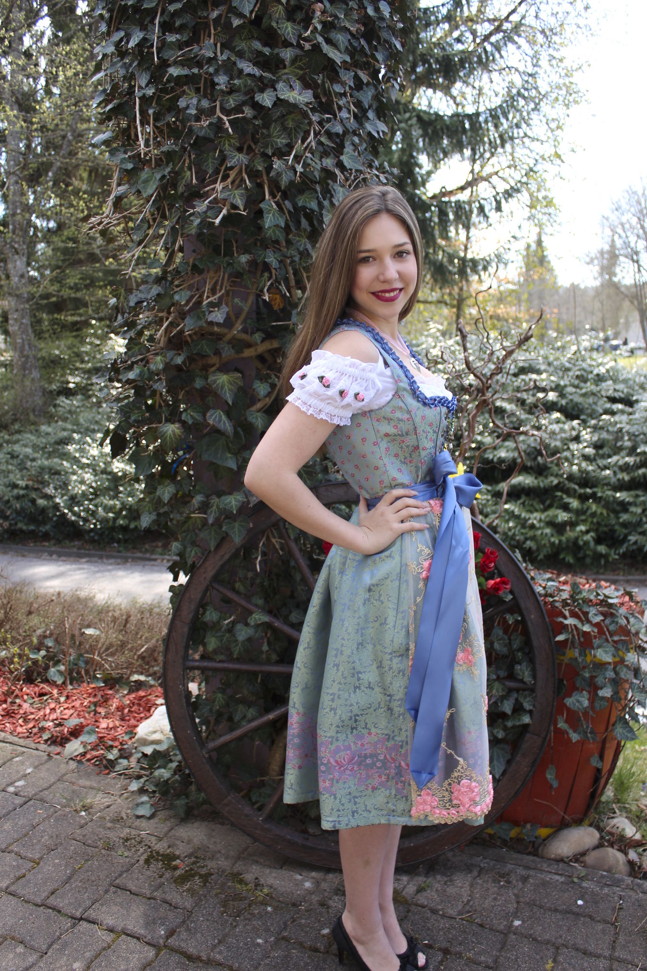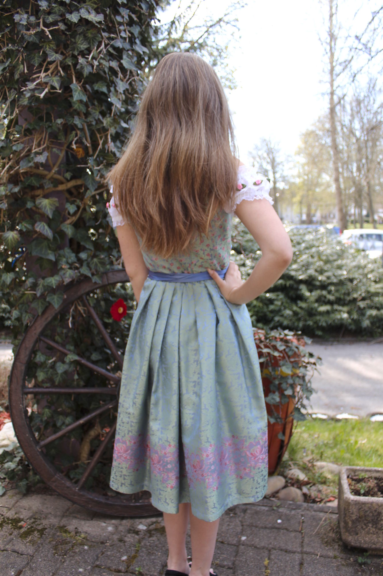 Das Dirndl ist in schillerdem blau-türkis-altrosa gehalten.
