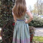 Der duftig leichte Rock mit Blumendruck in den schillernden Farben blau,türkis und altrosa passen ebenfalls perfekt zueinander, wie die Edelschürze aus transparentem Tüll und den edlen Goldranken mit altrosafarbenen Rosen.