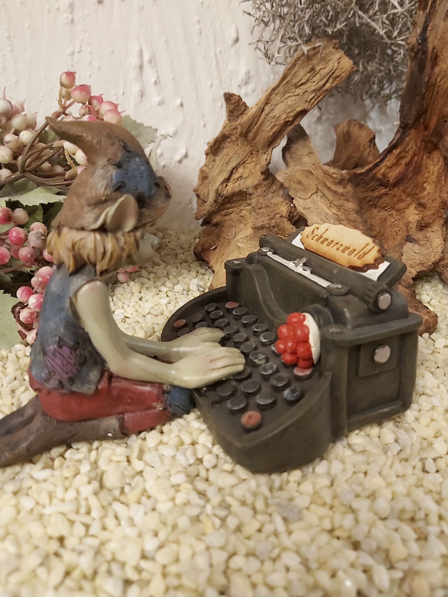 Mit Schreibmaschine, Holzschild-Schwarzwald und Bollenhut