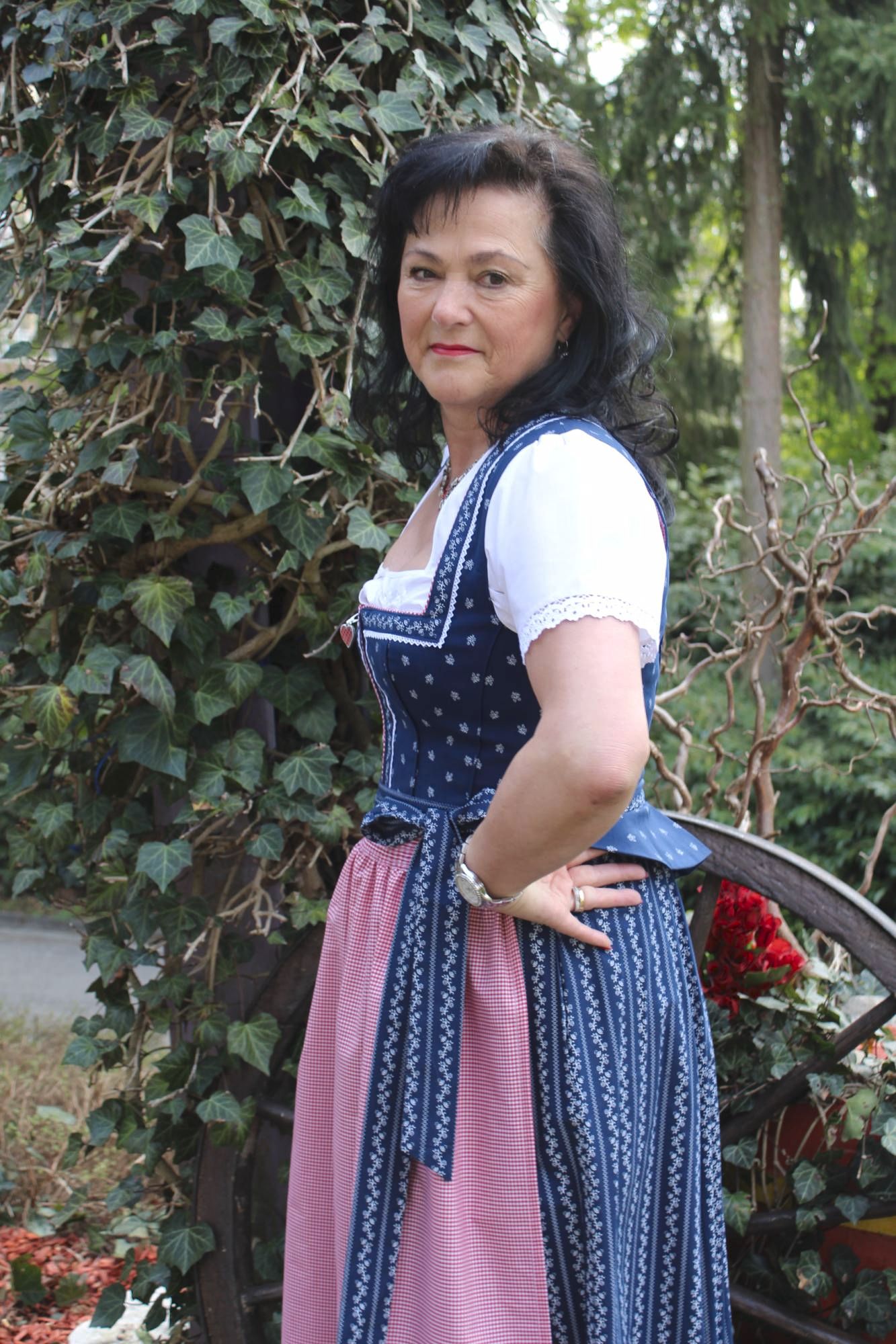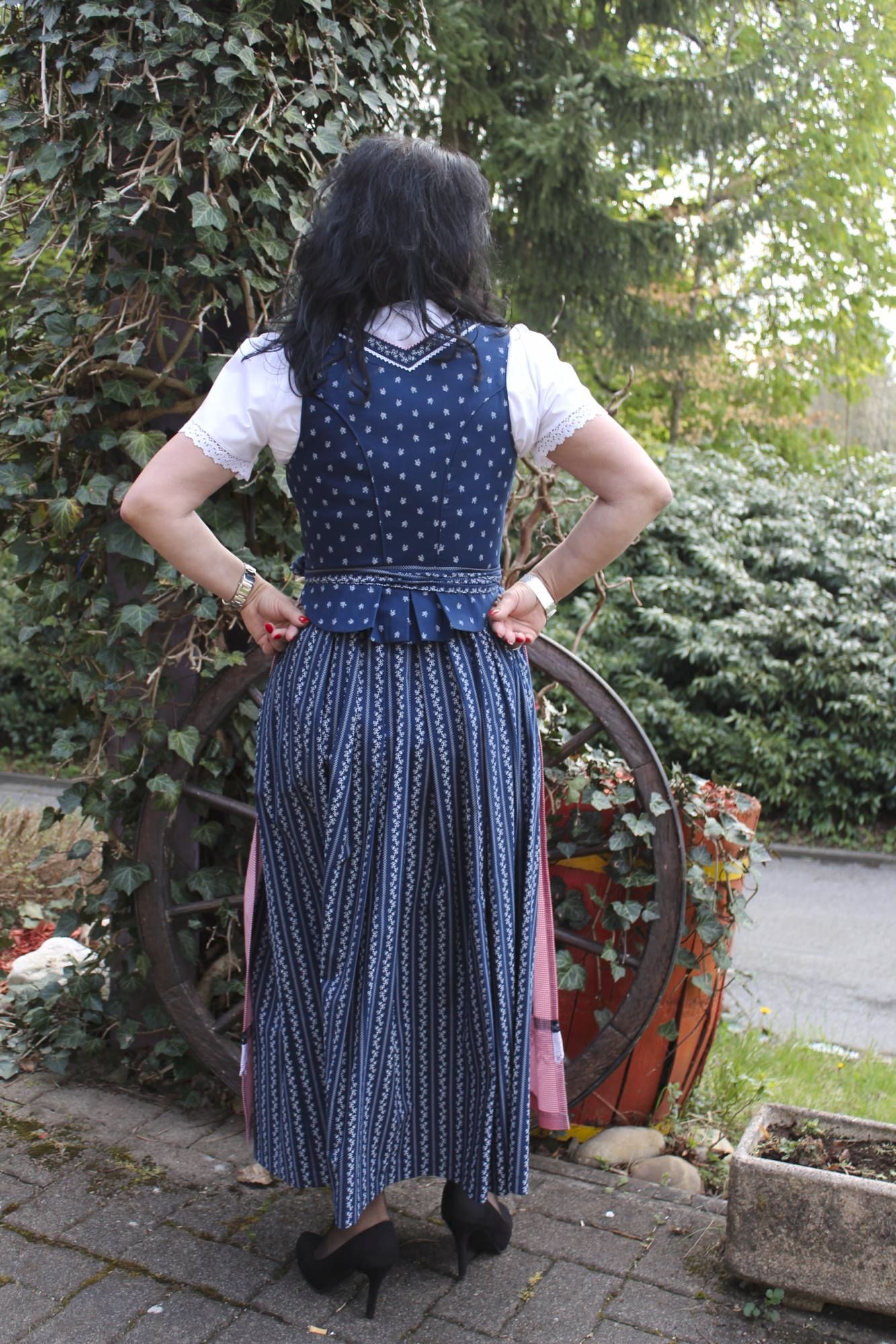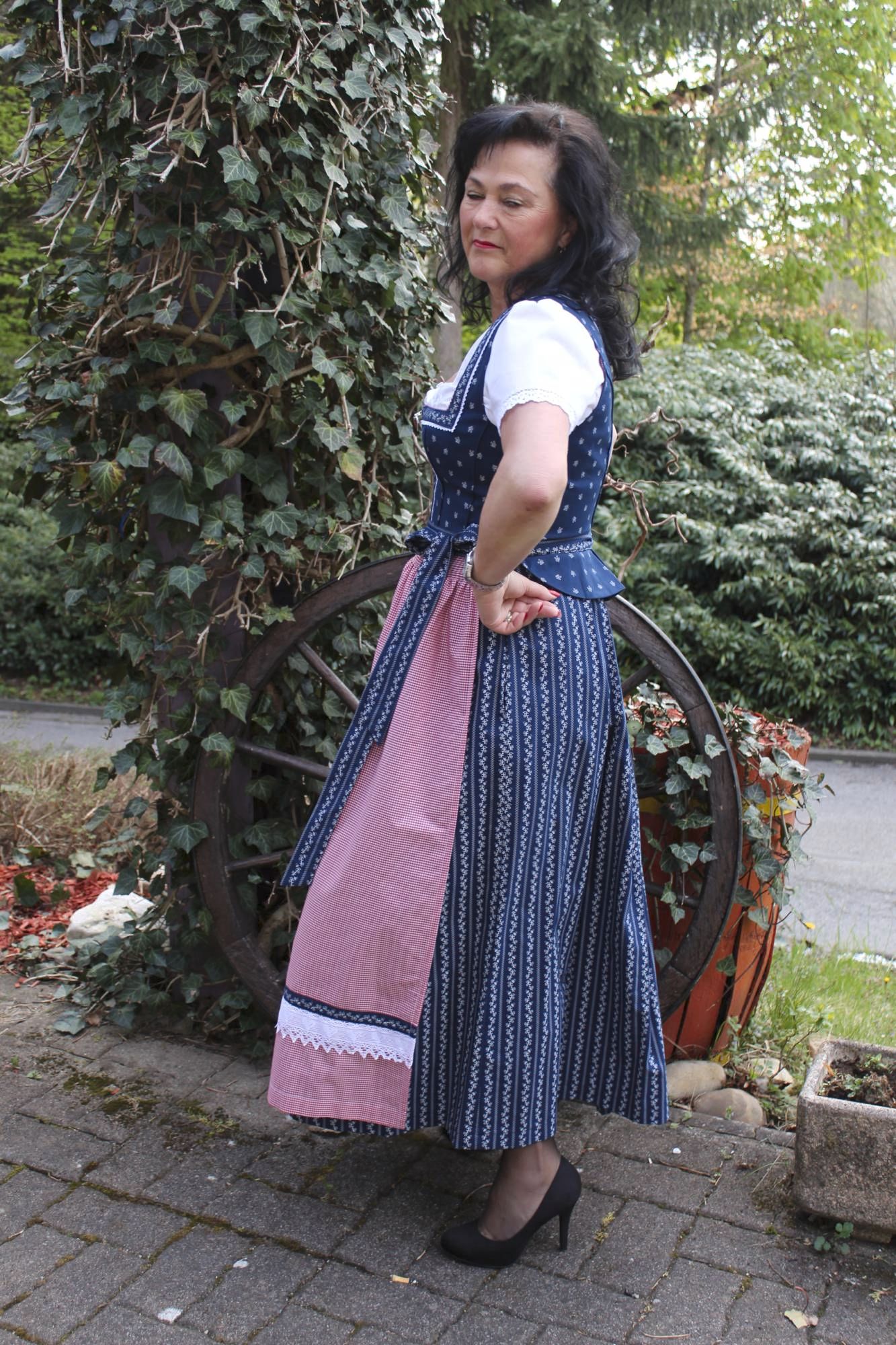 Das Dirndl in den Traditionsfarben Blau und Weinrot.