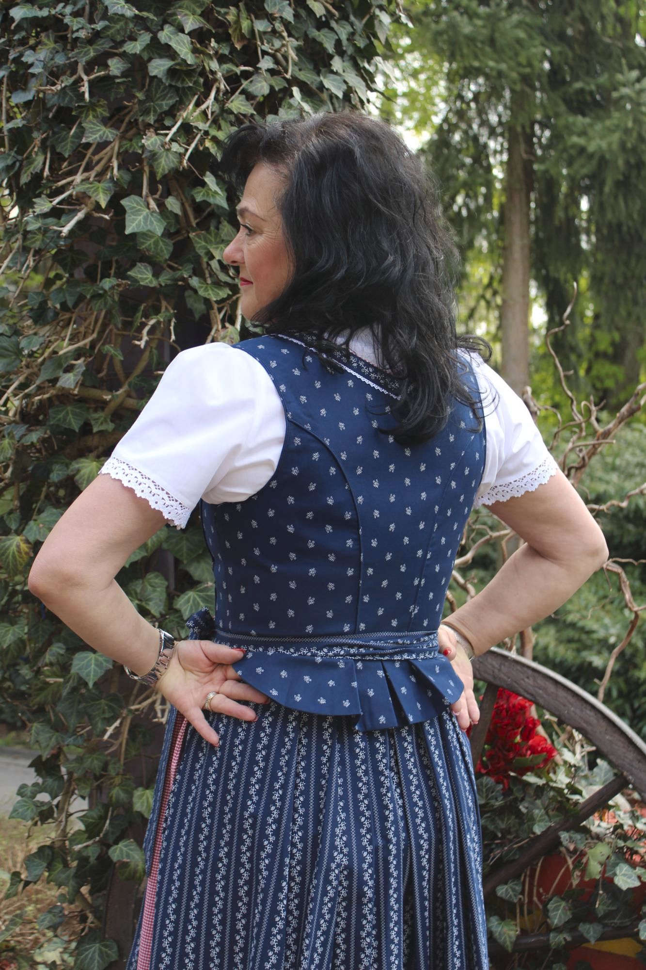 Das Dirndl ist komplett in blau mit weissen Streublümchen gehalten.