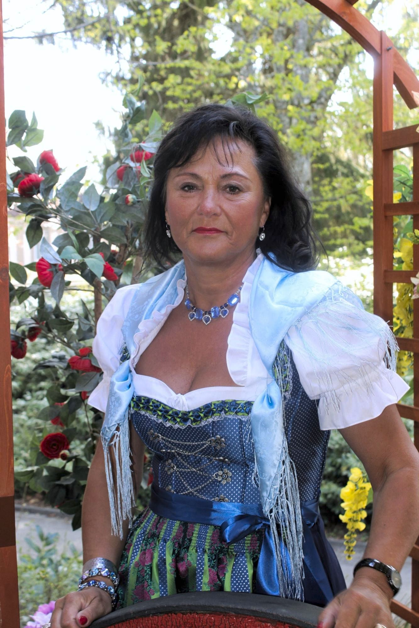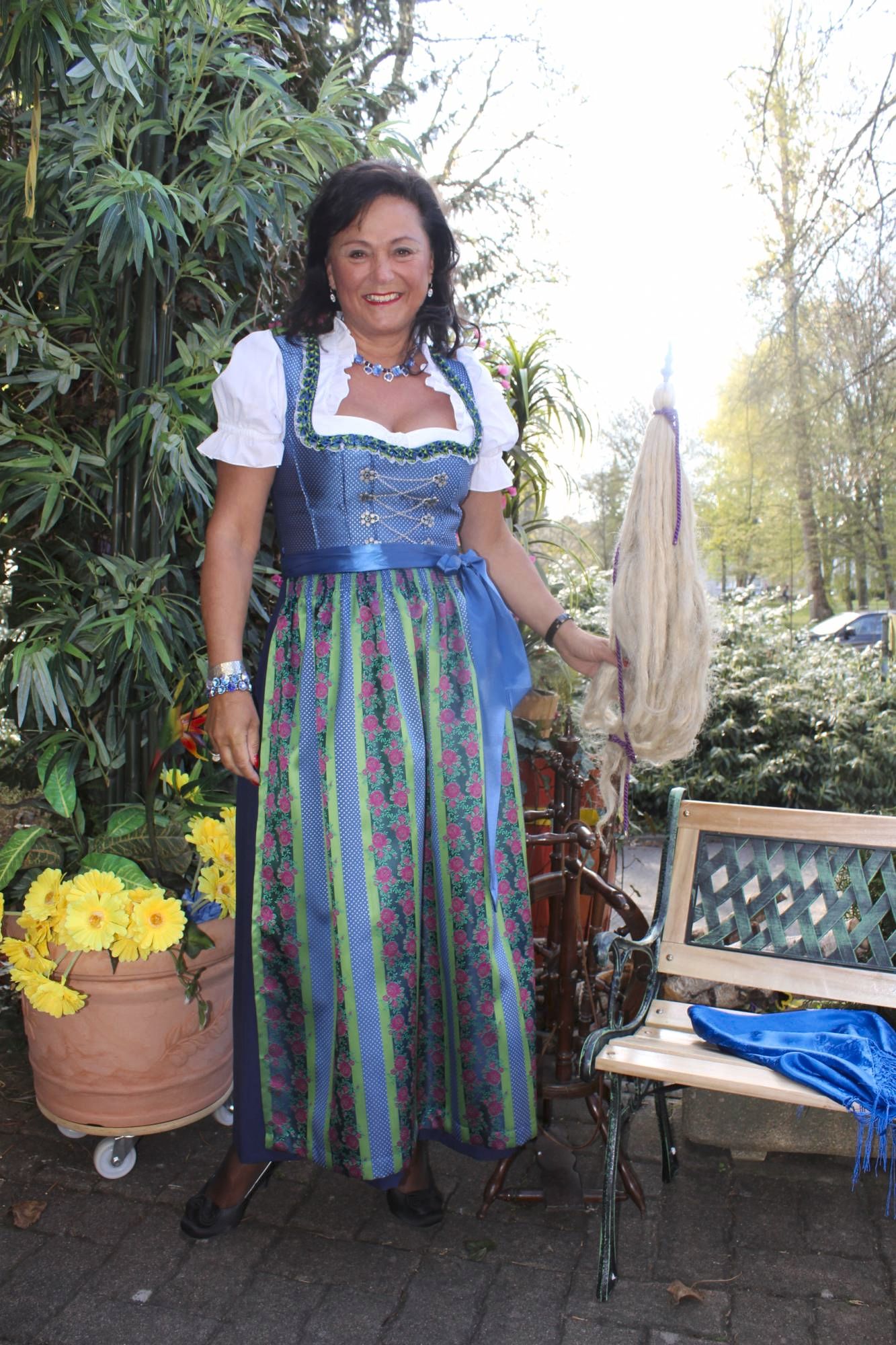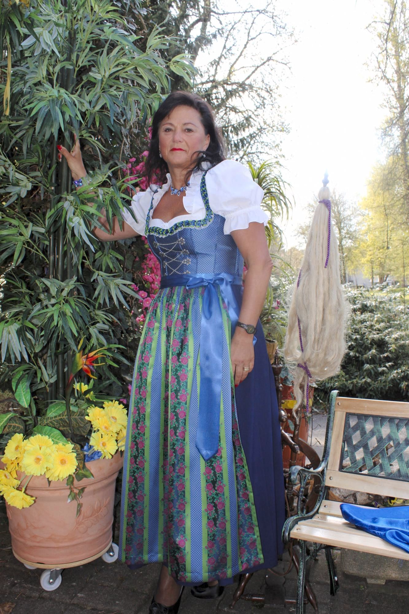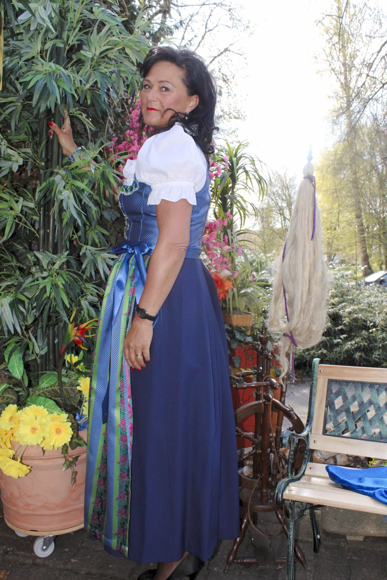 Dazu die edle Schürze in seidig glänzendem blau, wo sich der Oberteilstoff wiederspiegelt und den edlen grünen Streifen und weinroten Blüten.