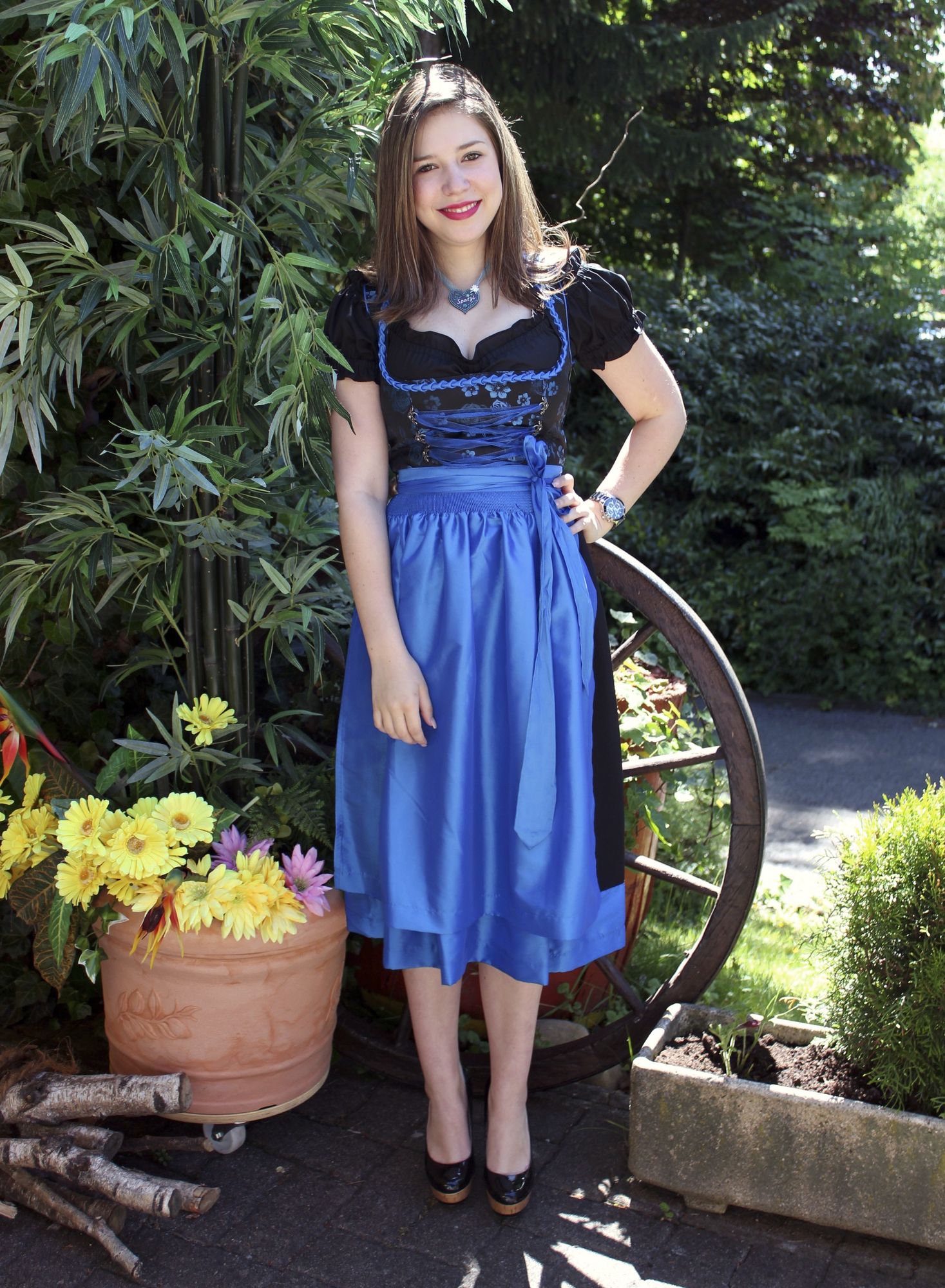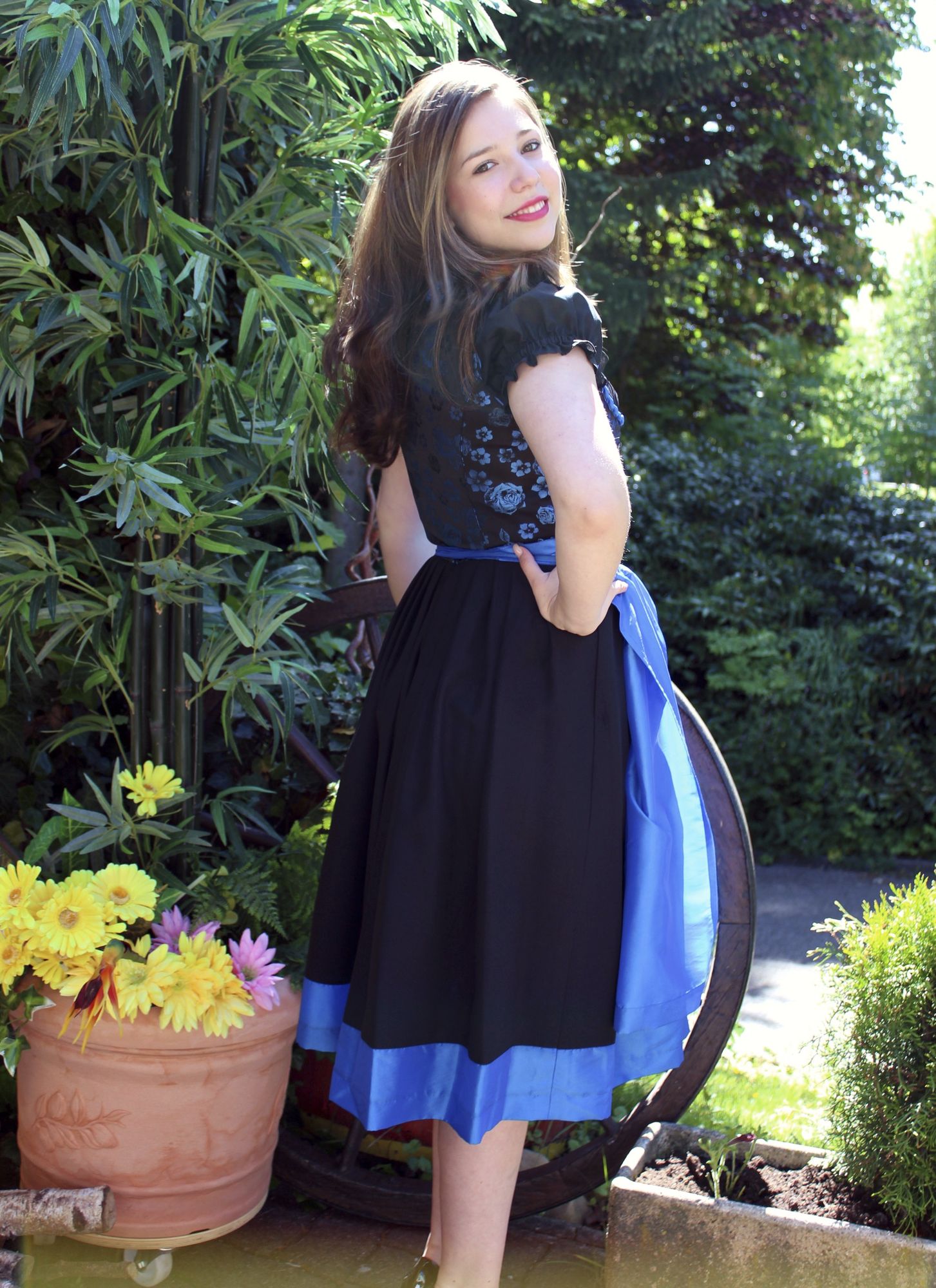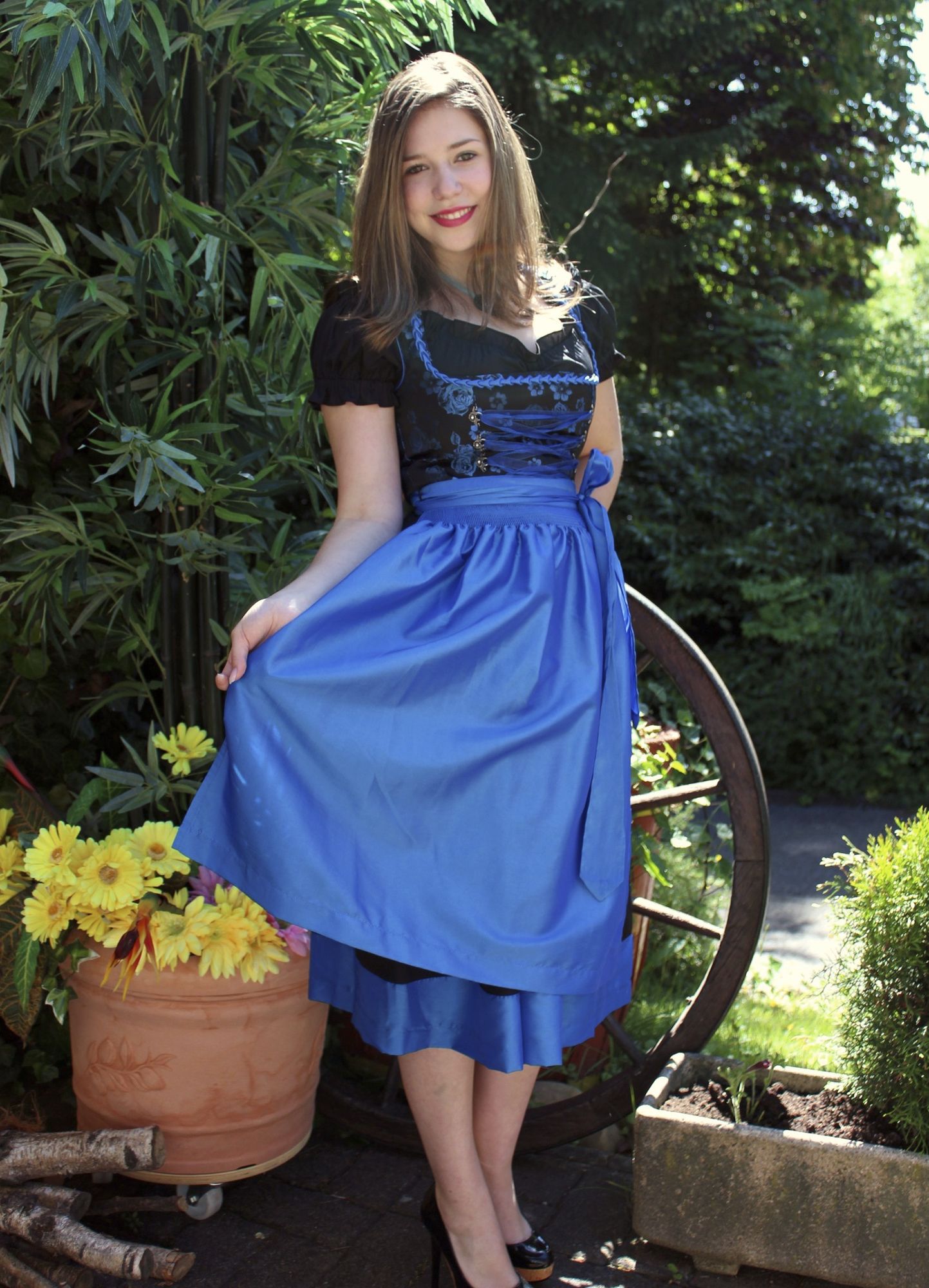 Abgerundet wird das Gesamtbild durch die edle seidig glänzende blaue Schürze,welche perfekt zu dem schwarzen Rock mit blauer Borte harmoniert.
