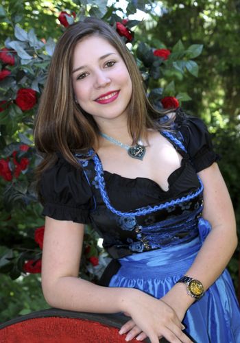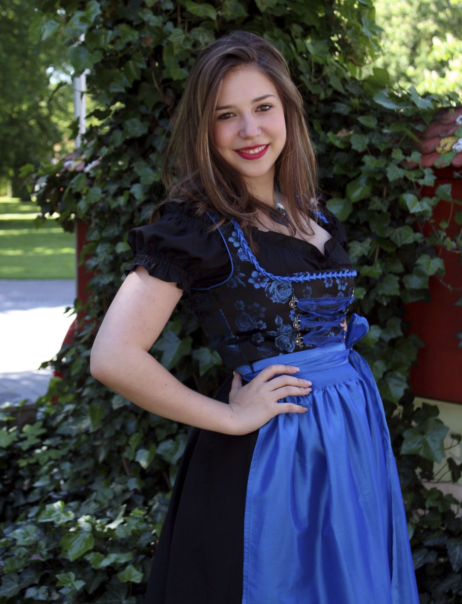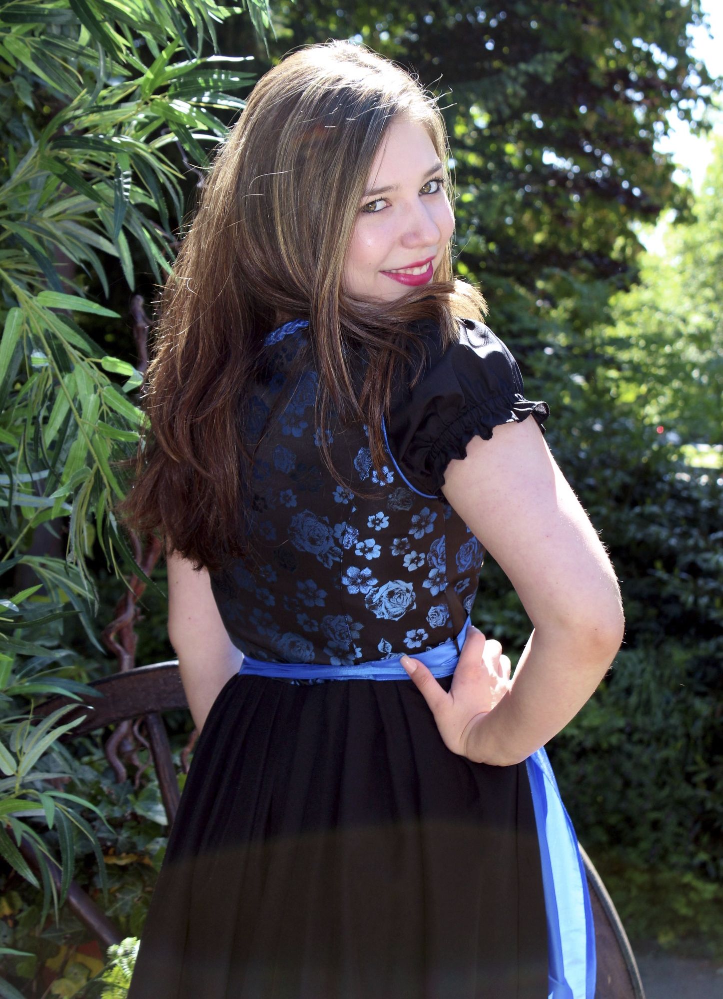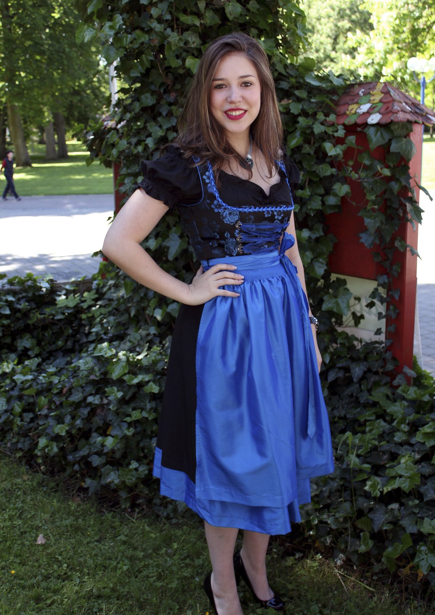 Abgerundet wird das Gesamtbild durch die edle seidig glänzende blaue Schürze,welche perfekt zu dem schwarzen Rock mit blauer Borte harmoniert.