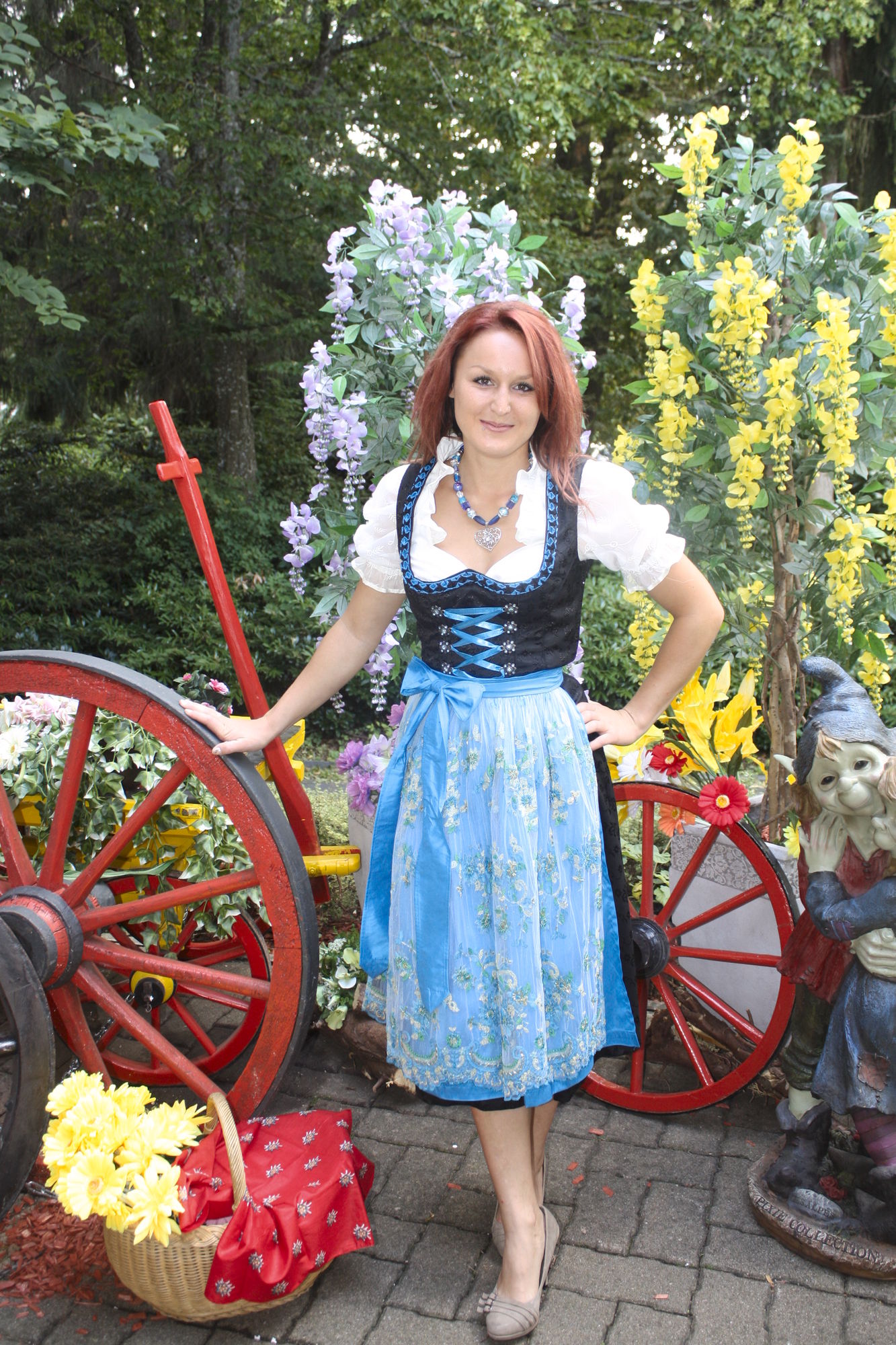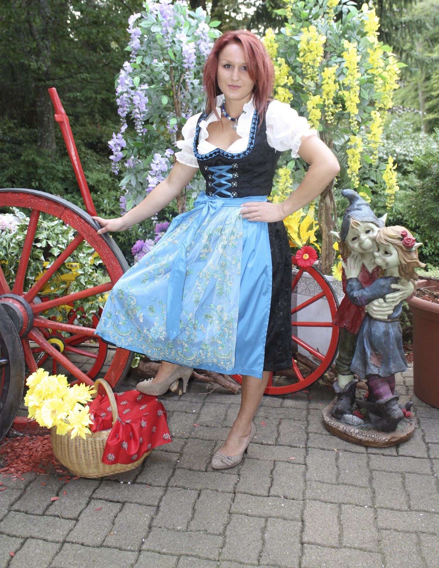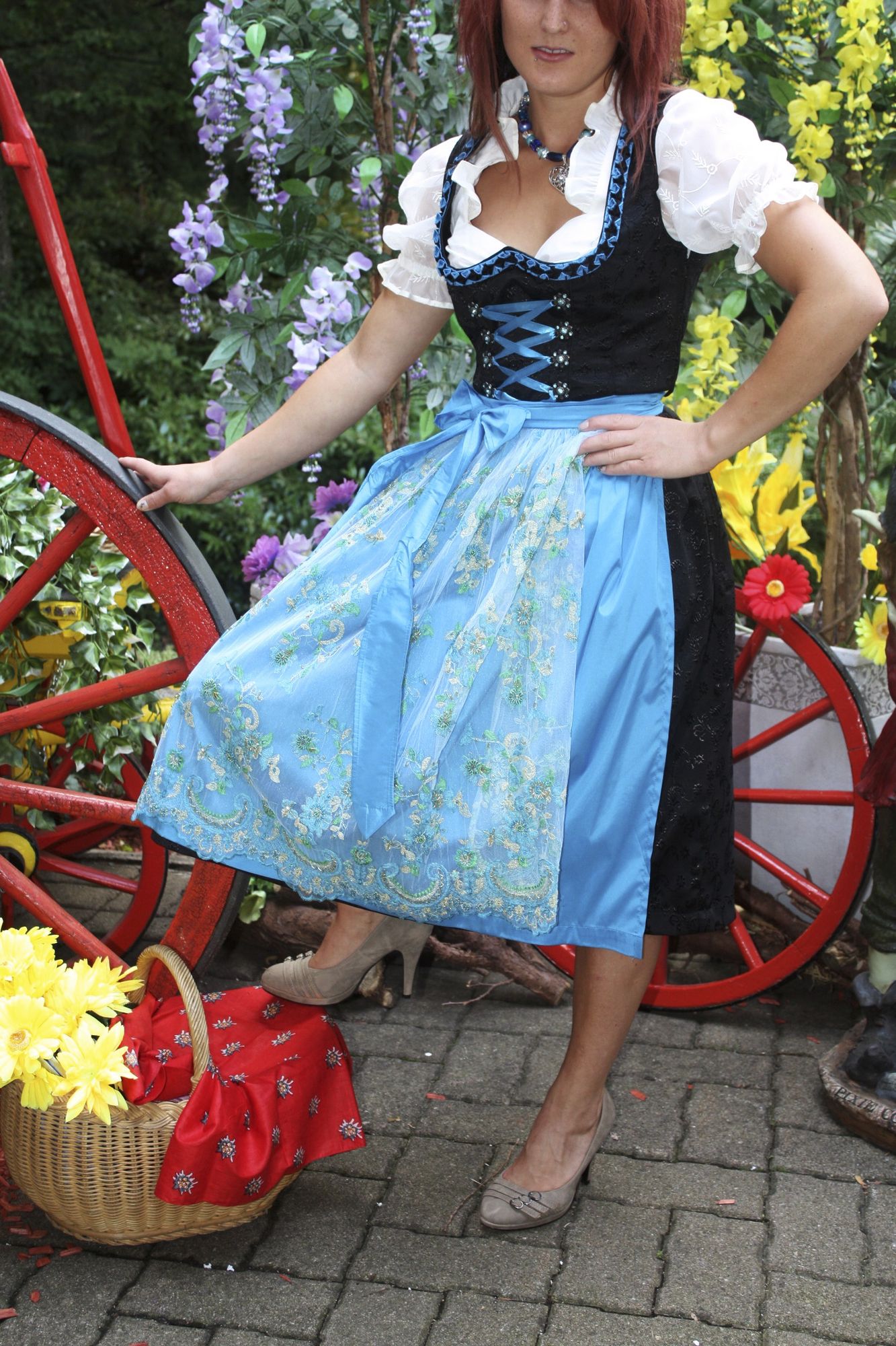 Das dazu perfekte edelblau ,was sich in der schönen Borte, der seidig glänzenden Schnürung und in der Schürze wiederfindet.