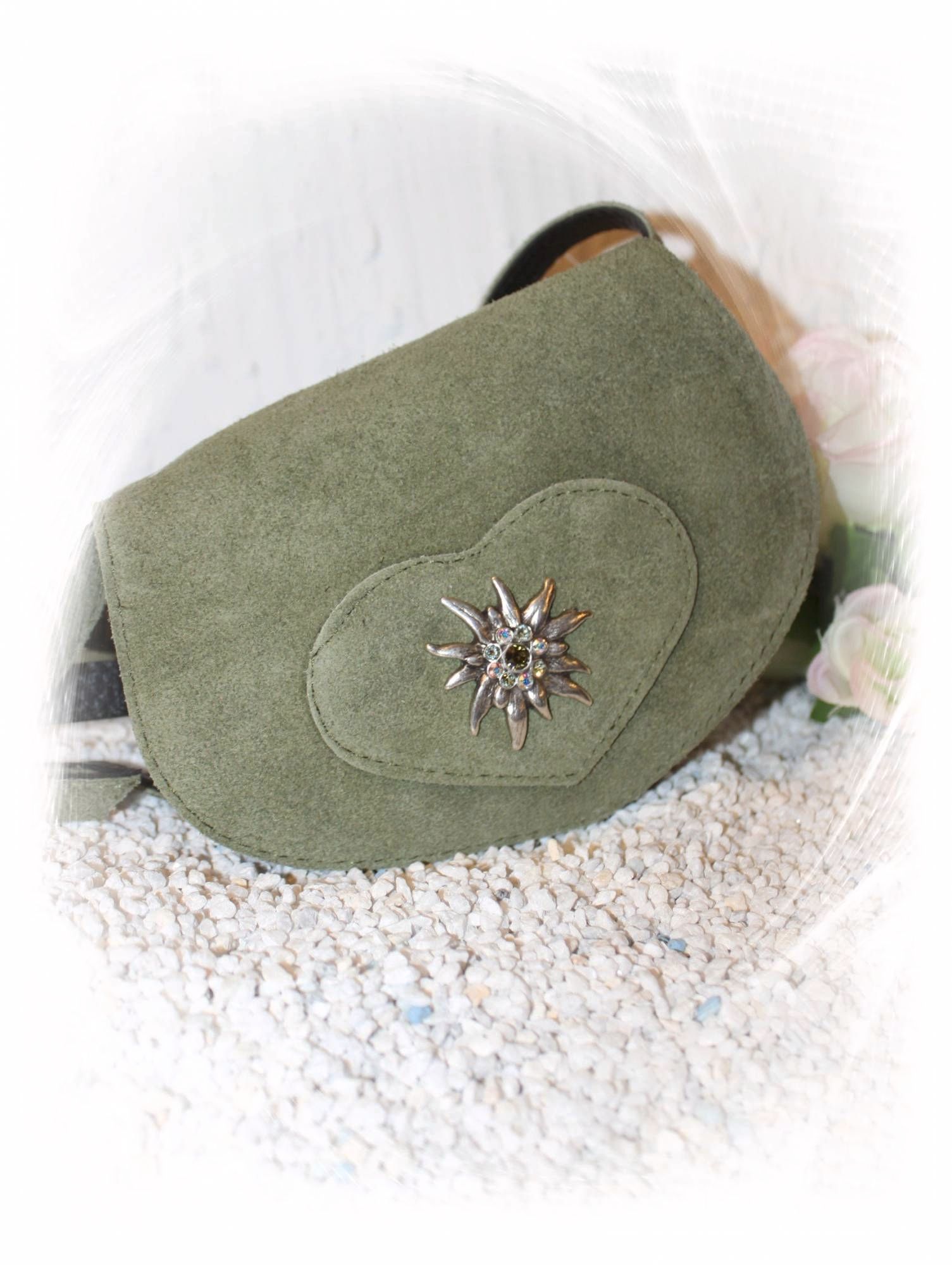 Ein aufgenähtes Herz Ton in Ton mit einem dazu perfekt passendem Edelweiß mit glitzernden Swarovskikristallen.