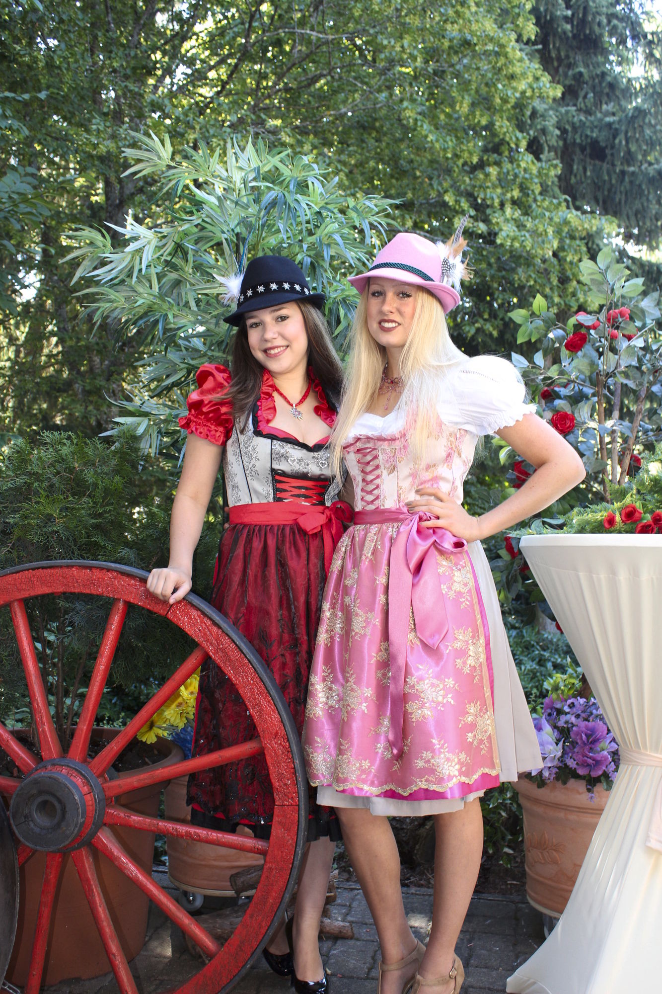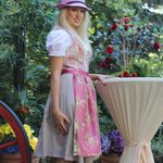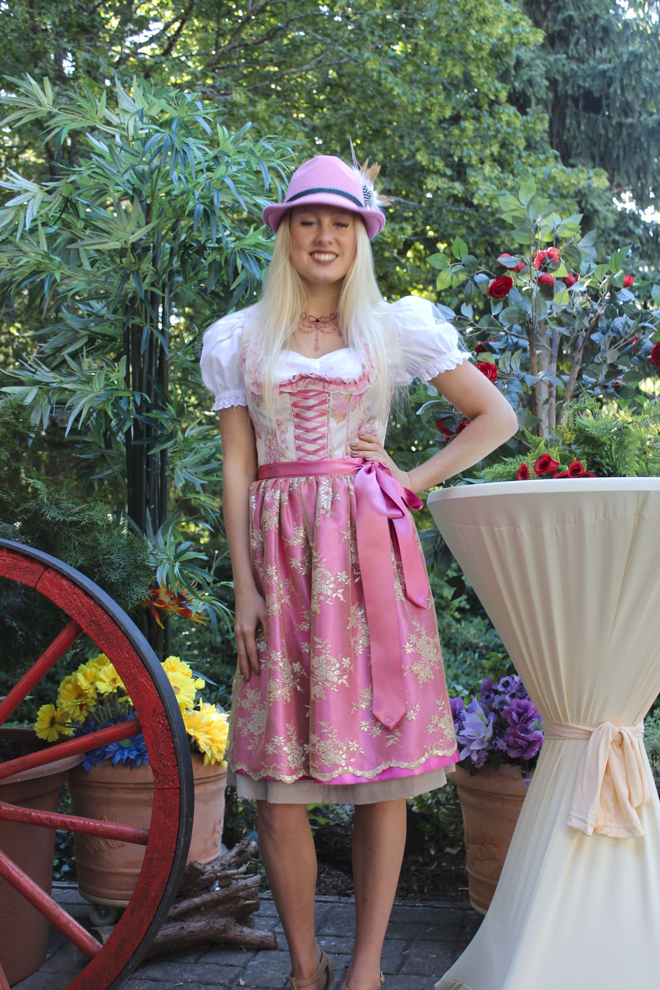 Die Schürze in pink-rosa,sowie die Oberschürze in glänzendem durchsigen goldfarbigem Tuch, machen dieses Dirndl zum absoluten Hingucker
