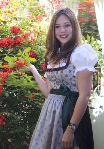 Das Gesamtbild wird perfekt abgerundet durch die silberfarbenen Knöpfen vorne und der ebenfalls seidig glänzender Schürze mit grüner Schleife, silbergrau mit edlem Druckmuster edler Rosen, Ton in Ton, sowie in grün und weinrosa mit silberfarbig schattierenden Hirschen.