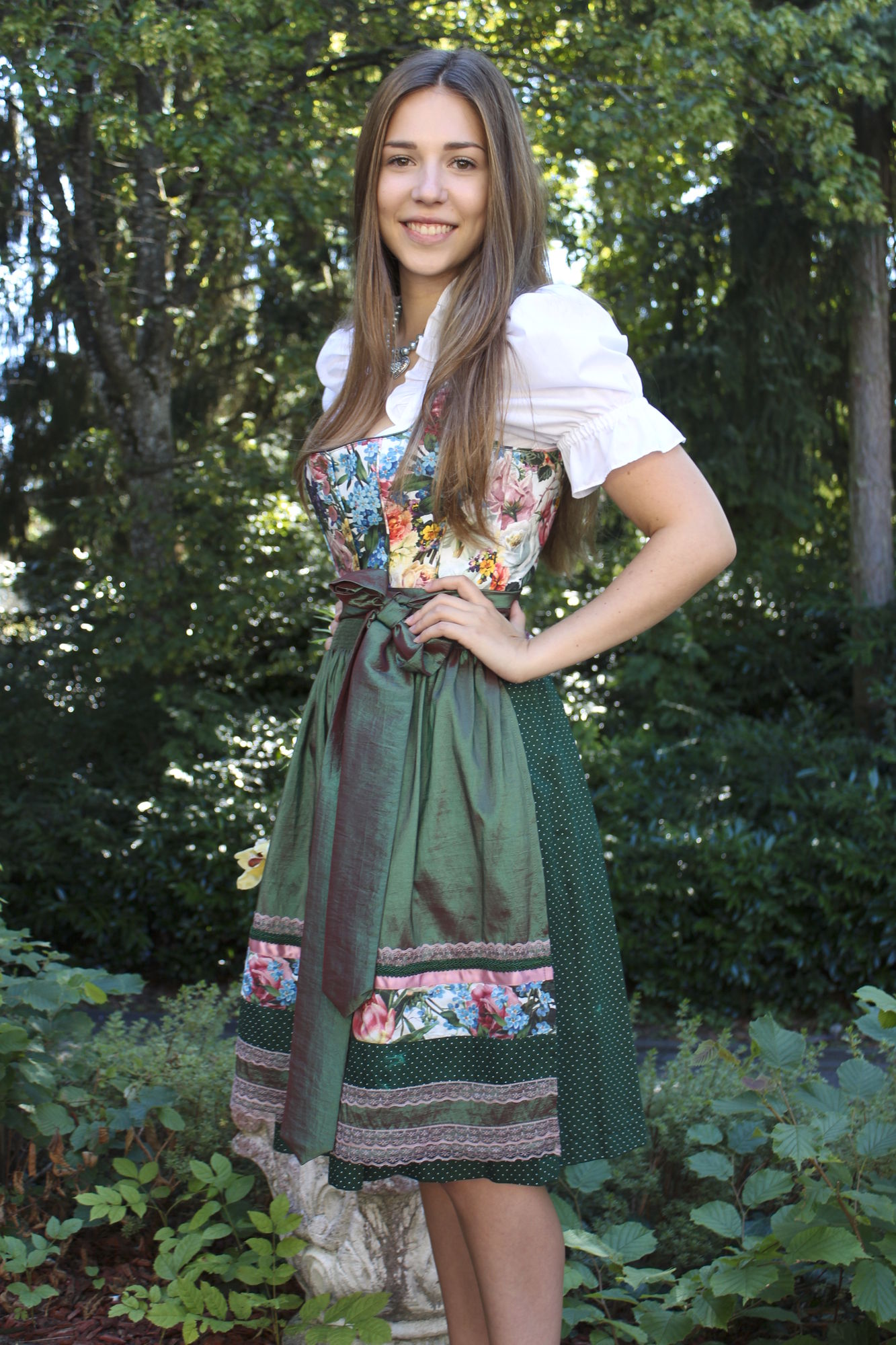 Abgerundet wird dieses edle Dirndl mit einer auffallend schönen Schürze in seidig glänzendem grün.