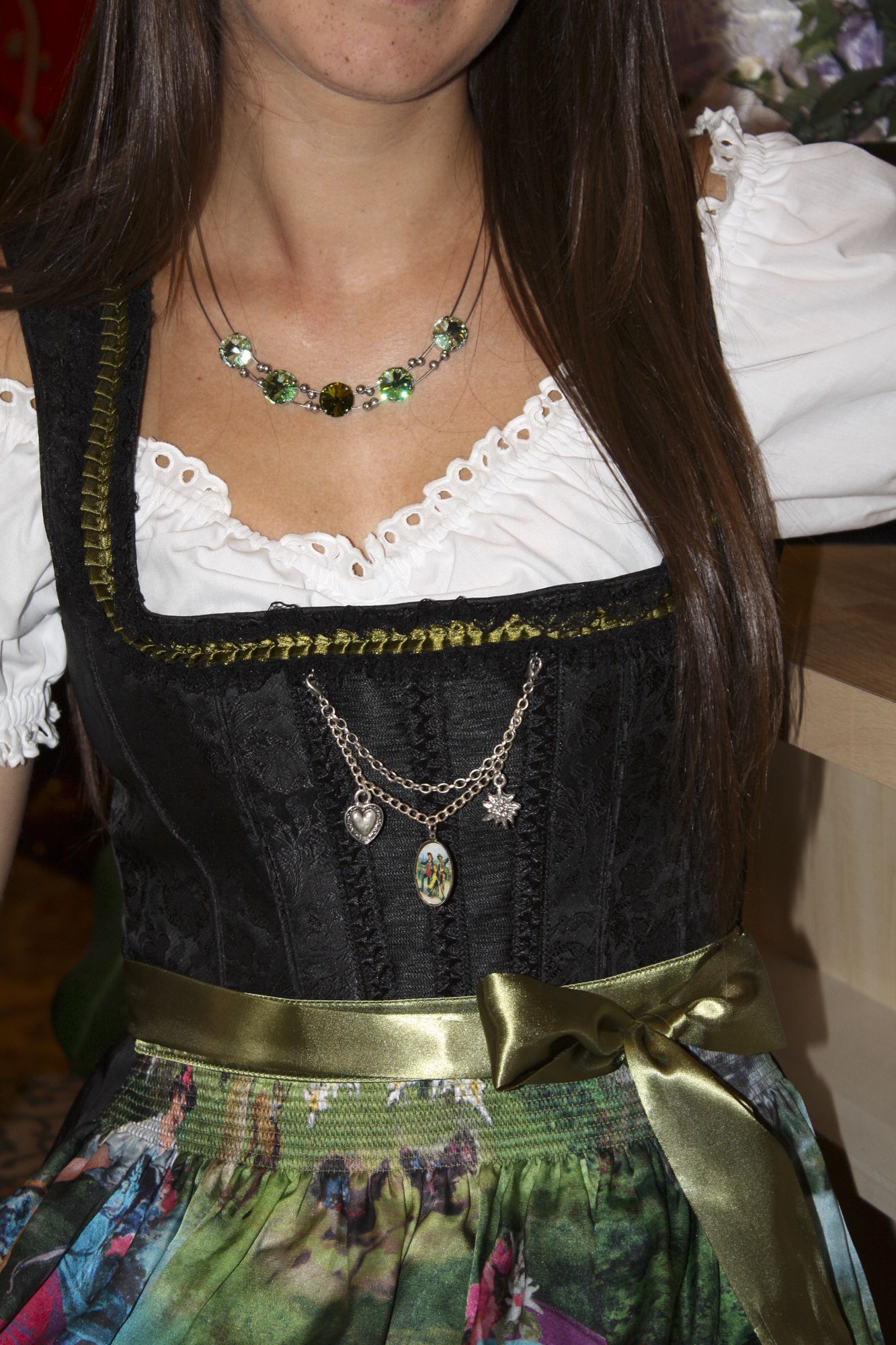 Das Oberteil mit seinem spitzenumsäumten Ausschnitt,der grünschwarzen Borte,sowie das edle Charivari vorne runden das Gesamtbild ab.