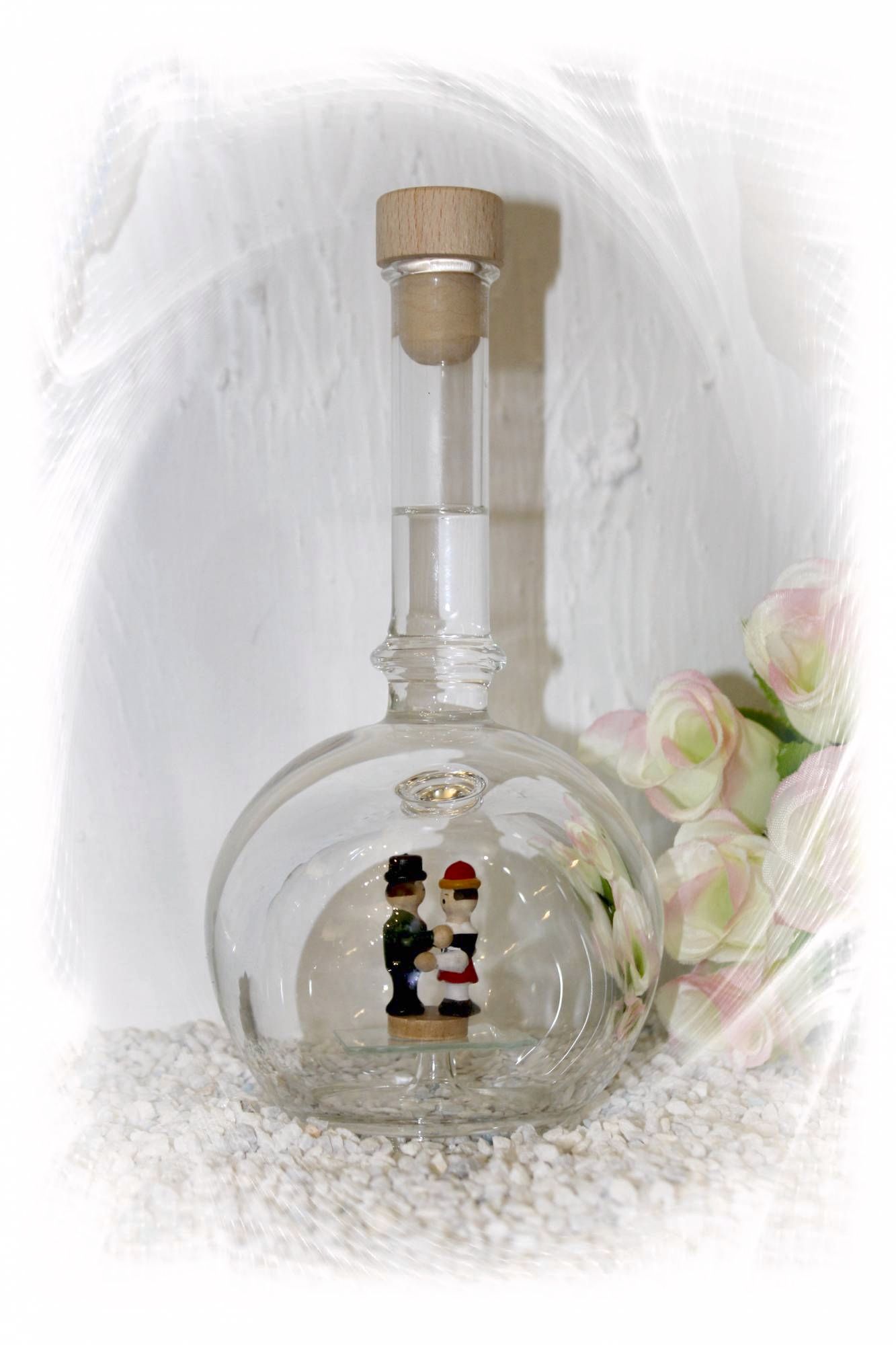 Hier zeigen wir Ihnen eine edle gefertigte Glasflasche mit einem Schwarzwälder Tanzpaar
