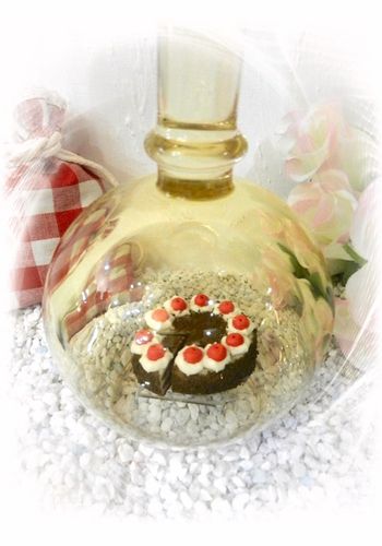 Hier zeigen wir Ihnen eine edle gefertigte Glasflasche mit einer Schwarzwälder Kirschtorte.
