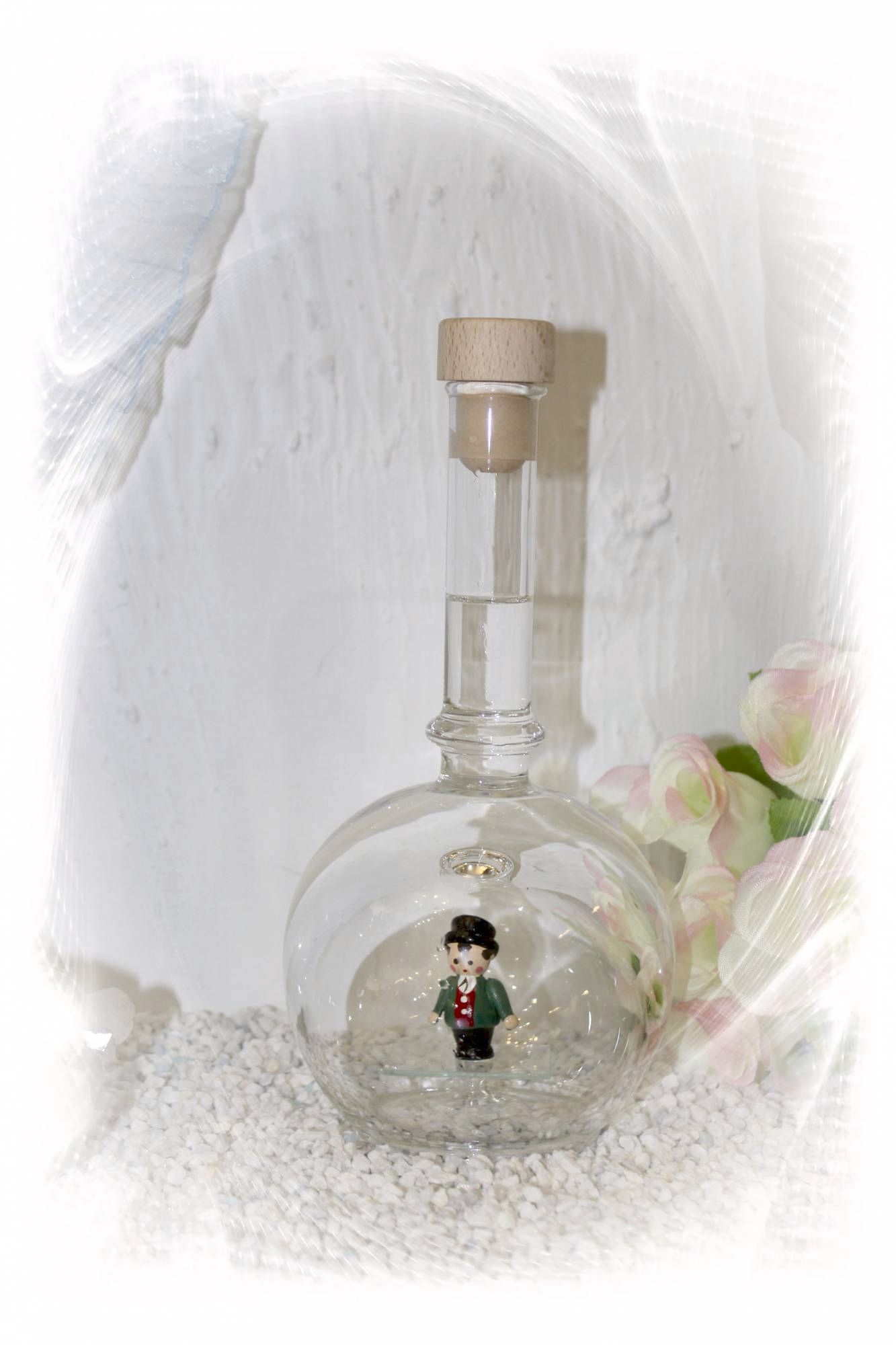 Hier zeigen wir Ihnen eine edle gefertigte Glasflasche mit einem Schwarzwälder Trachtenmännle