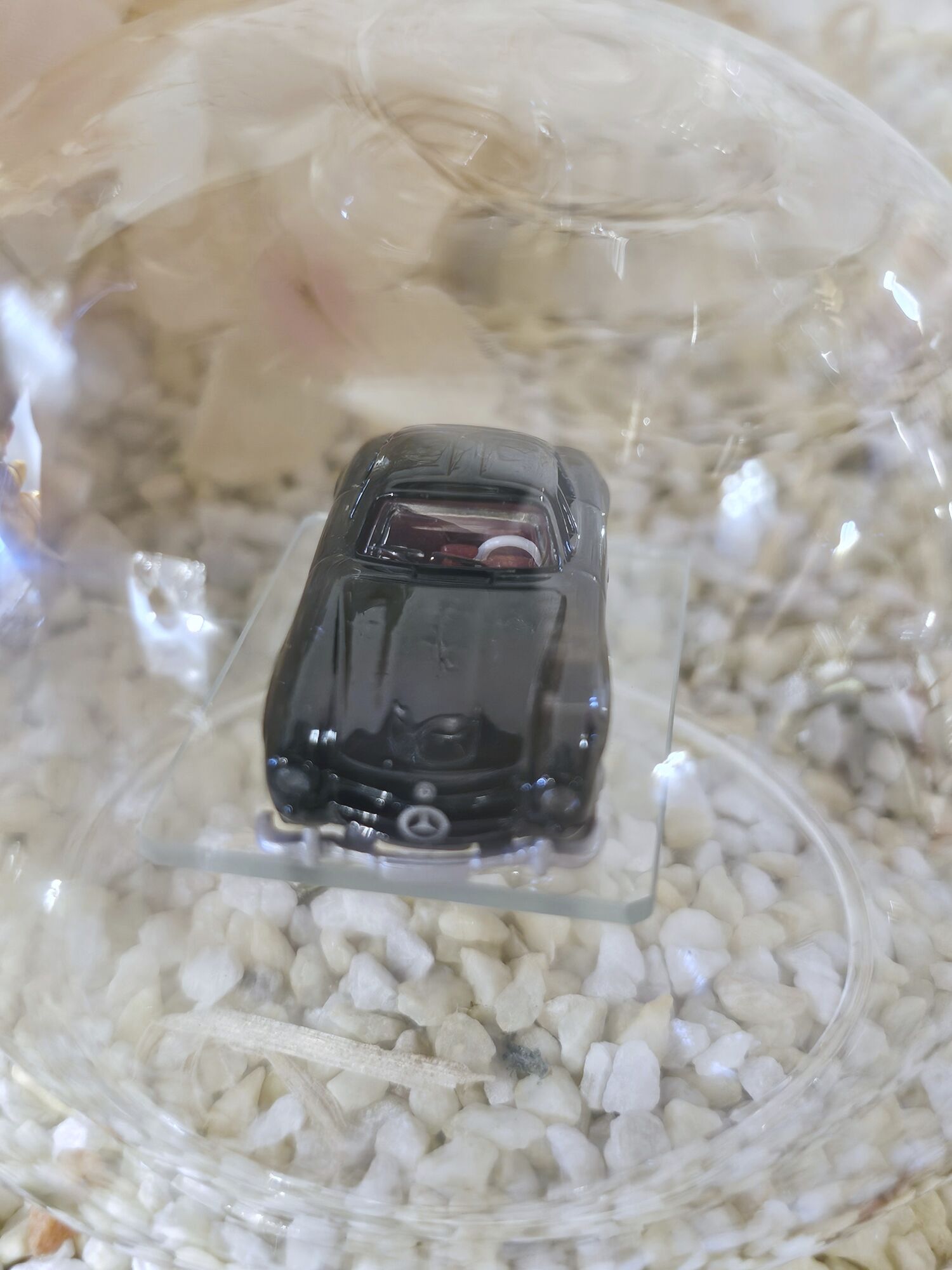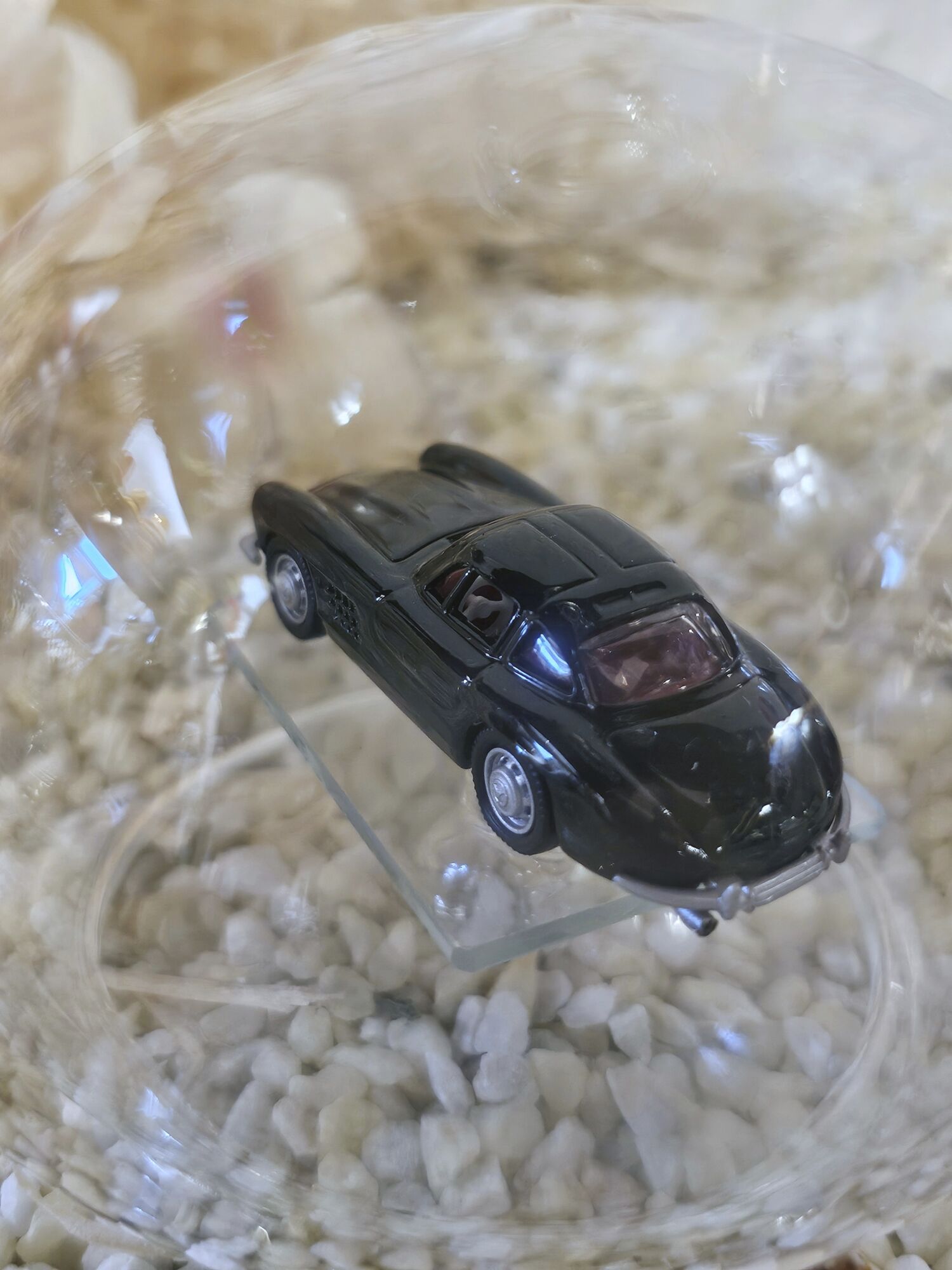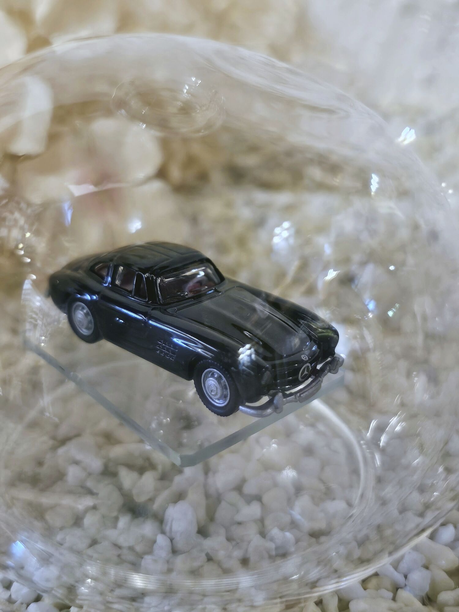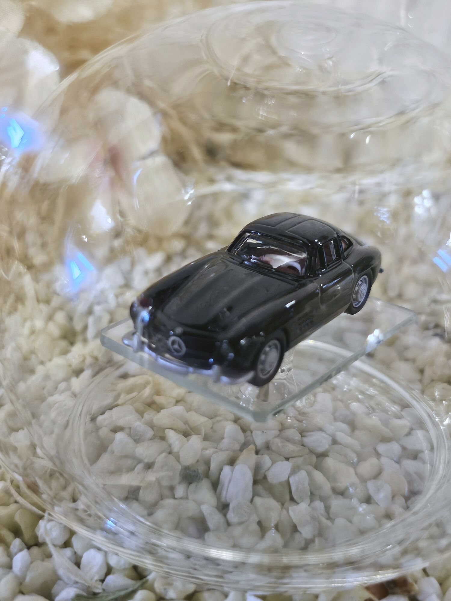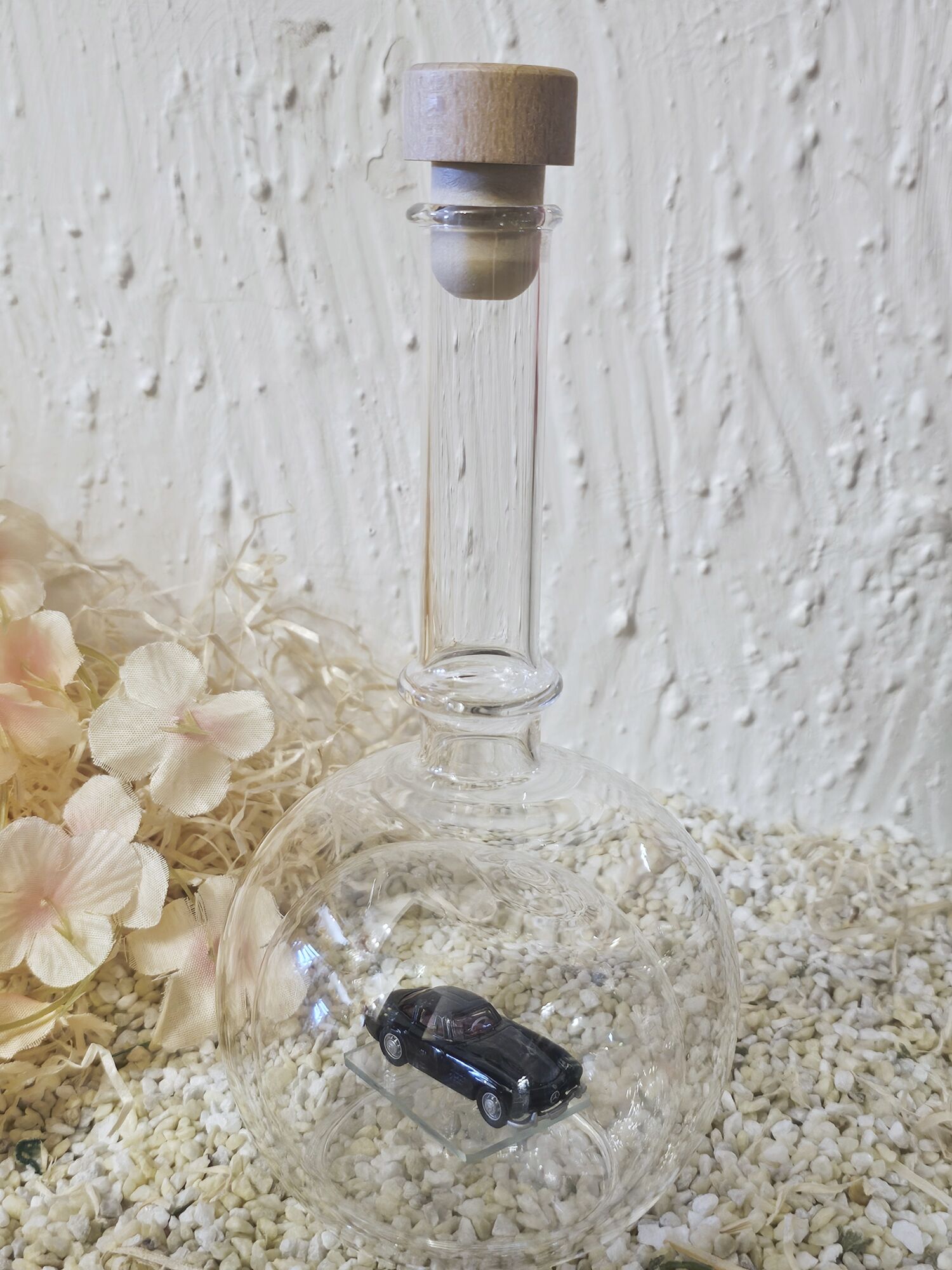 Hier zeigen wir Ihnen eine edle gefertigte, mundgeblasene Glasflasche mit einem Fahrzeug-Modell 1:87 Mercedes 300 SL