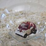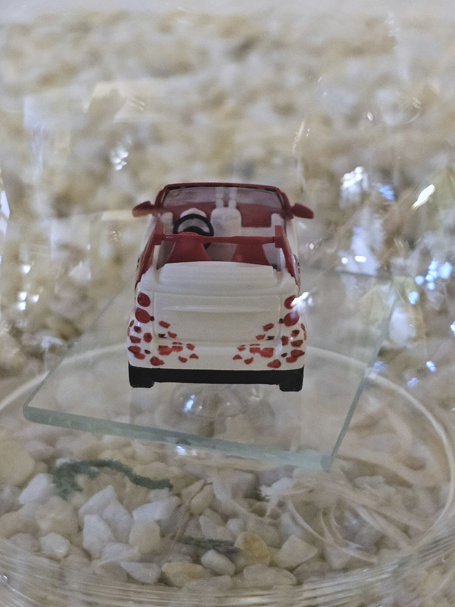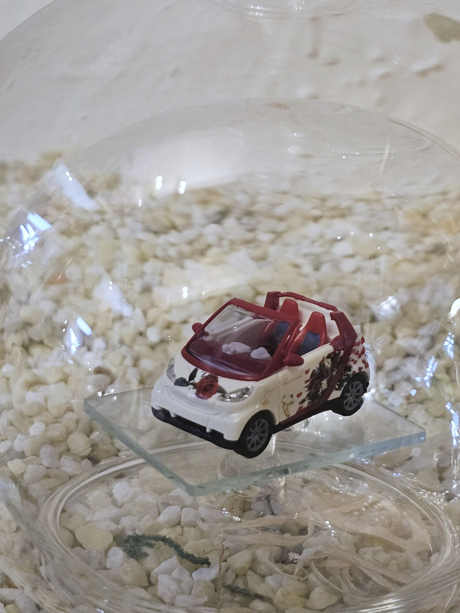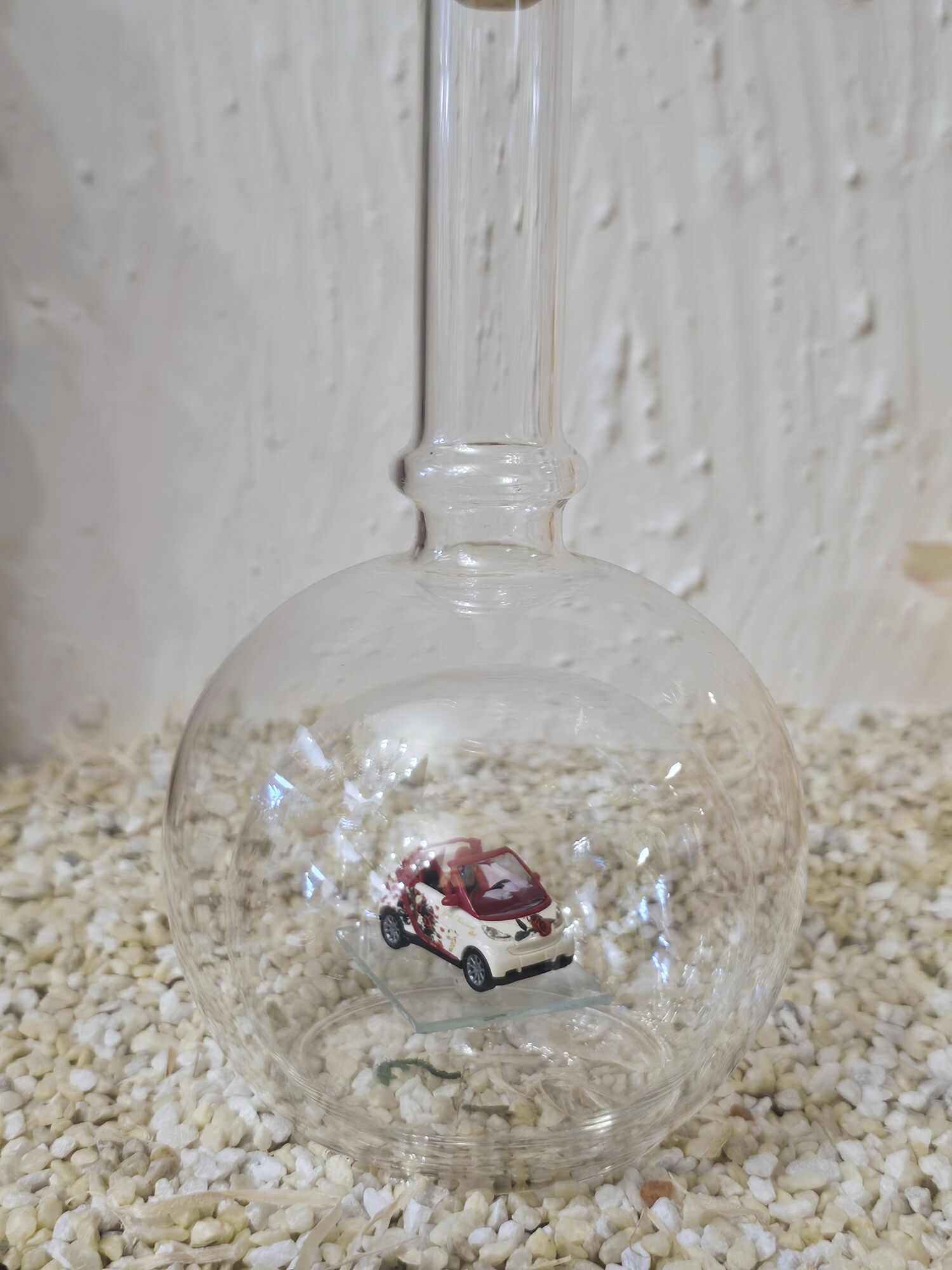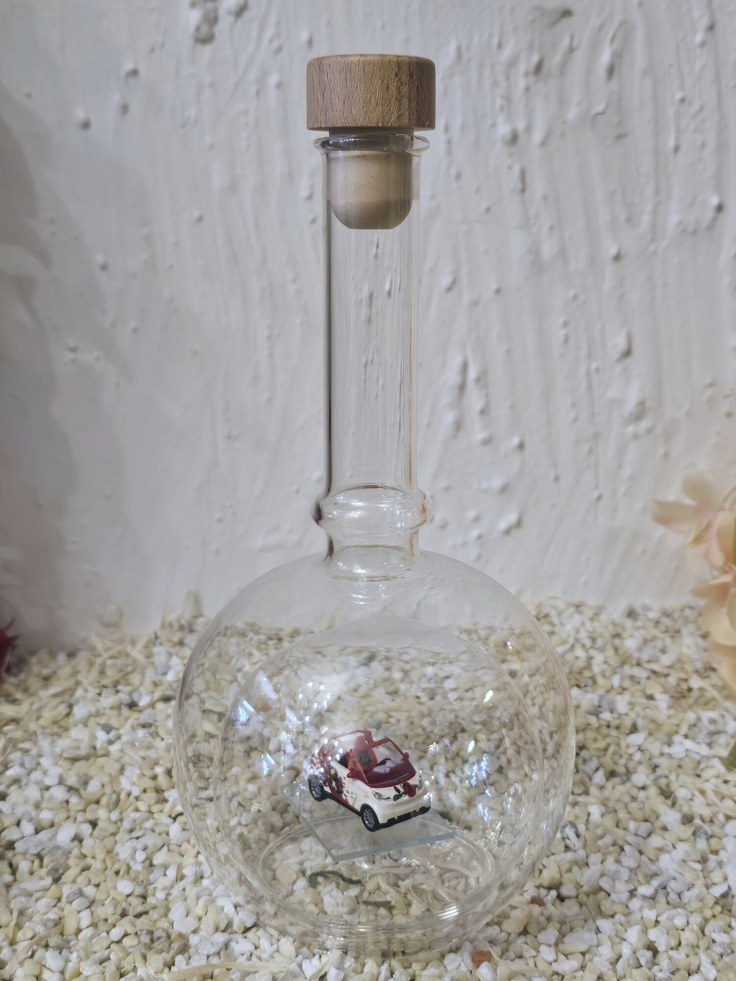 Hier zeigen wir Ihnen eine edle gefertigte, mundgeblasene Glasflasche mit einem Fahrzeug-Modell