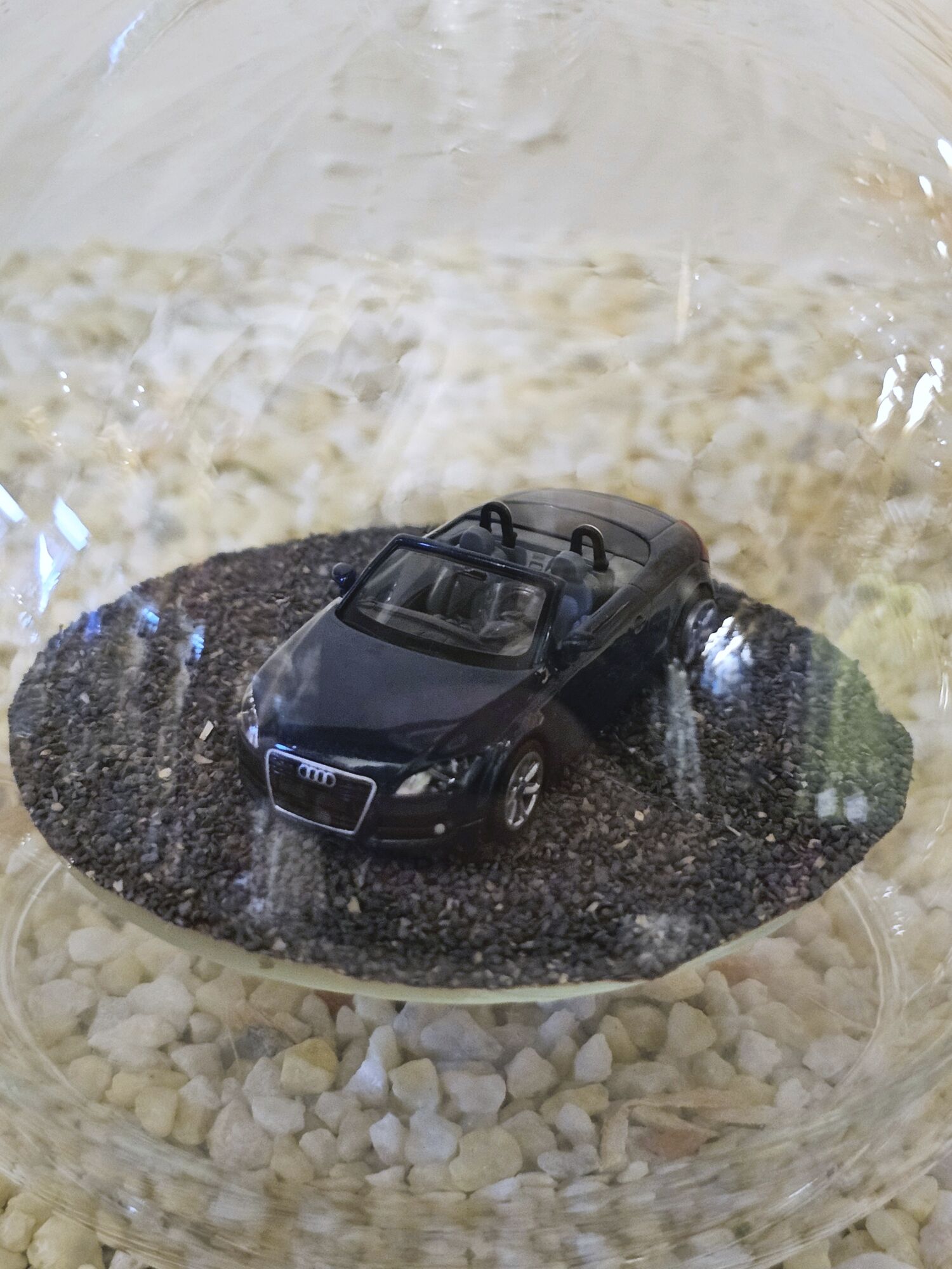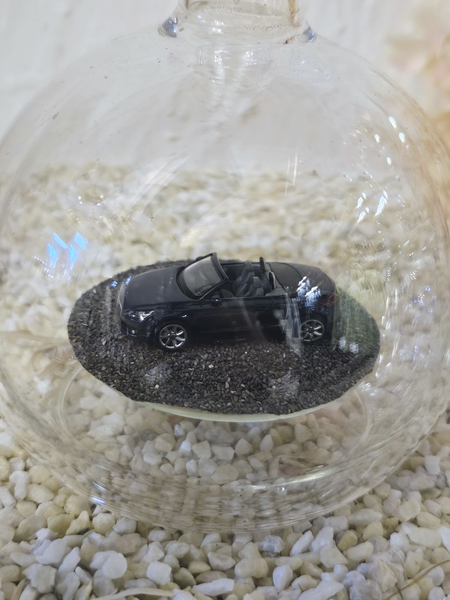 Hier zeigen wir Ihnen eine edle gefertigte, mundgeblasene Glasflasche mit einem Fahrzeug-Modell 1:87 Audi A6 Cabrio schwarz
