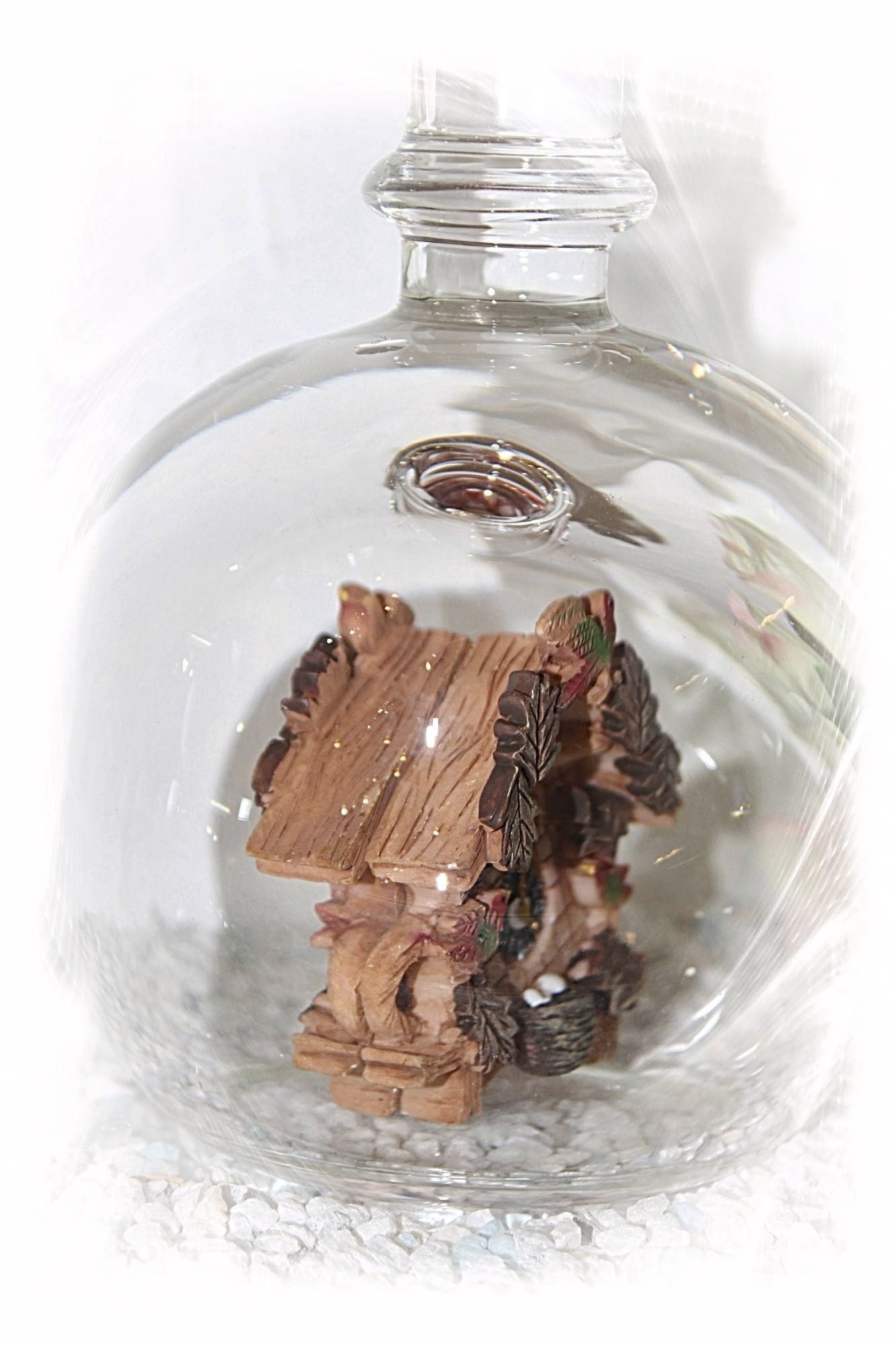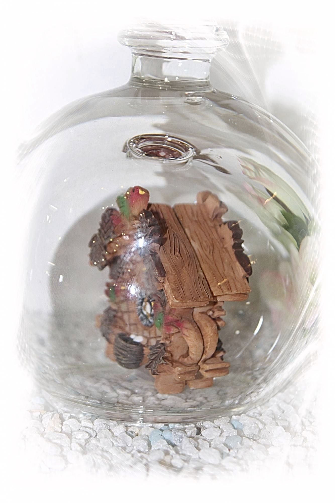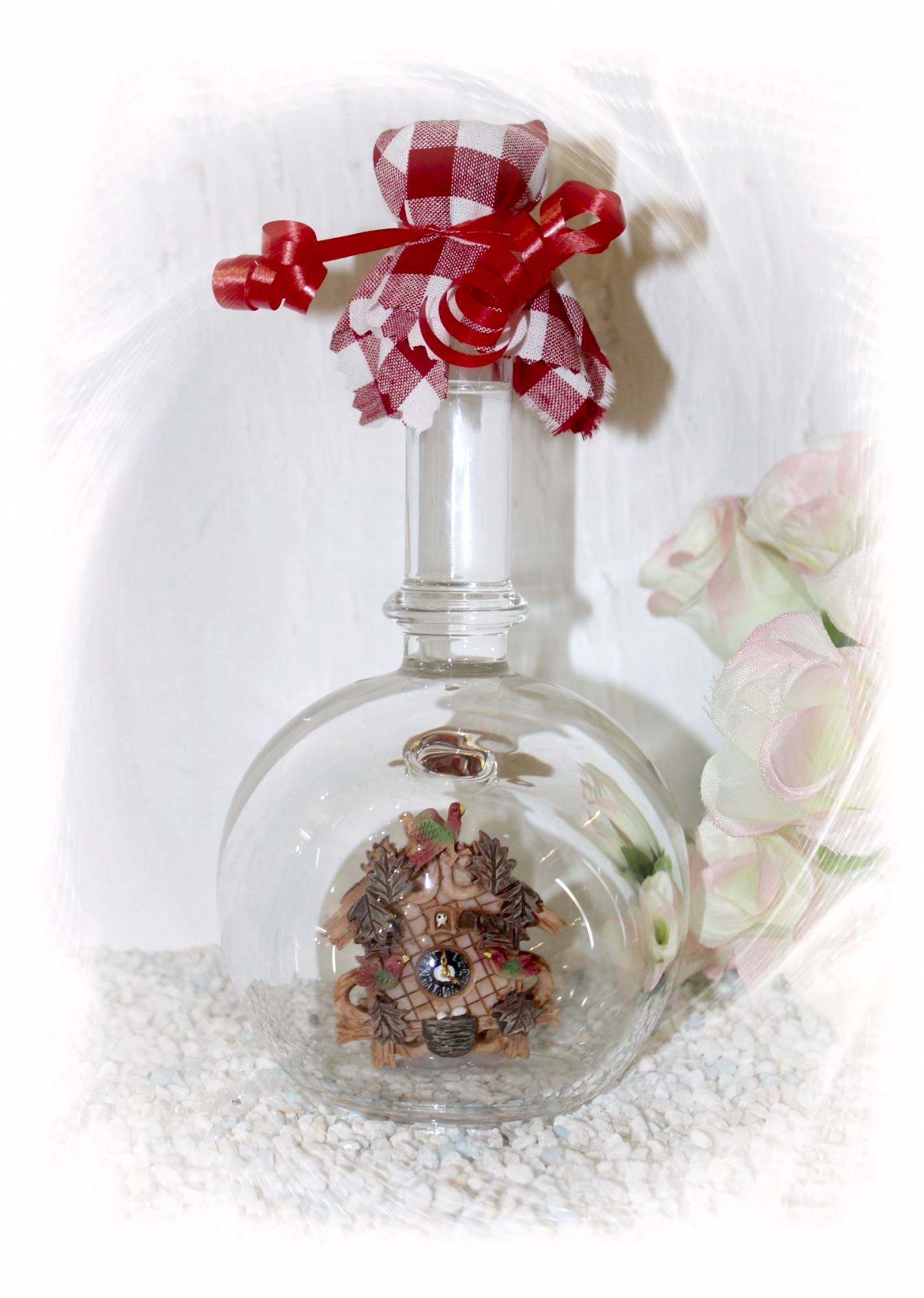 Hier zeigen wir Ihnen eine edle gefertigte Glasflasche mit einer kleinen Schwarzwälder Kuckucksuhr