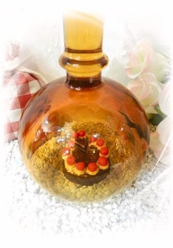 Hier zeigen wir Ihnen eine edle gefertigte Glasflasche mit mit einer Schwarzwälder Kirschtorte.