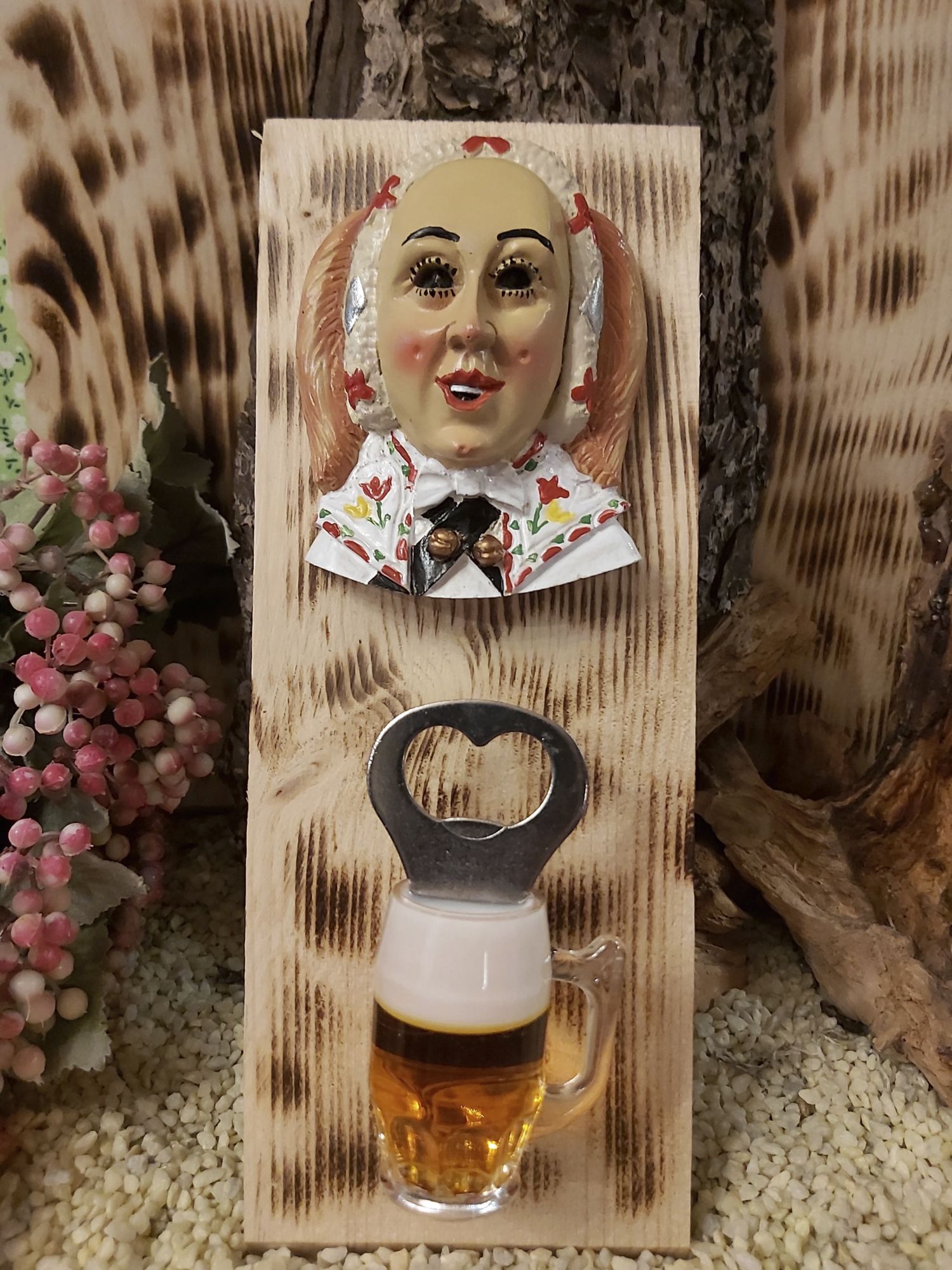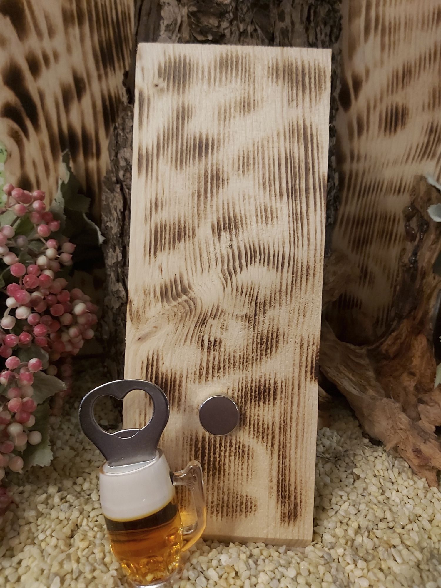 Sie sind aus Holz und von uns geflämmt mit einem Flaschenöffner als Magnet.