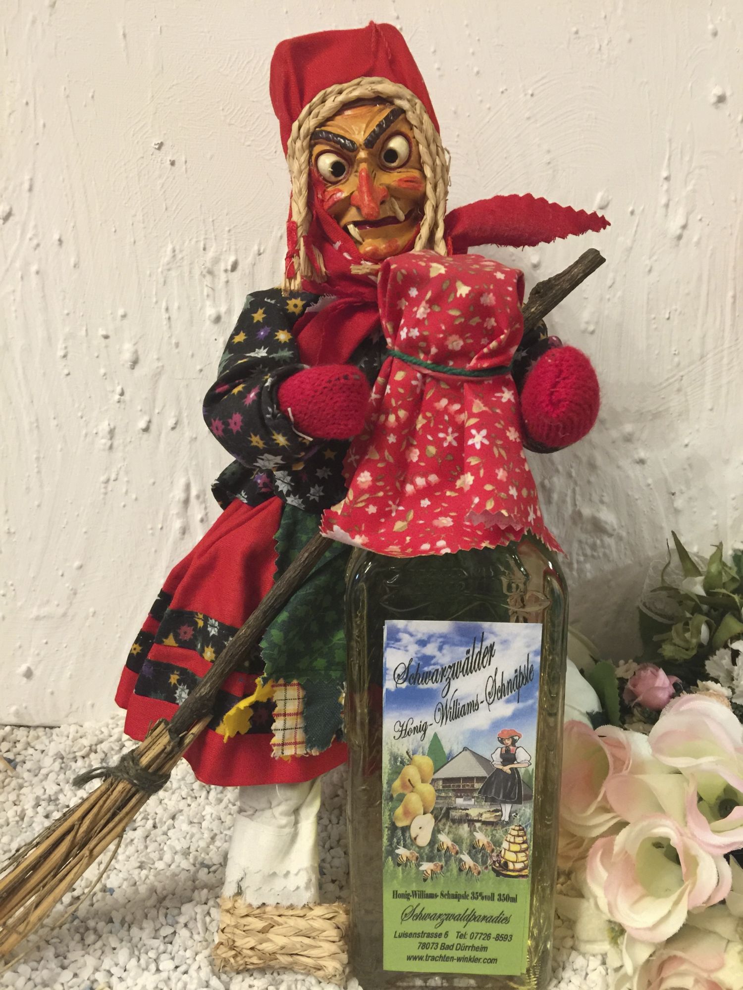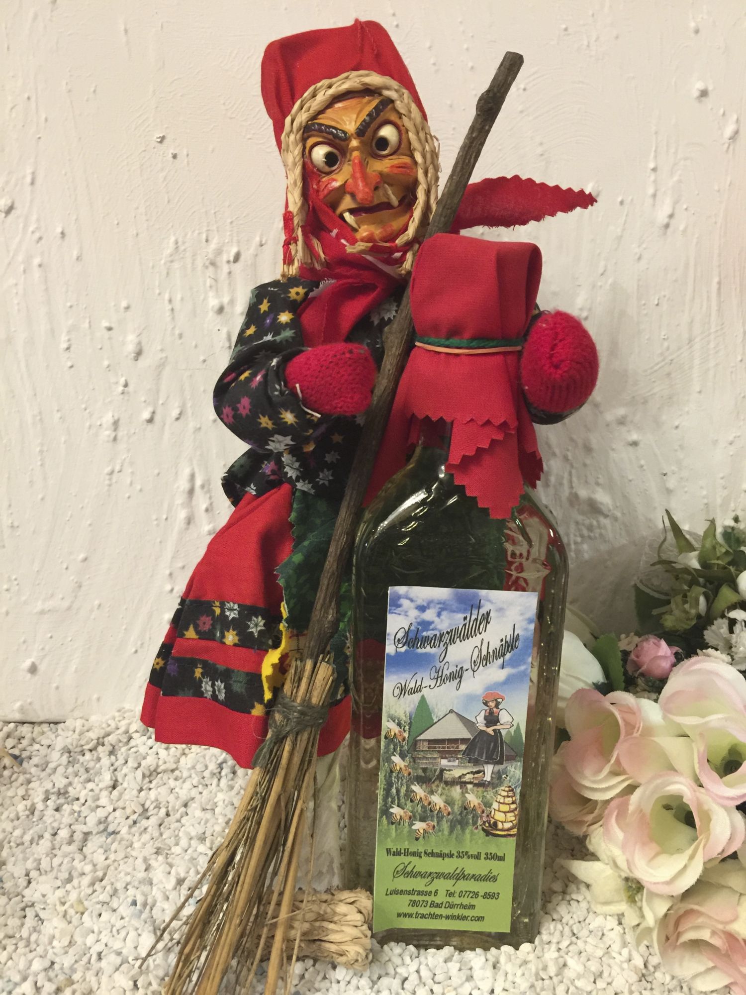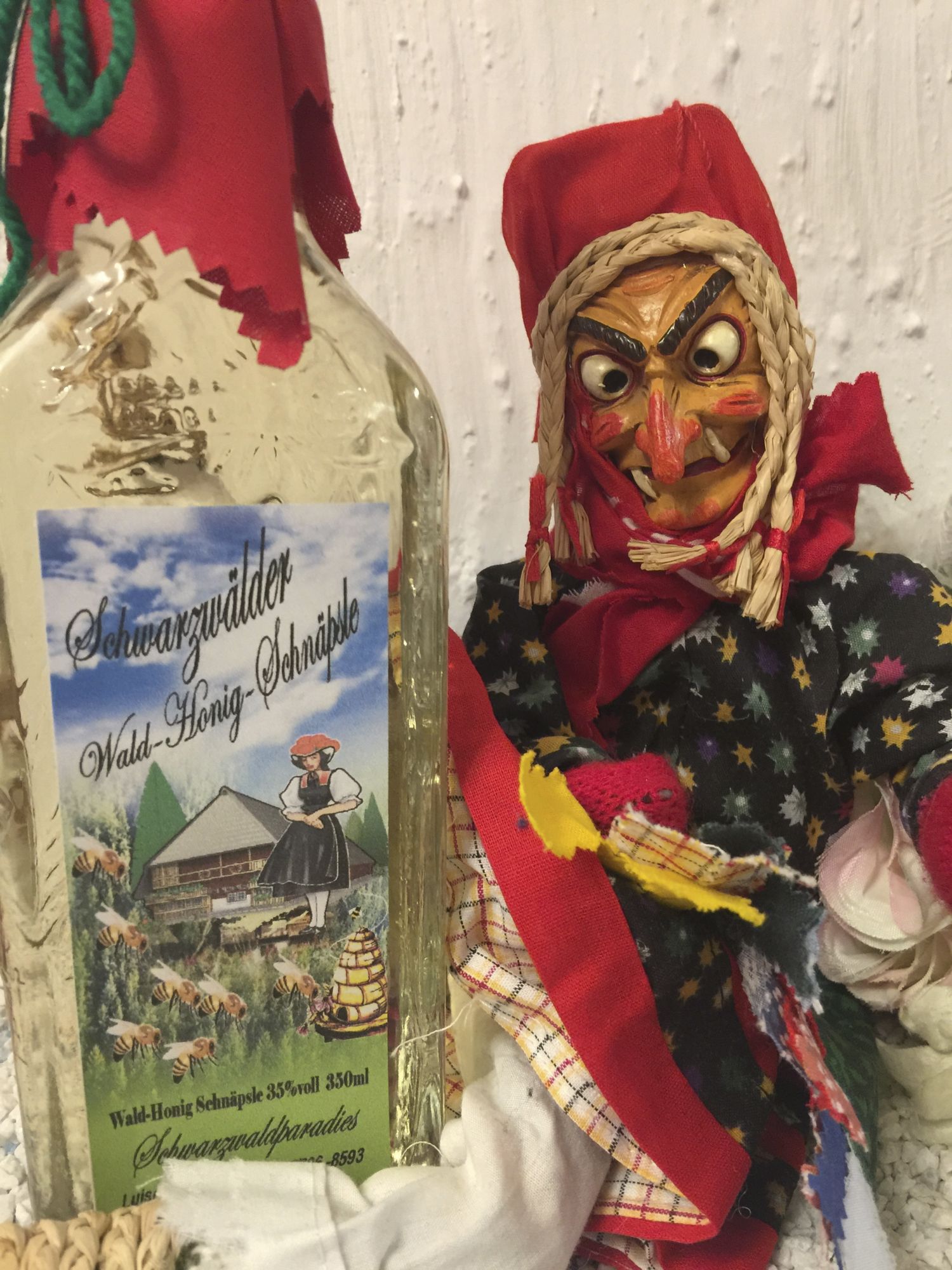 Der Begleiter dieser frechen Hexe ist ein Schwarzwälder Honig-Schnäpsle