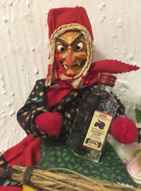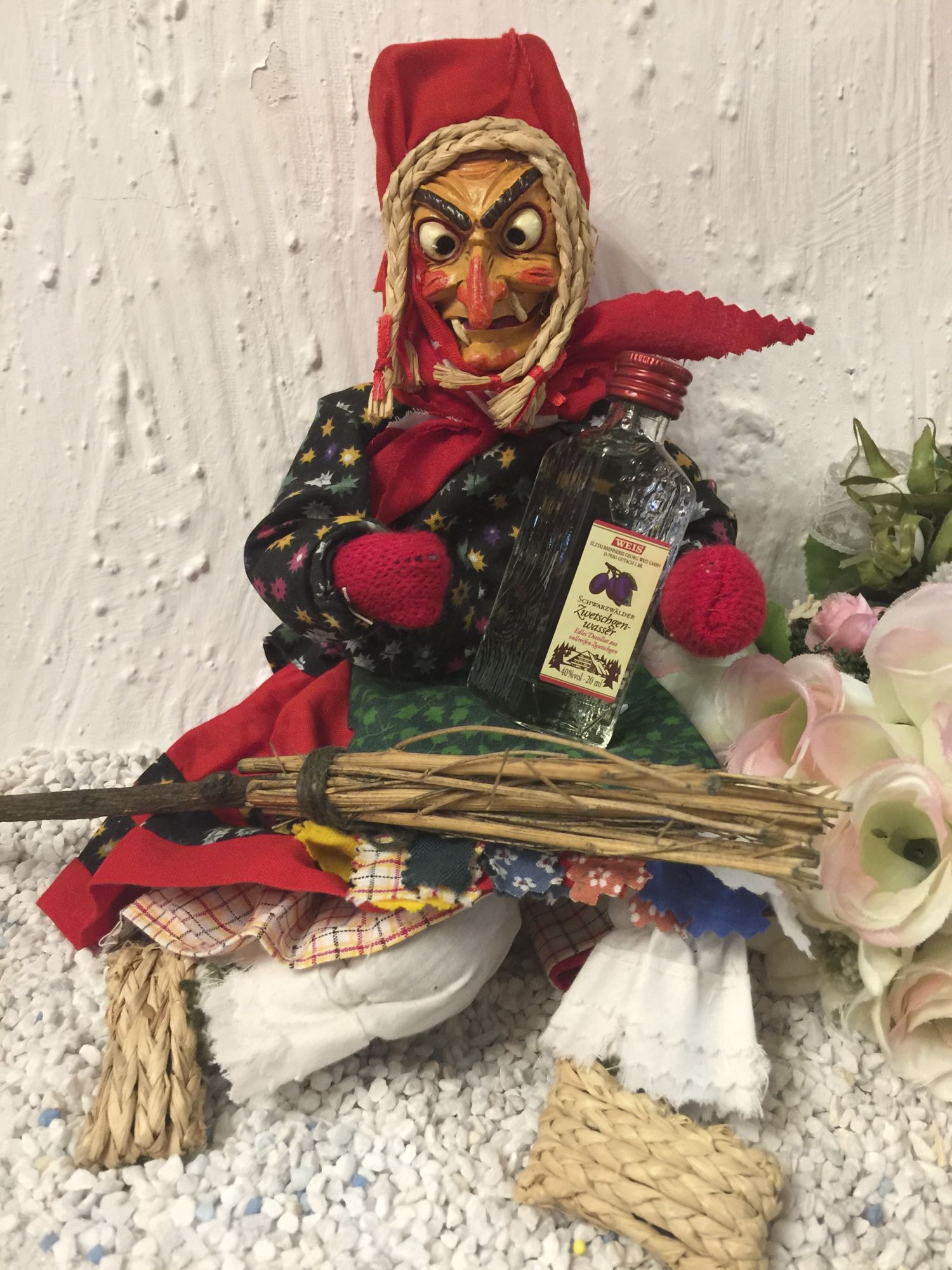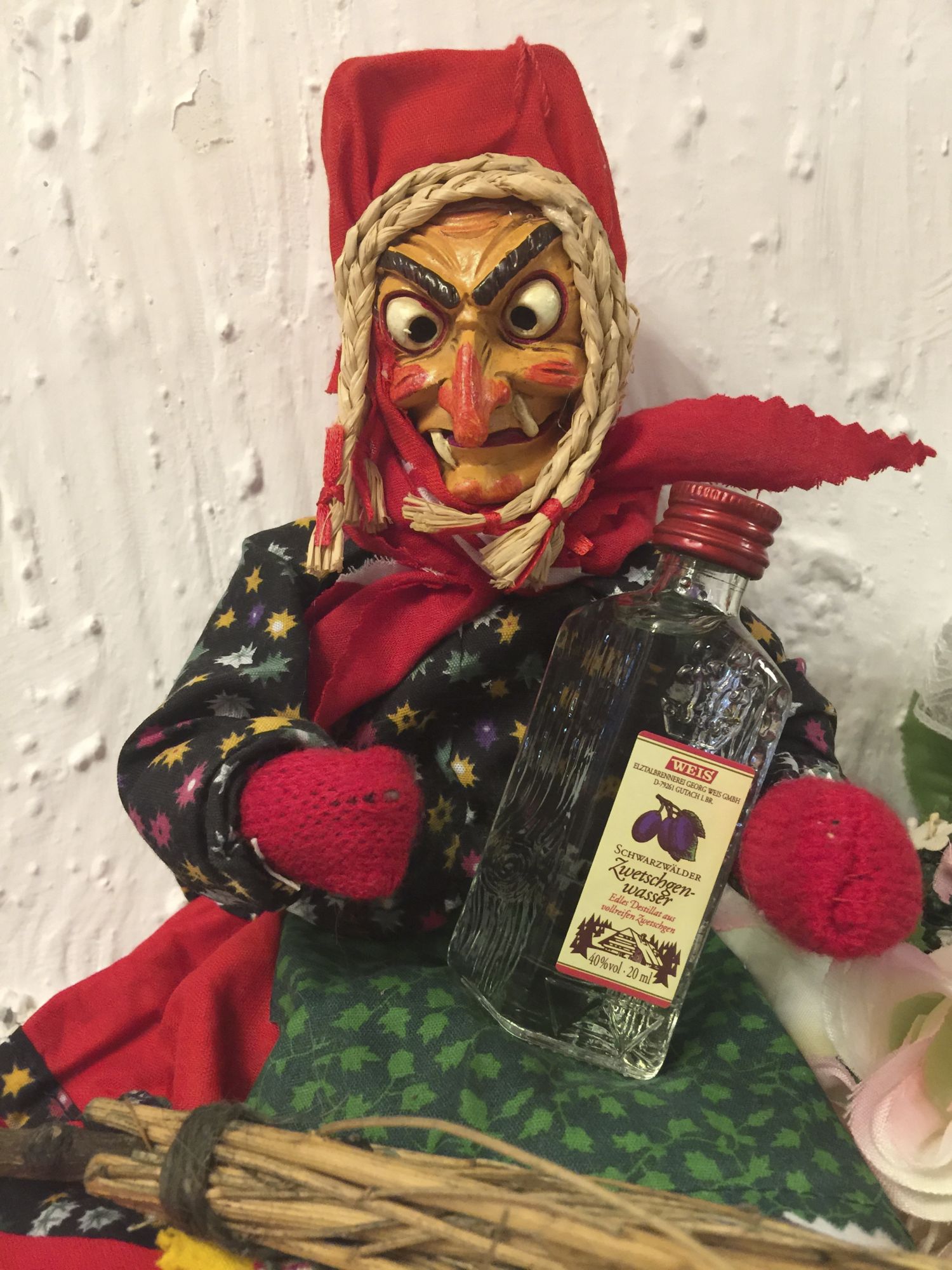 Die freche Hexe hat ein kleines rustikales Schnäpsle dabei.