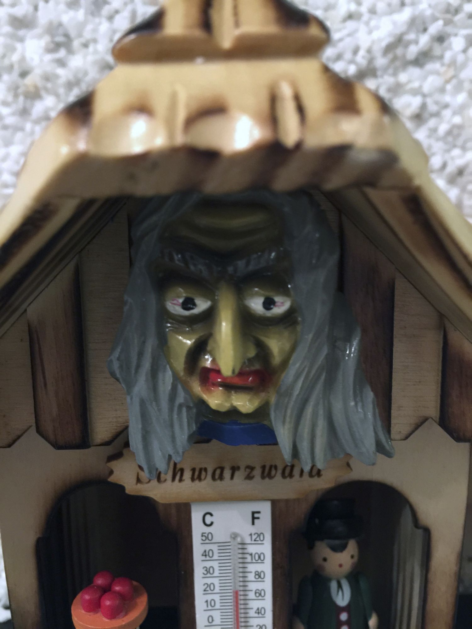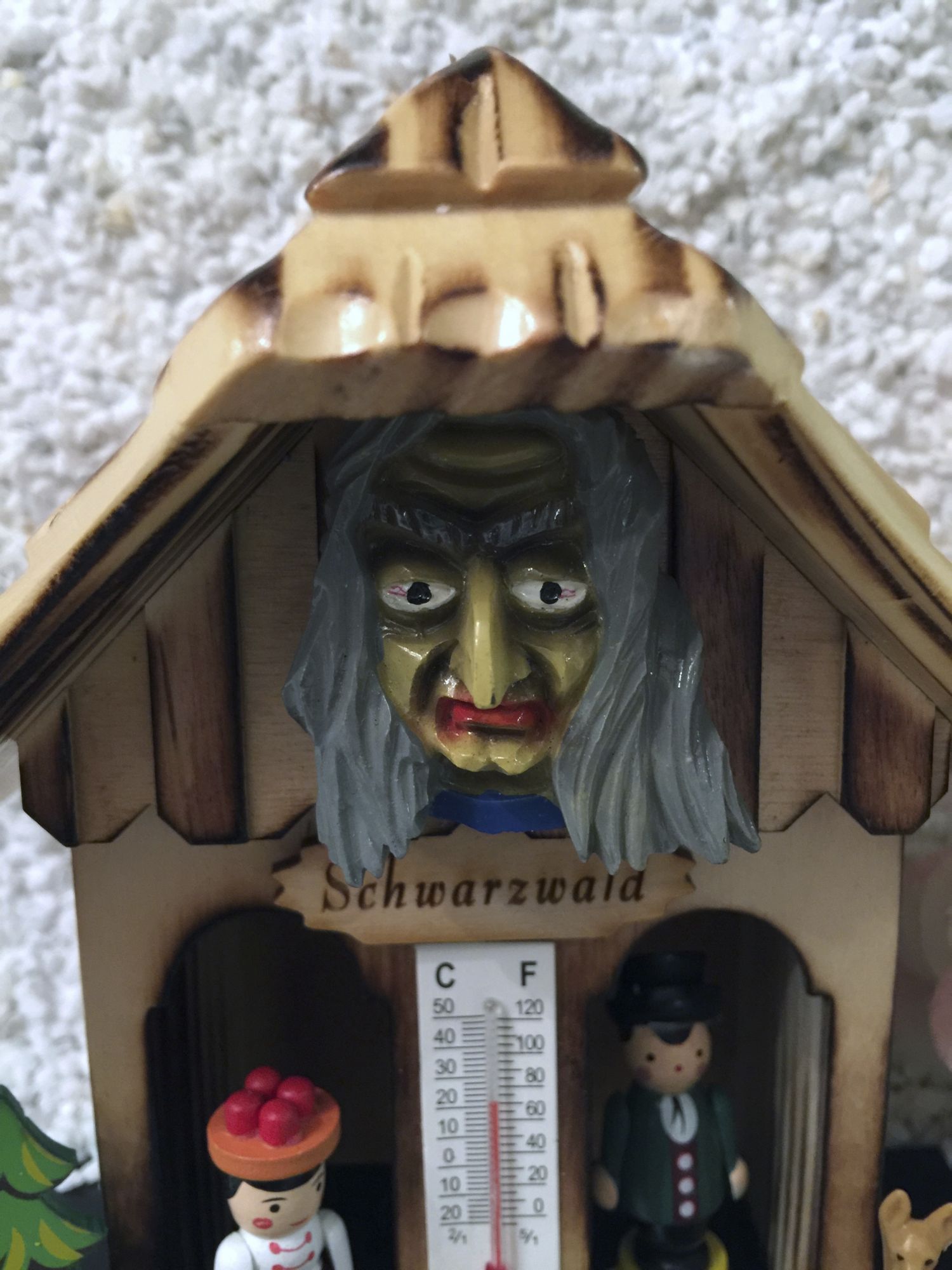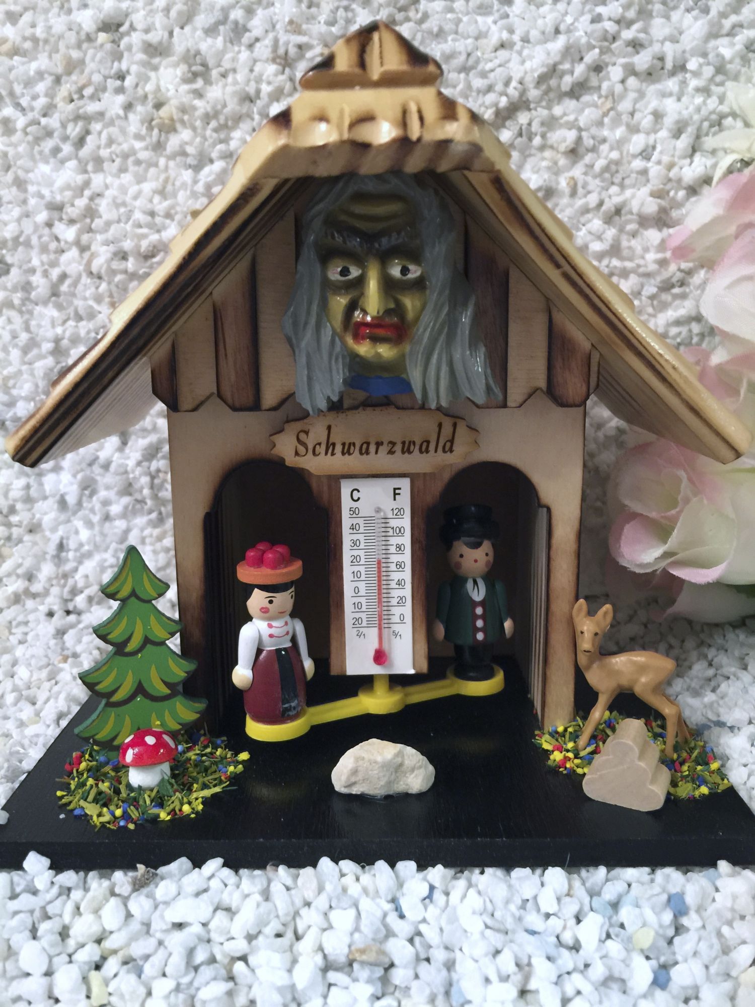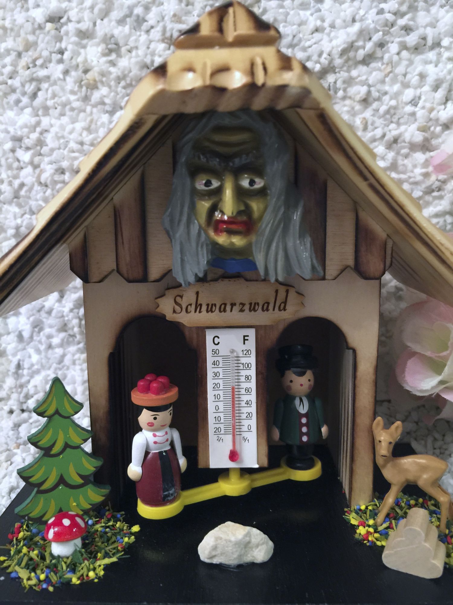 Dieses Wetterhäusle mit handgefertigten und handbemalten Fastnachts-Mäskle, ist besonders aufwendig gearbeitet