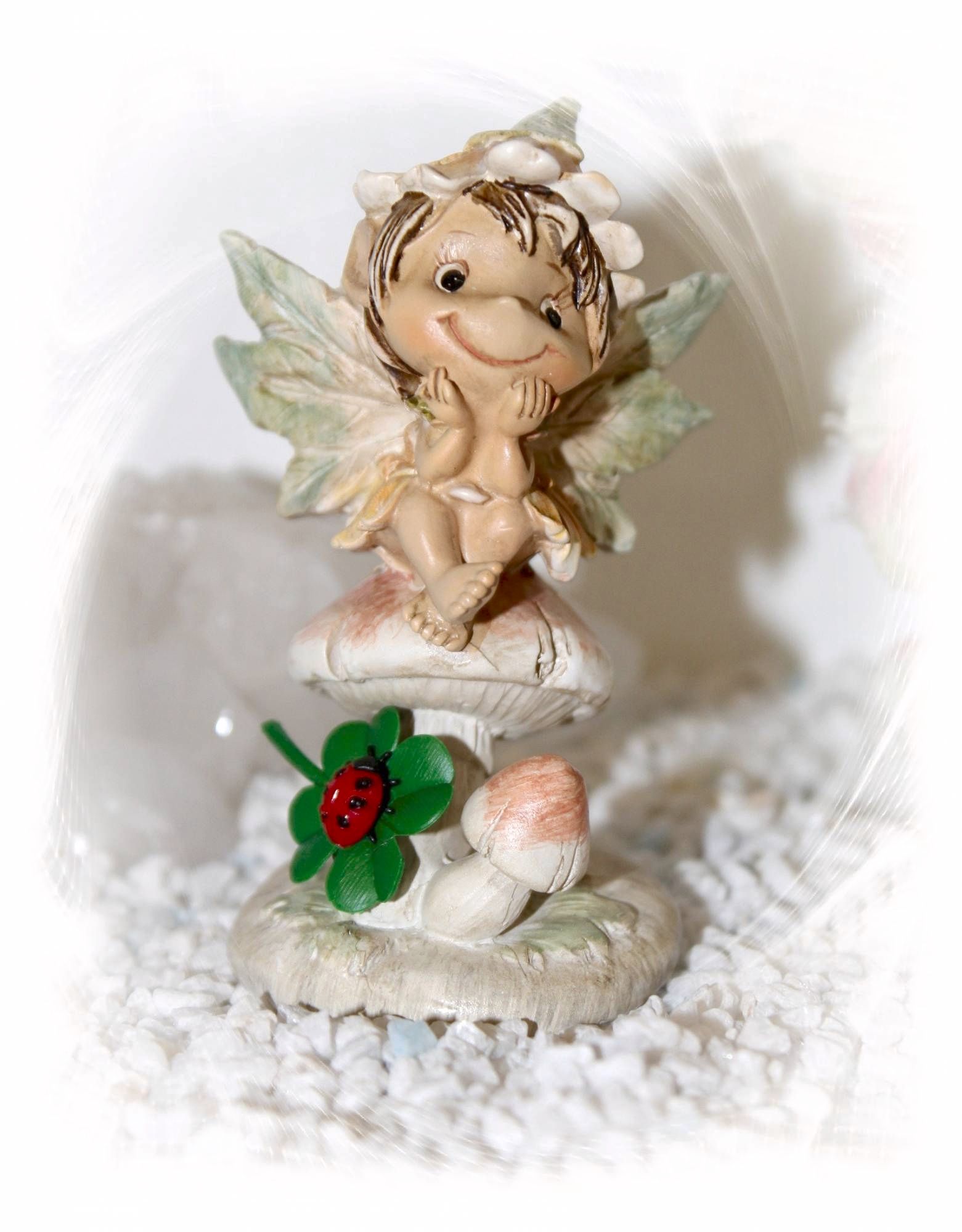 138870 Glückselfe "Reffi" auf Pilz mit Glückskäfer und Kleeblatt