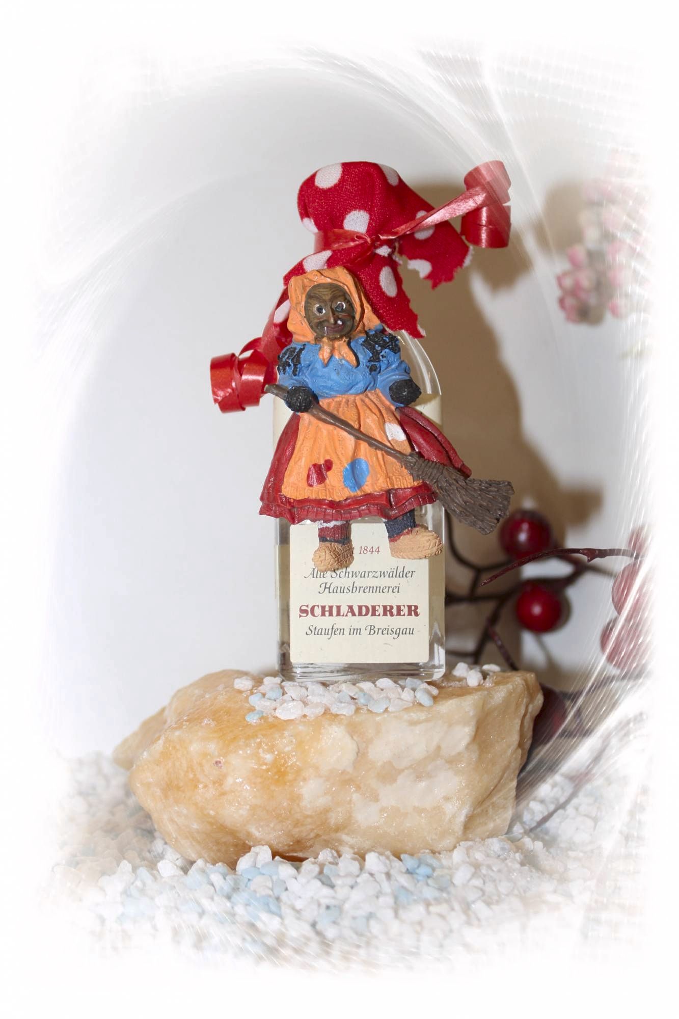 Hier bieten wir Ihnen eine schöne Miniaturflasche aus der Schwarzwaldbrennerei Schladerer mit einer Miniatur Schwarzwald-Hexe an.