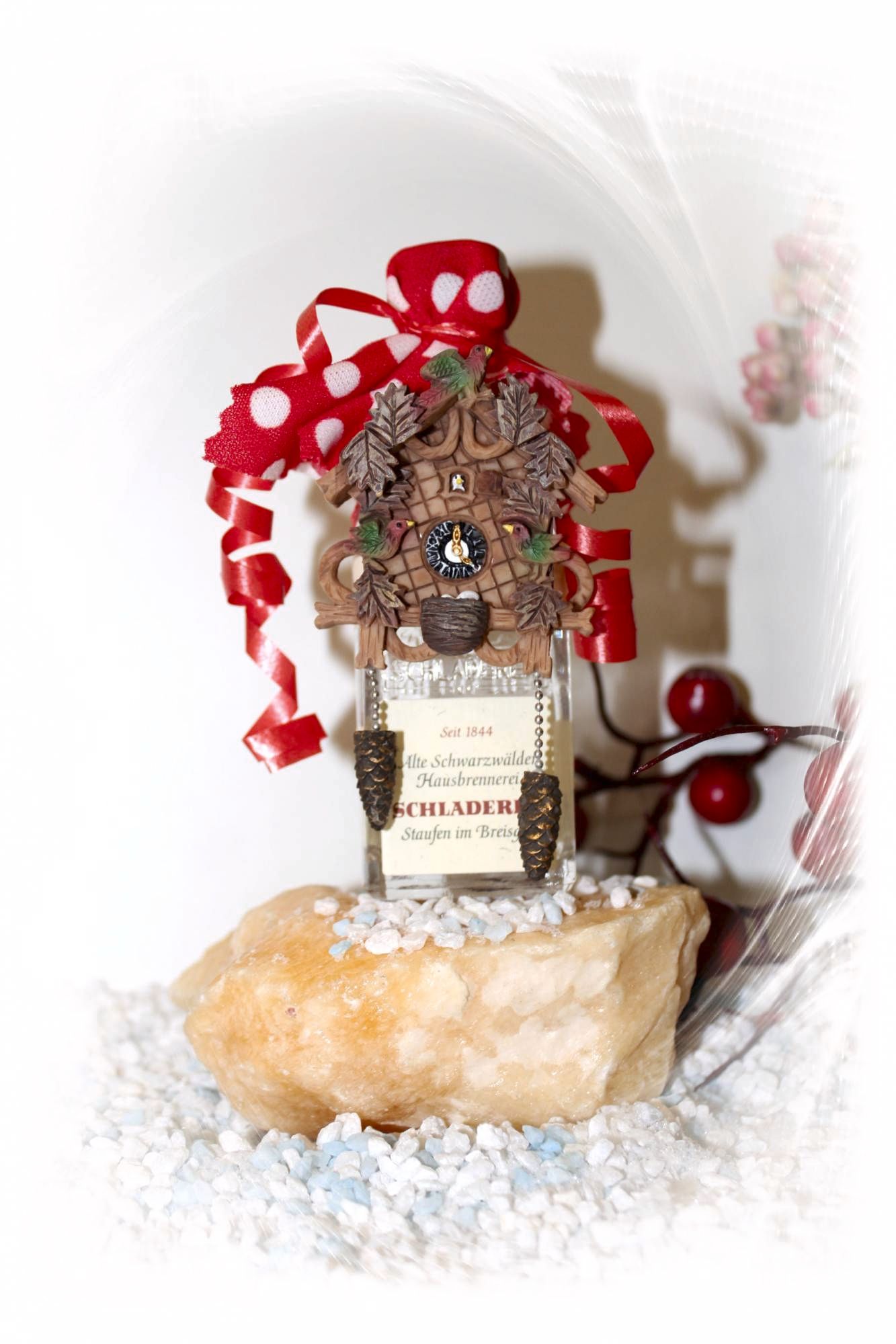 Hier bieten wir Ihnen eine schöne Miniaturflasche aus der Schwarzwaldbrennerei Schladerer mit einer Miniatur Kuckucksuhr an.