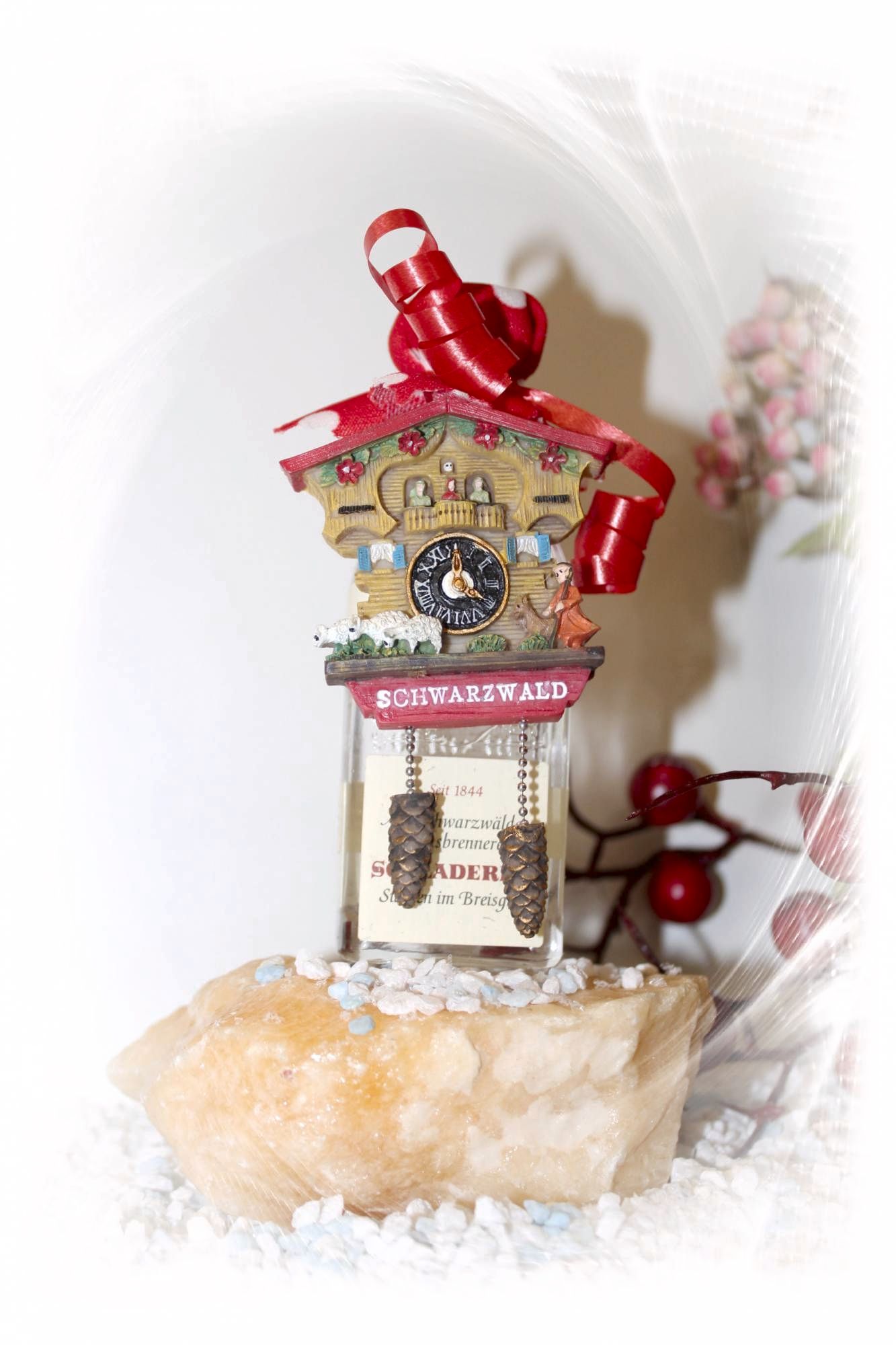 Hier bieten wir Ihnen eine schöne Miniaturflasche aus der Schwarzwaldbrennerei Schladerer mit einer Miniatur Kuckucksuhr an.